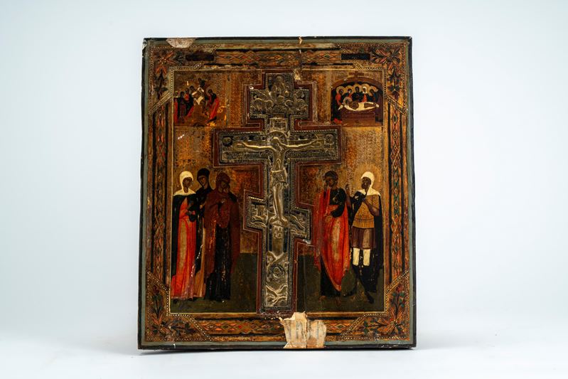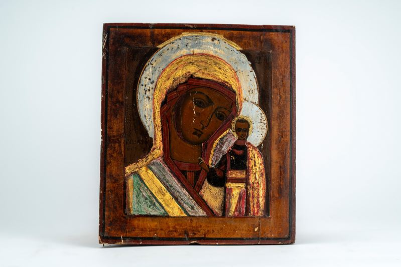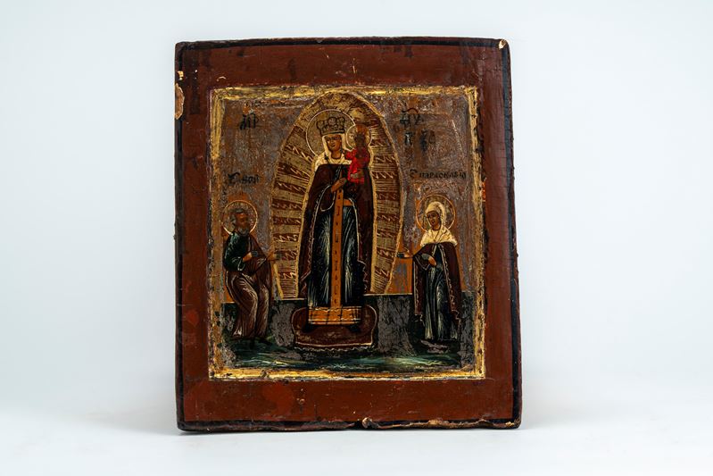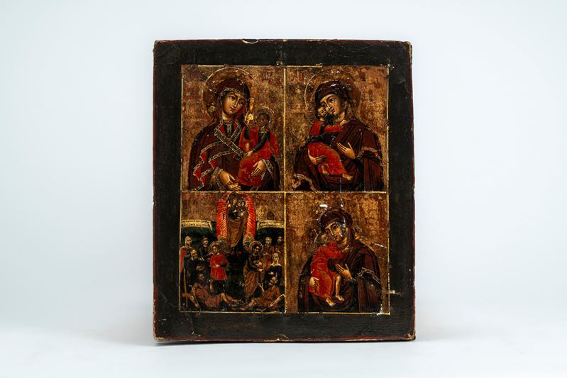 Four panel icons: a staurotheke, a Madonna of Kazan, a quadripartite Marian icon, and one depicting the apparition of the Virgin to Saint Peter the Apostle and Saint Paraskeva, Russia, late 19th century