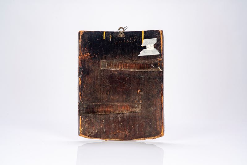 Saint Demetrius is shown on horseback, wearing armor and a cloak, thrusting his long lance against the Bulgarian king Kaloyan, who falls into an abyss together with his white steed. The episode refers to a legend according to which Demetrius of Thessaloniki, one of the most venerated warrior saints of the Byzantine world, who lived in the 4th century, miraculously appeared during the siege of Thessaloniki by Kaloyan (1207), defeating him with his spear. This iconography, similar to that of Saint George slaying the dragon — symbol of the victory over evil — spread throughout the Byzantine world between the 13th and 14th centuries, and appeared in Russian painting from the 16th century.