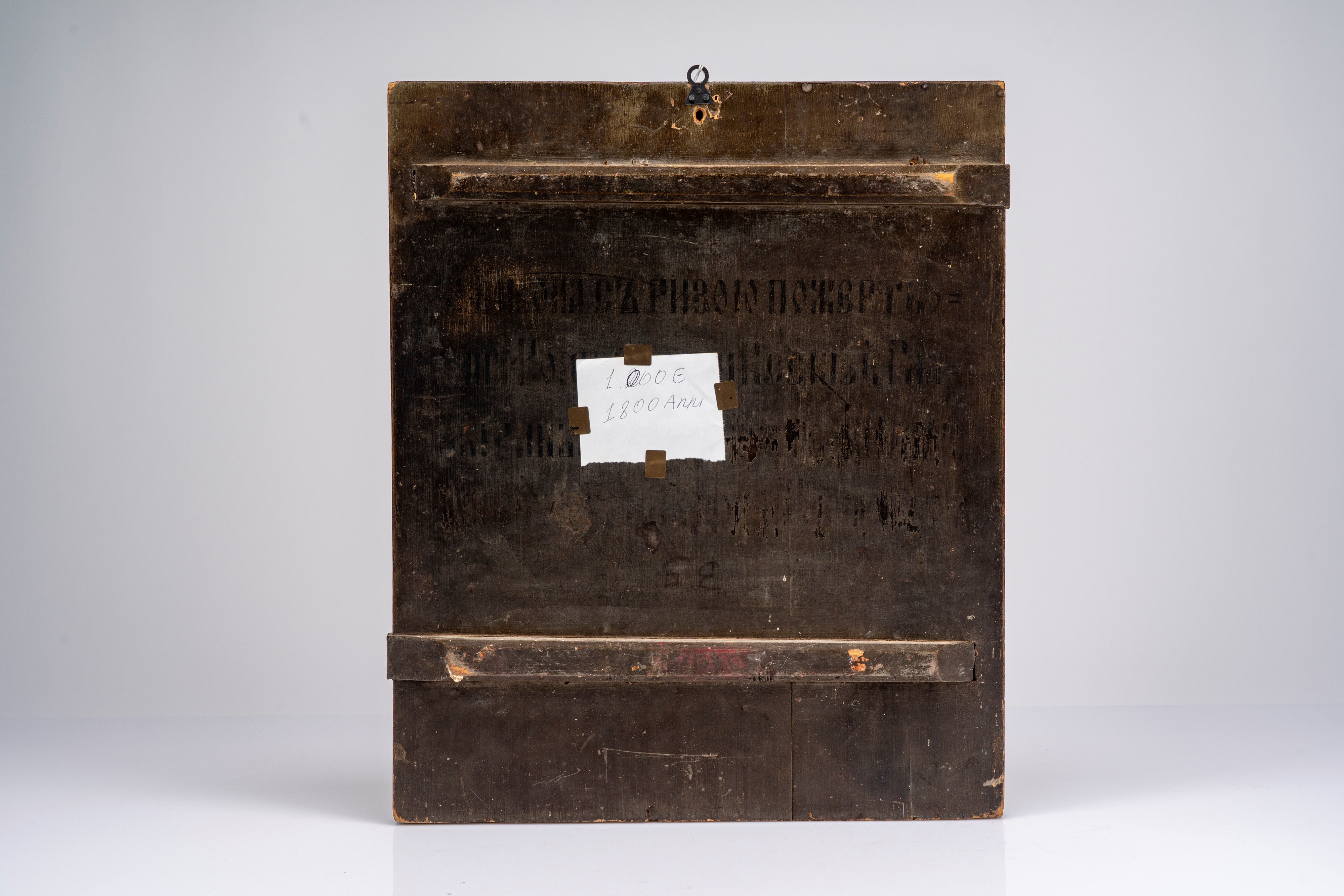 Staurotheke panel icon in tempera and gold ground with an eight-pointed Orthodox cross in metal and polychrome enamels depicting Christ Crucified among saints, Russia, late 19th – early 20th century