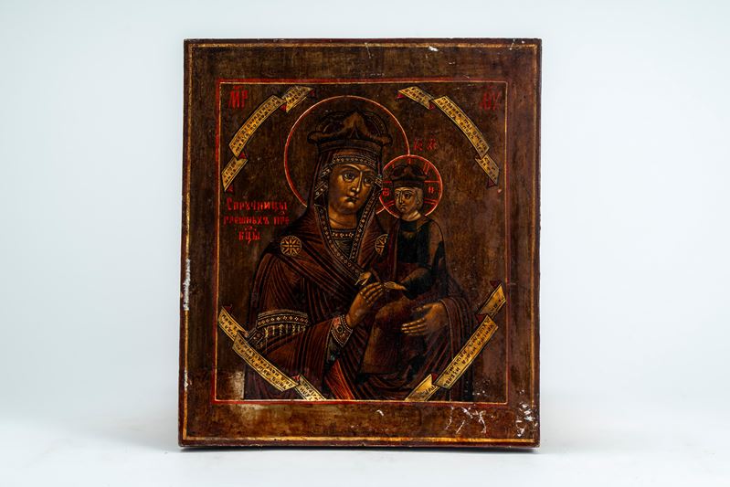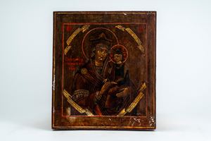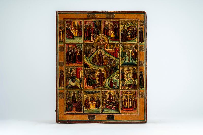Three panel icons depicting the Twelve Great Feasts, the Mother of God of Kazan, and the Mother of God of Iviron. Russia, late 19th century