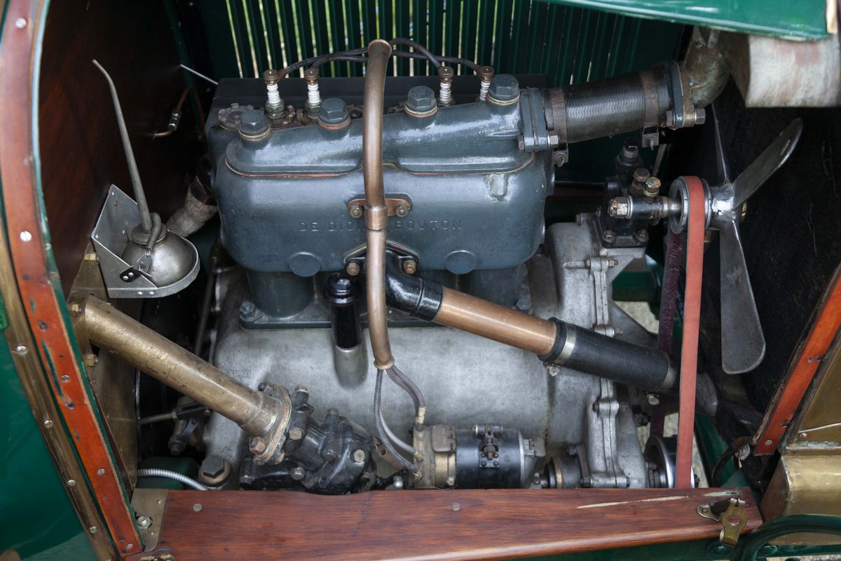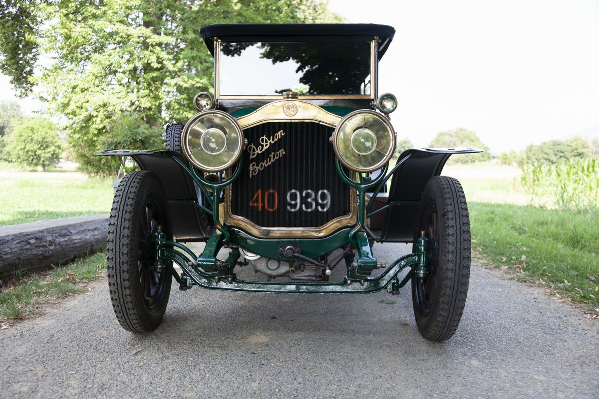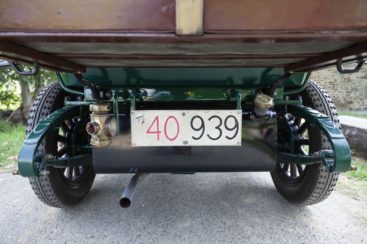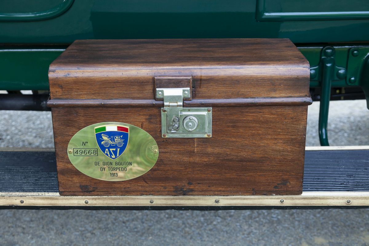 The De Dion-Bouton DY, chassis no. 189 is a 1913 car. In that very year, De Dion-Bouton was probably the largest vehicles manufacturer worldwide and, gradually, the customers showed to desire bigger and more refined cars. Only one De Dion-Bouton passenger car used a 2-cylinder engine yet, all the others were mostly four-cylinders in a wide displacement range, plus a V-8. In 1913, the 4 cylinder models were the following: DX, DW4, DY, DZ/EA, EB/EB2/EI. The De Dion-Bouton DY, chassis no. 189 is a Torpedo bodied car, powered by a 2,4 litre four-cylinder side valve engine. It’s a right-hand drive, as every motor cars in those years. Finished in green with black fenders, has the original varnished wooden rims and correct high quality reproduction Michelin tyres. It has black leather interiors and a new black cloth top. Suspensions are live axle front and rear with semi-elliptical front springs, 3/4 elliptical rear springs and drum rear wheel brakes. No front brakes. The car is still fitted with its rare original Blériot acetylene headlights. In 1897, Louis Blériot, a pioneer of the French aviation and the first flyer of the English Channel, created a company that produced lamps for cars. His first patent, filed in 1897, concerns the creation of acetylene headlights. With this totally new lighting, night driving became actually possible for the first time. Blériot and his team constantly improved their products and diversified their range with new, often revolutionary, patents. This attention to detail perfectly matches the De Dion-Bouton philosophy, which benefits from the results obtained to further enhance vehicle safety for its customers. The 1913 De Dion-Bouton DY, chassis no. 189, was completely restored over the years, starting in the 60s. The last restoration took place in 2008. The engine conforms to the original, by type and year. The bodywork has been completely repainted. The details are precious and correct, by year and by model: from the trumpet horn into the right-hand side, to the acetylene generator, to the external leather and wooden trunks. The interiors have been partially redone with materials similar to the original. On the dashboard, an optional watch of the era. The car is fitted with the original crank starter, but also with an electric starter not foreseen at the time. As an expert told: “The performance will not be sparkling, but it should go on doing so forever”. A car known for the qualities of its engine, an example of a fabled marque from the earliest days of the motorisation, an elegant and restored tourer with versatile Torpedo body. A rewarding purchase under the most profitable period on the market, to buy an "ancêtre".
