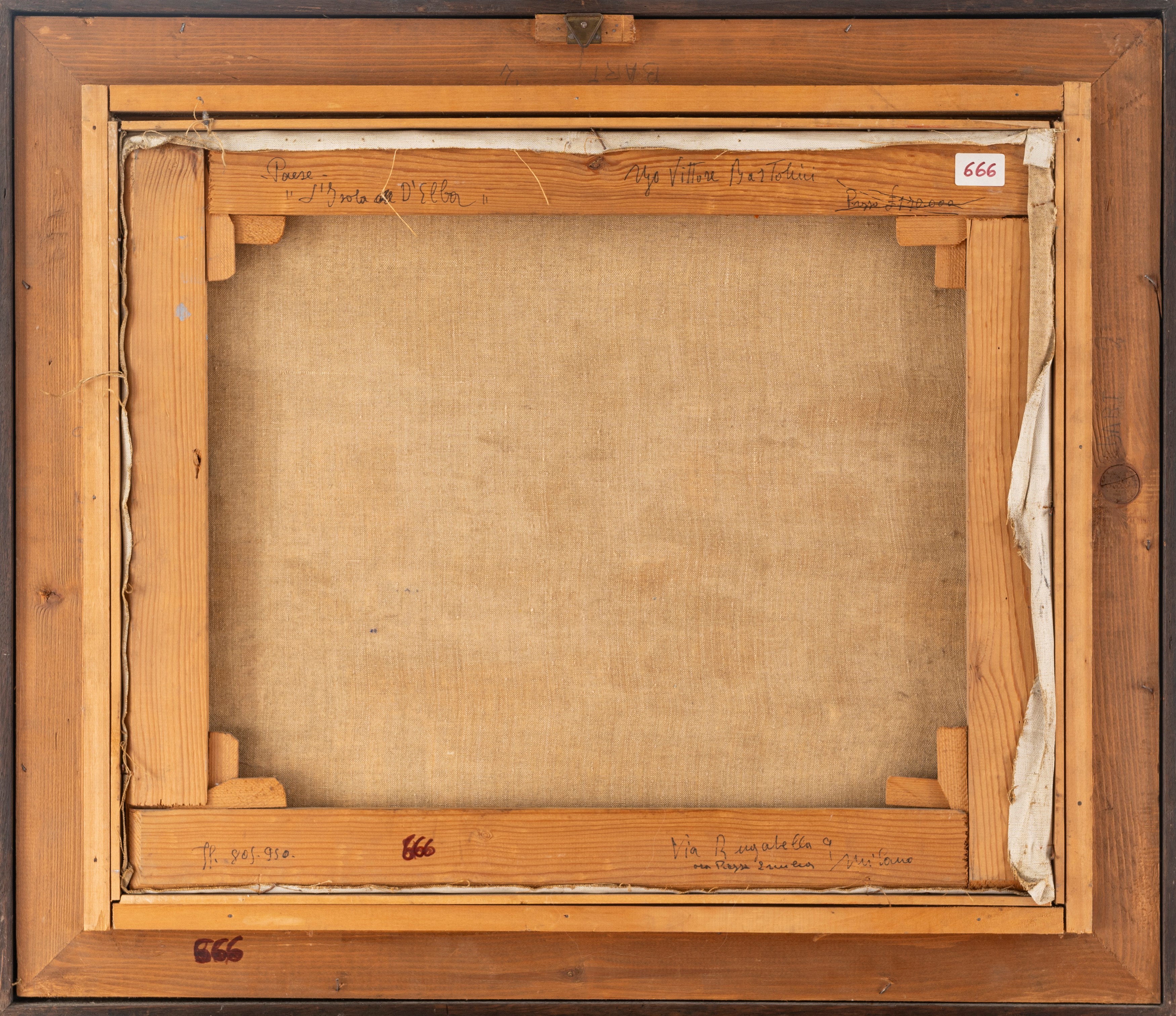 on the back, on the stretcher, title, price (£170,000 ), signature and address of the artist (Via Bagatella 9 / ora Piazza Emilia Milano )