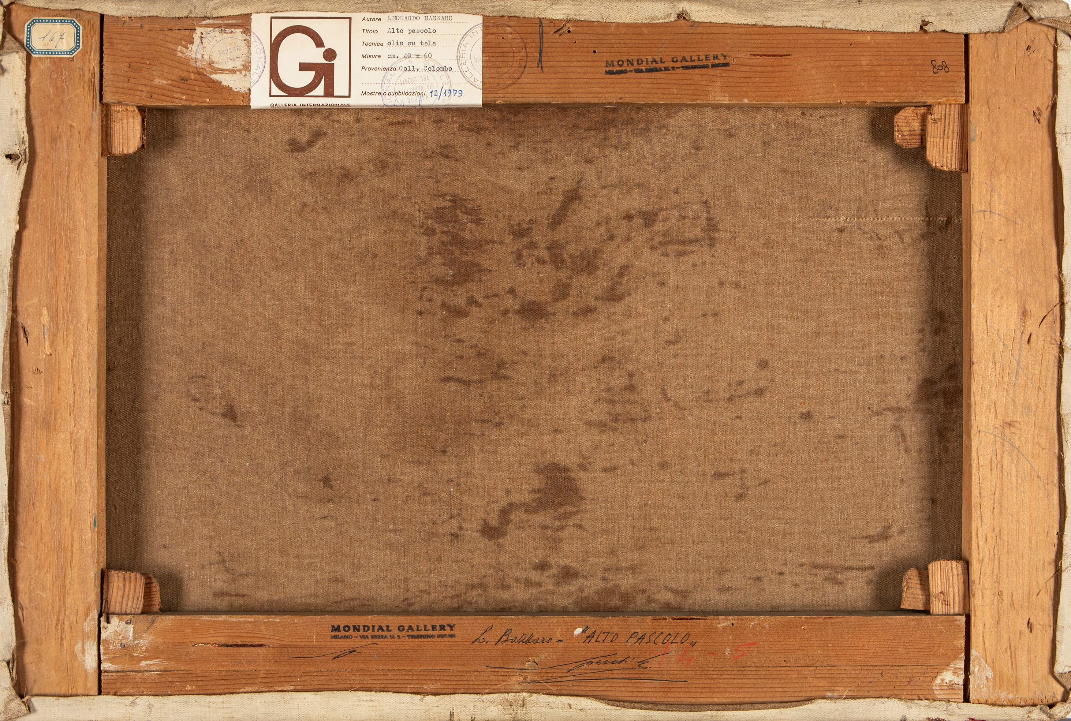 on the back, on the frame, label of the Galleria Internazionale di Varese with provenance (Colombo collection), stamps from the Mondial Gallery and old inventory label with number 167