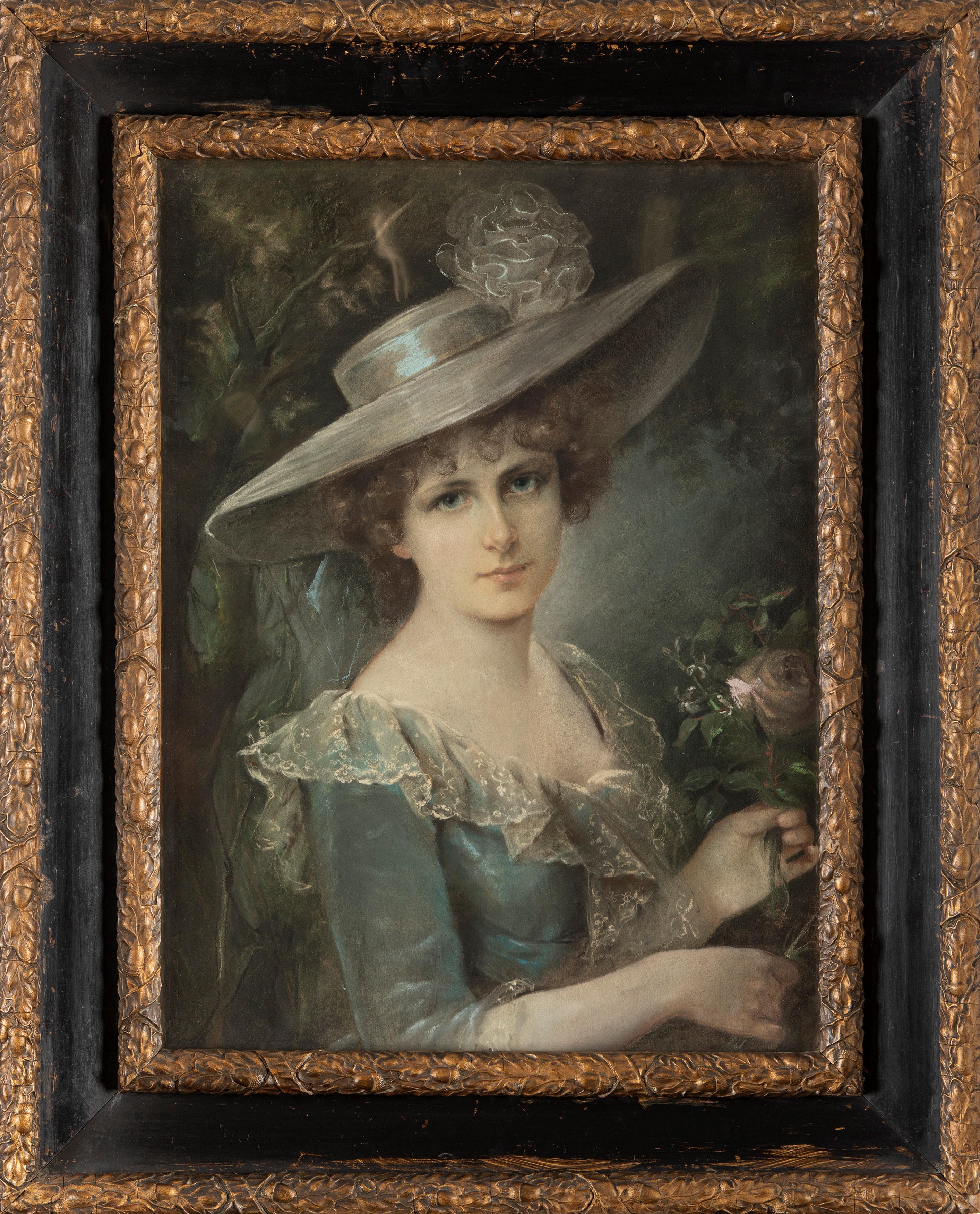 on the inside of the closing card, drawing depicting a female portrait in black chalk, signed and dated