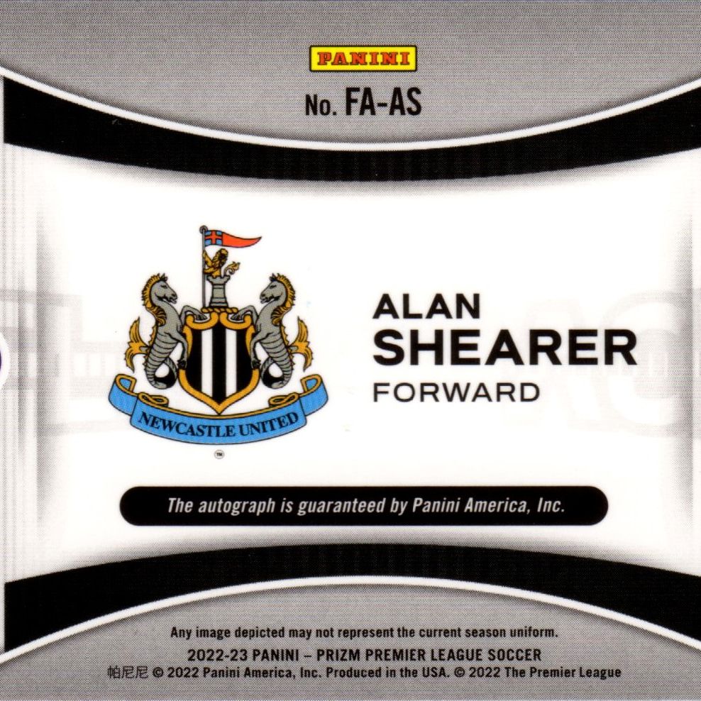 Card autographed by Alan Shearer, produced and certified by Panini America in 2022.