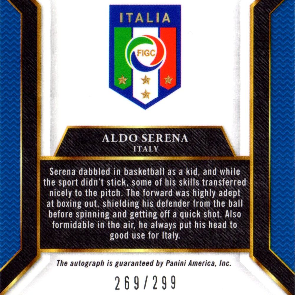 Card autographed by Aldo Serena, produced and certified by Panini America in 2017 with a print run of 269/299.