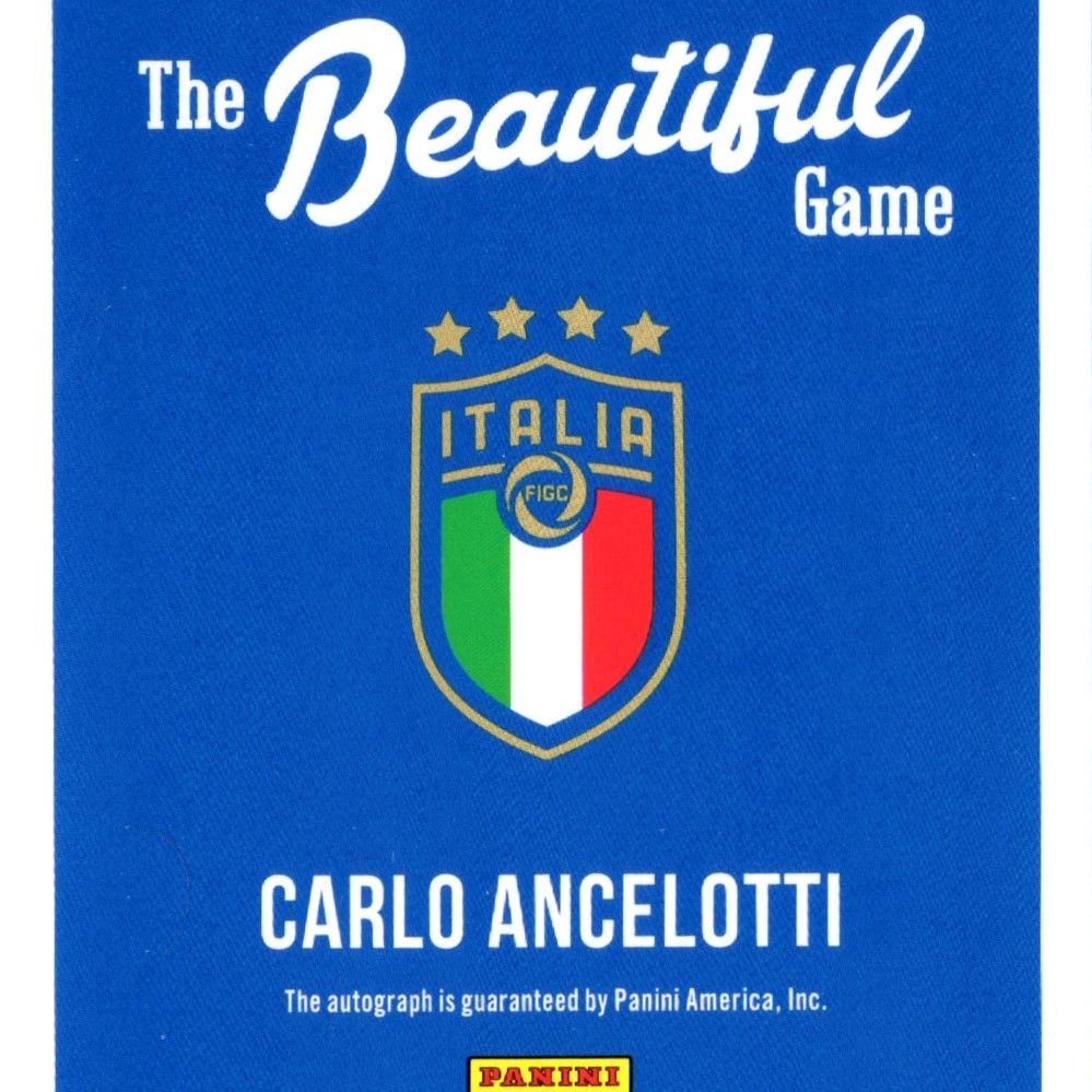 Card autographed by Carlo Ancelotti, produced and certified by Panini America in 2021.