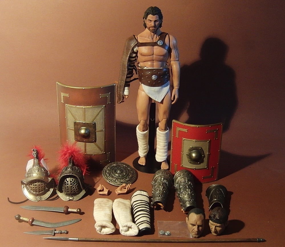 The Kaustic Plastik action figure is inspired by the Roman period and represents a "Gladiator School of Pompeii." Kaustic Plastik is the first Italian company to create 1/6 scale bodysuits and action figures inspired by historical figures of ancient Rome. This new company has quickly become a leader in the production of 1/6 scale bodies and historical dolls. The best in the world in the reproduction of historical dolls from the Roman period, it collaborates with archaeologists, allocating a portion of the proceeds to finance research and studies. The quality achieved by Kaustic Plastik is admirable. The helmets and tools are made of metal and crafted by an Italian craftsman. The cups and weapon handles are made of wood. Every detail is taken care of with the utmost care and the historical references are real. This fantastic limited edition of 400 pieces worldwide includes; three heads from previous editions, two gladiator helmets, various shields, and then; -Muscle Body KP03 - 3 Head Sculpts (2 are the re-release of our very first sculpts!!) - Myrmillo Helmet (Real Metal) - Thraex/Hoplomachus Helmet (Real Metal) - Leather Balteus/Belt - Large Scutum/Shield - Medium Scutum/Shield - Small Parmula/ Rounded Shield (Real Metal) - Leg Long Greaves/Armor x2 (Real Metal) - Leg Greave/Armor Myrmillo version (Real Metal) - Leg/Shin Padding - Subligaculum/Loin cloth - Gladius/Sword (Real Metal) - Sica/ Curved Sword (Real Metal) - Long Lance (Real Metal) - Dagger (Real Metal) - Padded Arm Sleeve - Leather Arm Sleeve (right arm)