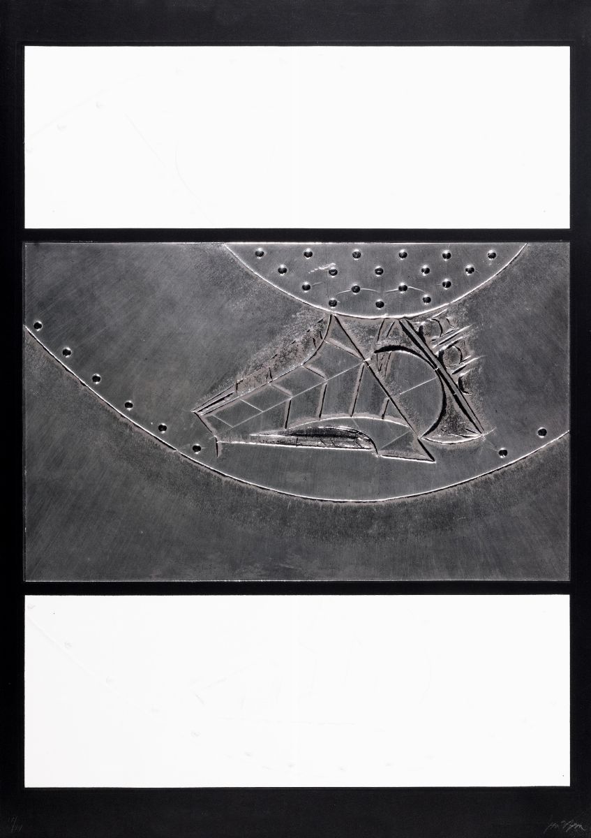 d )Silver composition with vertical line, lithography, intaglio and metal collage, numberedIX / XV cm 75 x 53(sheet size), (sc), signature in pencil lower right