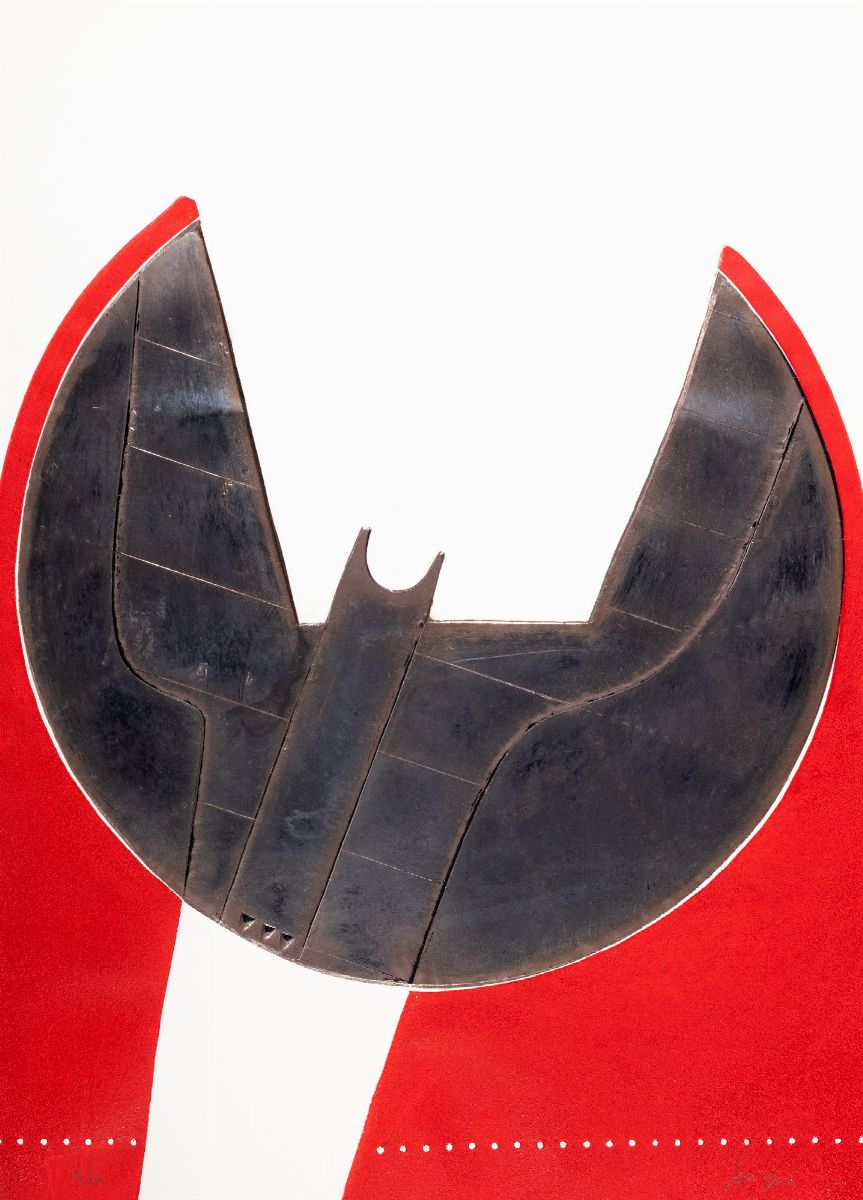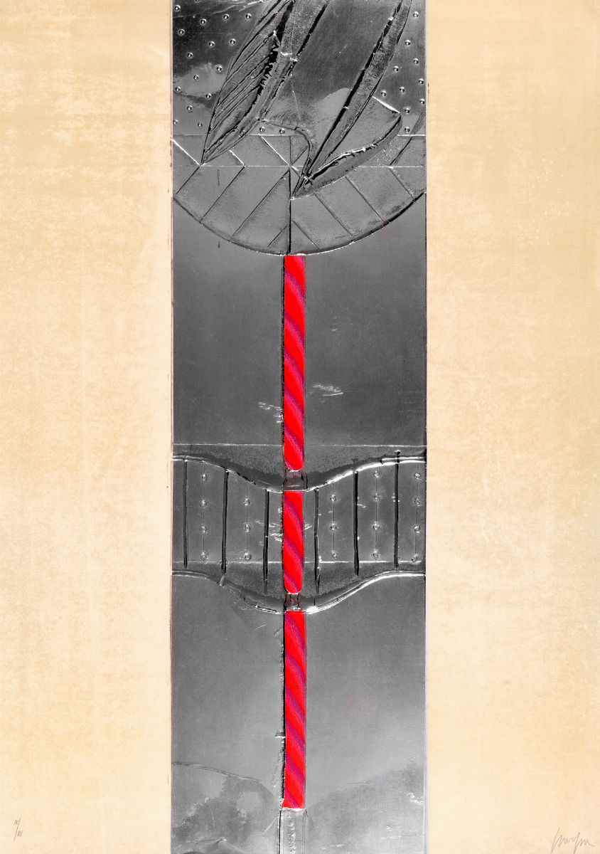e) Silver and red composition, litograph, intaglio and metal collage, numberedIX / XX cm 70 x 50 (sheet size) (sc), signature in pencil lower right lower left blind stamp of Publisher and Printer 2RC, Rome