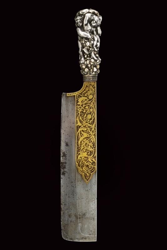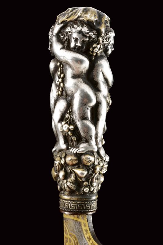 Wide, single-edged blade strongly tapered at the base, finely engraved and gilded with floral and geometrical motifs on both sides, and with marks. Silver handle consisting of a sculptural block depicting four angels with fruits and flowers, pommel with a wolf's head. Ring-nut with a fret. Rare.