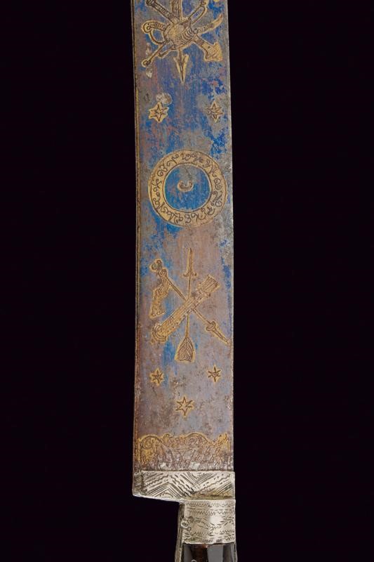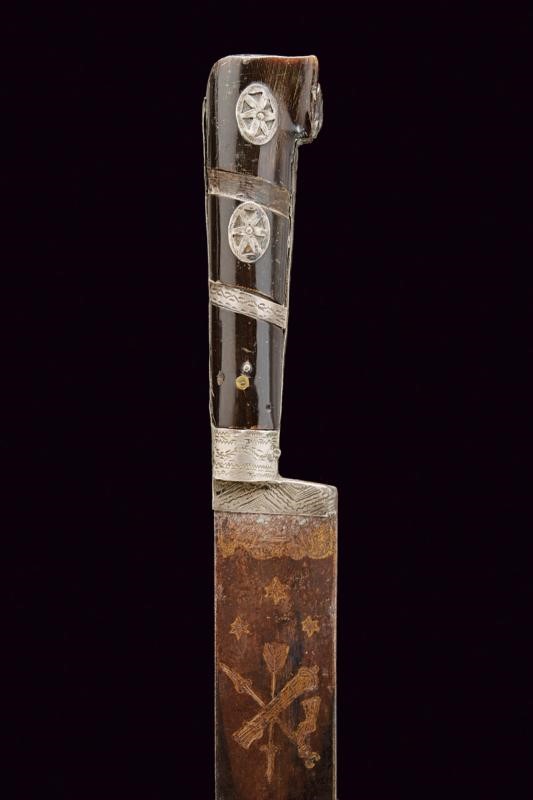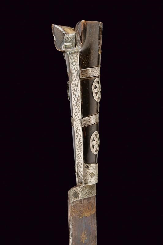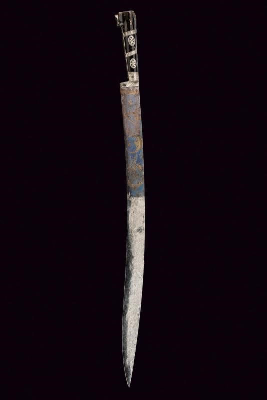 Slightly curved blade, the forte with remains of finishing and engravings depicting trophies, cabalistic symbols, stars, an anthropomorphic figure and an arm with a sword, all with remains of gilding. Silver-colored metal ring-nut. Dark horn grips with solver-colored metal bands. Decorated with bands and pierced plates (two missing elements). Small ears.