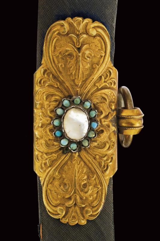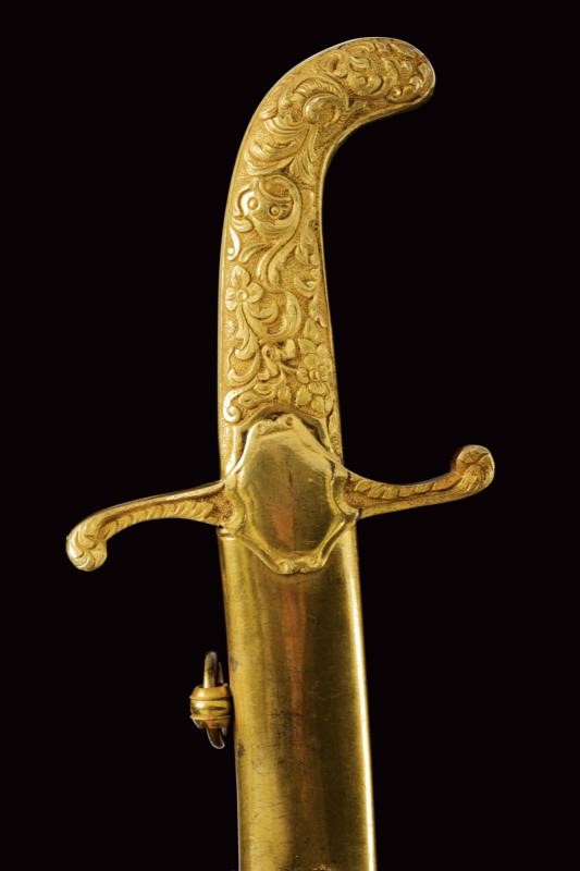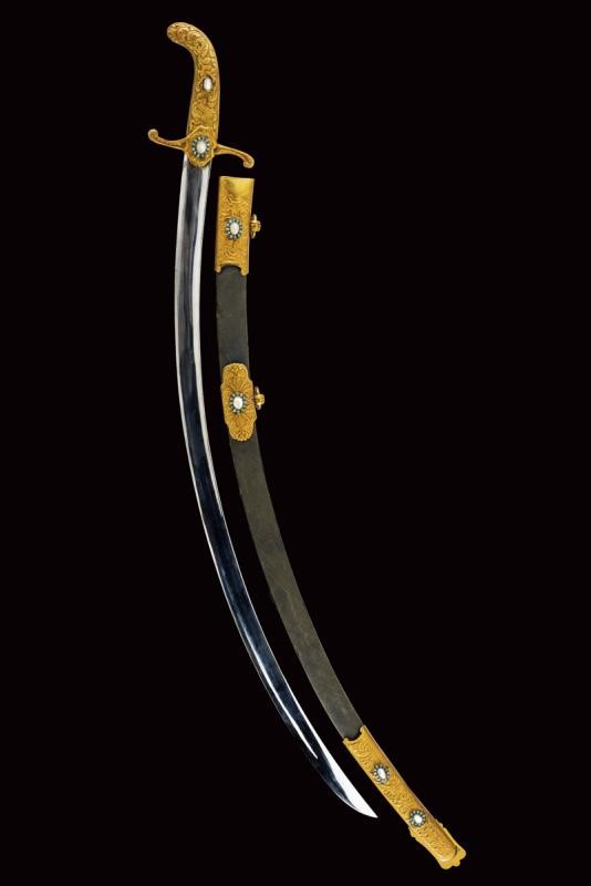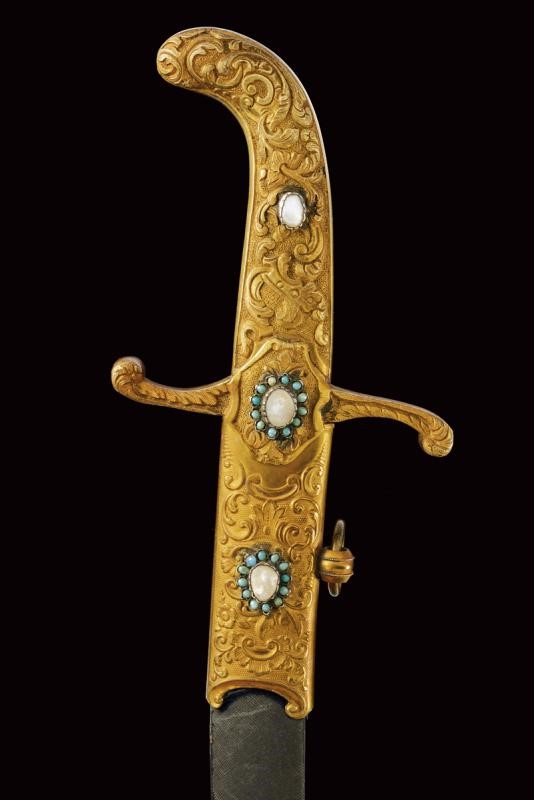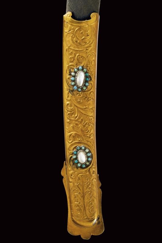 Curved, single-edged blade with central fuller. Solid, brass hilt made of gilded brass and finely engraved with floral motifs in bas relief on a granulated background and decorated with turquoises and mother-of-pearl cabochon. Wooden scabbard with grey-velvet covering (completely worn) and with gilded-brass mounts decorated en suite. Two suspension rings.