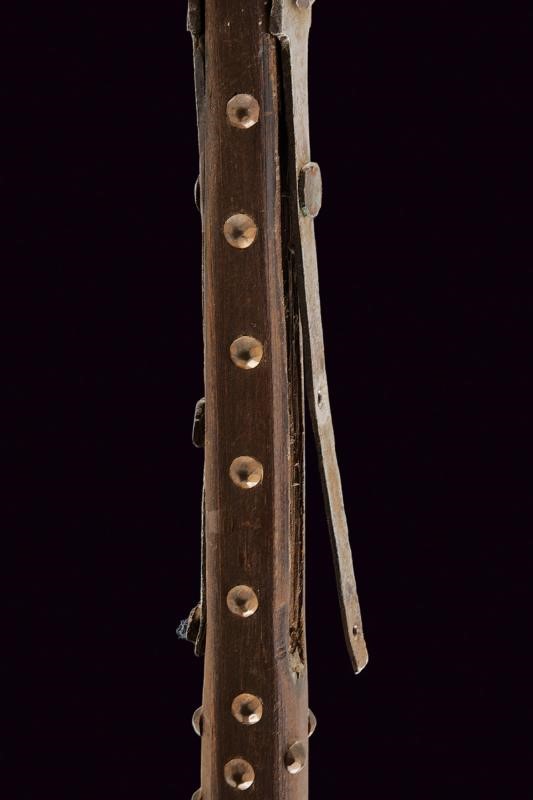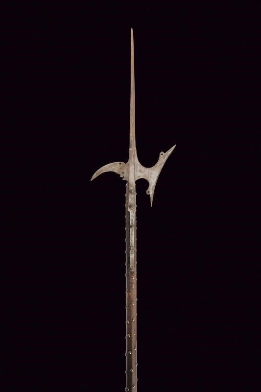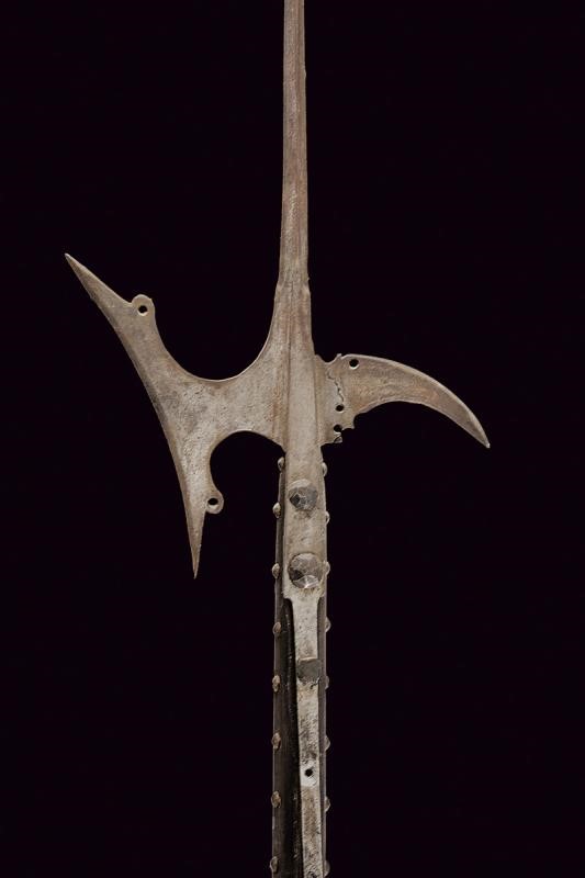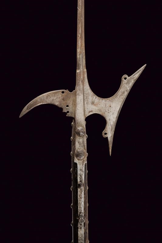 Spearhead with cusp of lozenge section, hollow axe with pierced lugs, beak strongly curved downwards and provided with enlarged cusp. Medium-length straps with rivets (coeval?) provided with large head (some missing). On a wooden shaft (later) decorated with small studs.
