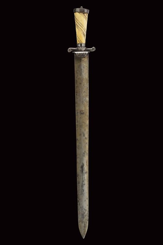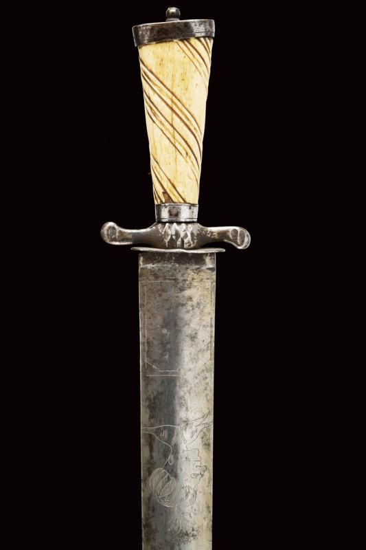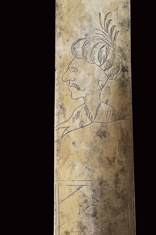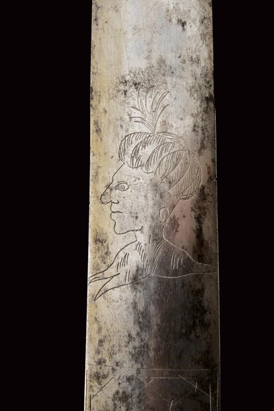 Wide, straight, double-edged blade of lenticular section, engraved with a Turkish man's head at the forte, on both sides, and remains of a net decoration at the base. Iron hilt. Small valve decorated with shelled lozenges, quillon worked en suite. Deer-horn handle carved with spirals. Iron cap.