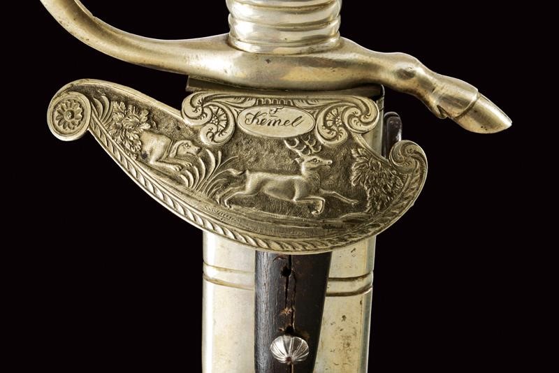 Straight, single-and short-false-edged blade, with fuller, remains of bluing on more than half of its length and a hunting rhyme, depicting also a deer and a wild boar; badges and inscriptions with remains of gilding. Pewter-colored, metal hilt. Asymmetrical valve depicting a hunting scene in bas relief and the writing "F Kemel". Parry quillon and guard ending in hoof. Handle with polished, deer-horn grips, provided with three studs. Leather scabbard (signs of use and time) provided with a compartment for a knife (pertinent?). Pewter-colored metal mounts, cap with acorn-shaped button.