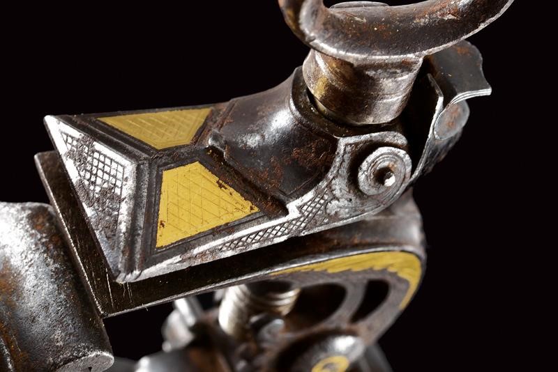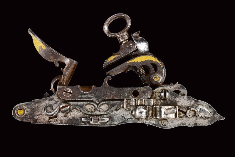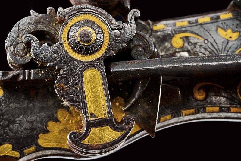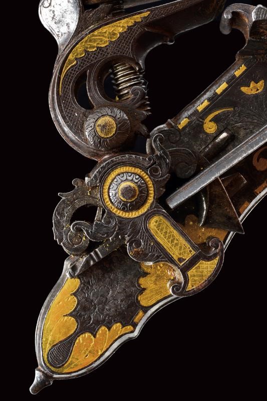 Flat lock plate with recessed frame and small, carved tang. The surface finely engraved with floral motifs and partially decorated with gold on a browned ground. Finely carved cock, engraved and partially gilded with floral motifs, browned. Carved springs, batterie and pan decorated en suite. Gilding with minor missing parts. Provided with anti-friction and sealing systems. Rare.