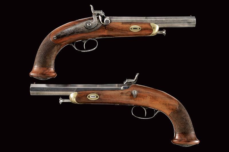 A pair of percussion pistols by Merolla, Mid 19th Century