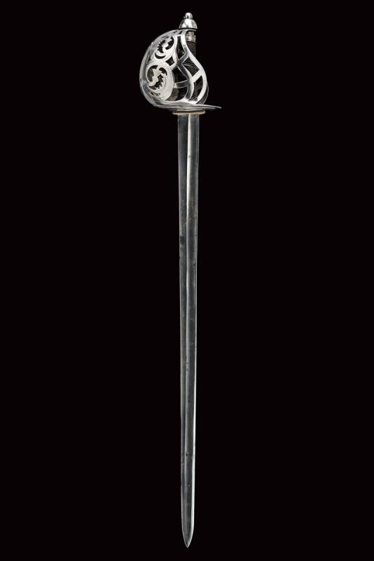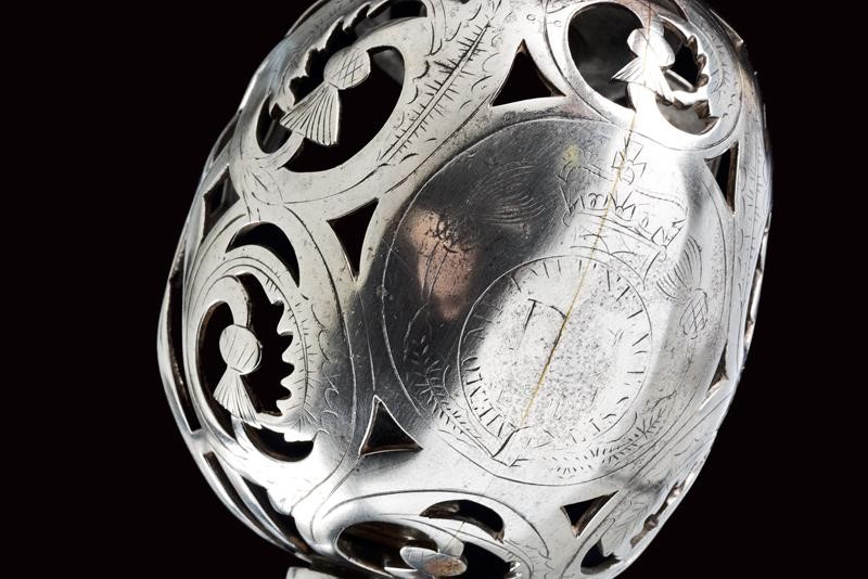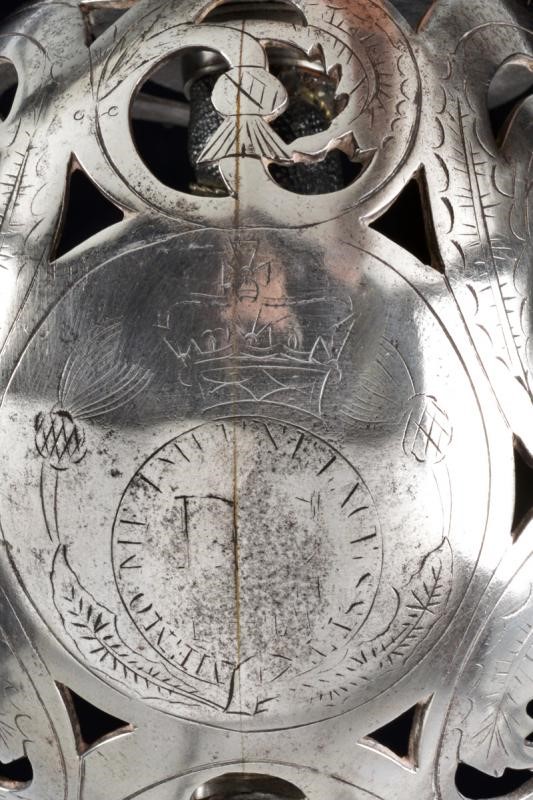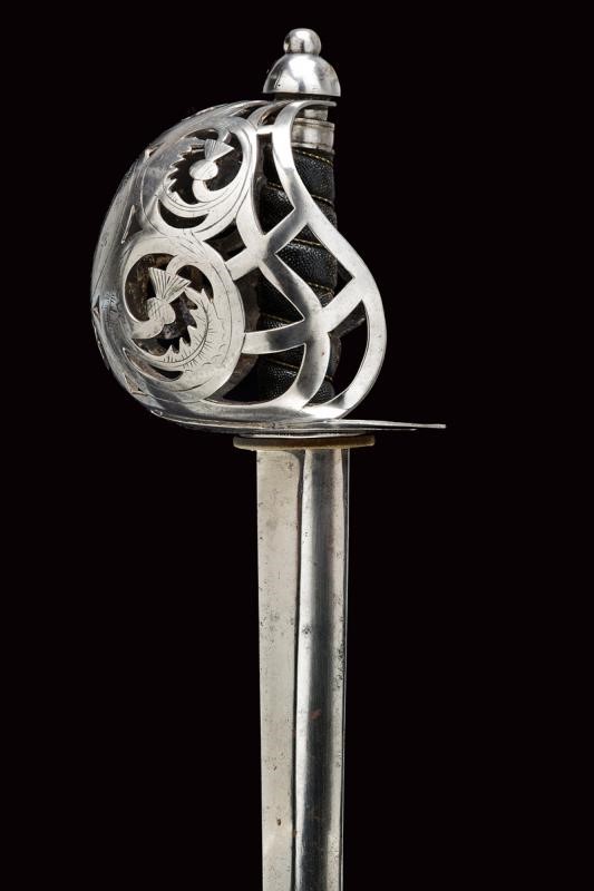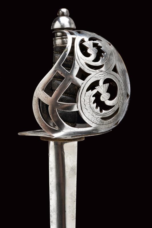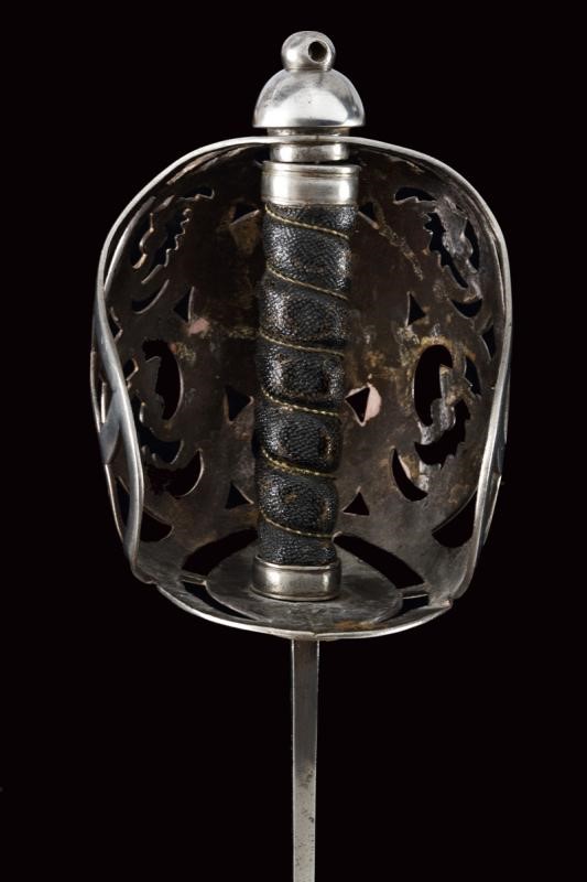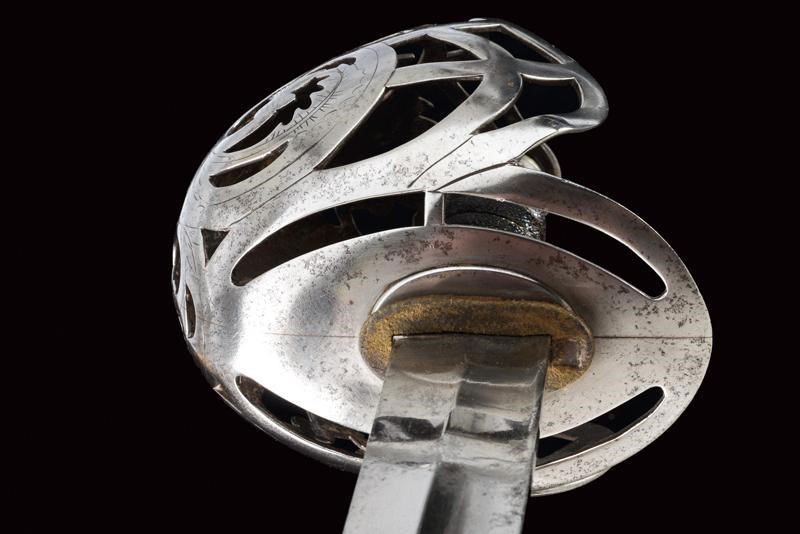 Wide, single-and false-edged blade with wide fuller. Basket-shaped hilt with flattened bars and consisting of two halves, the central part featuring the Regimental coat of arms with motto, hemispherical pommel with pierced button, wooden hilt with fish-skin covering.