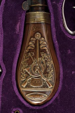 Smoothbore, octagonal barrels, richly gold inlaid and marked "CANON TORDU" among floral motifs, sights surrounded by thunderbolts, 17 mm cal. at the nozzle. Engraved tangs and provided with fixed moulded sight. Forward spring locks, one signed "MANUFACTURE" and the other "DE VERSAILLE", outlined borders, hammers engraved with floral motifs. Wooden full stocks with light pitting, finely checkered butts. Beautiful silver mounts engraved with geometric motifs and stamps. Silver-tipped horn ramrods with iron cartridge extractors. In wooden box lined with green velvet and with all tools and key.