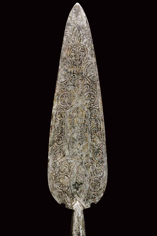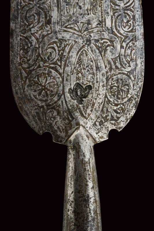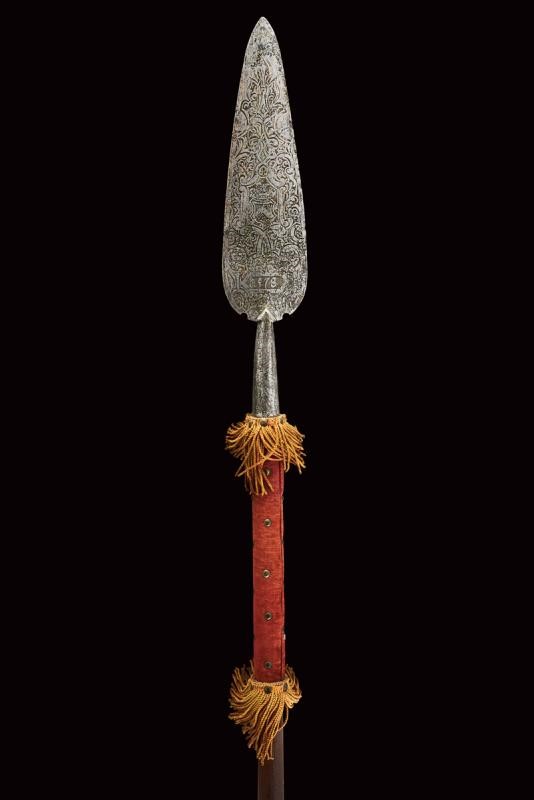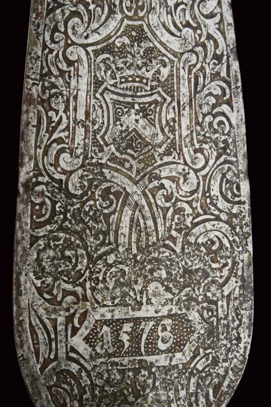 Flat, leaf-shaped, double-edged cusp with small concave carving at the base, one side featuring a nobleman's coat-of-arms and date '1578' on a dark, granulated background and among racemes on the surface. The other side featuring a noble hunter wearing a 16th-century dress with his hound on a dark, granulated background and among racemes. TA deep mark at the base. Smooth ferrule shaped as a truncated cone.. On a cylindrical wooden shaft (later) with red velvet covering and two tassels at the top.