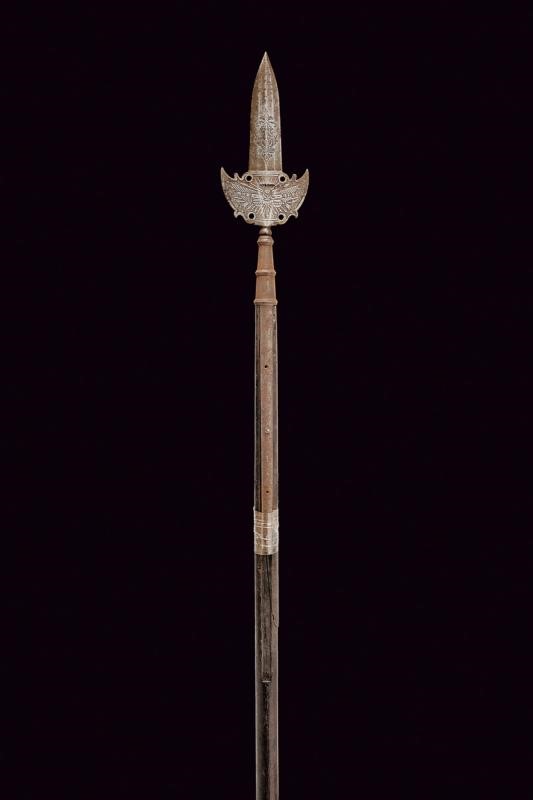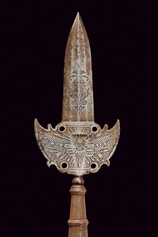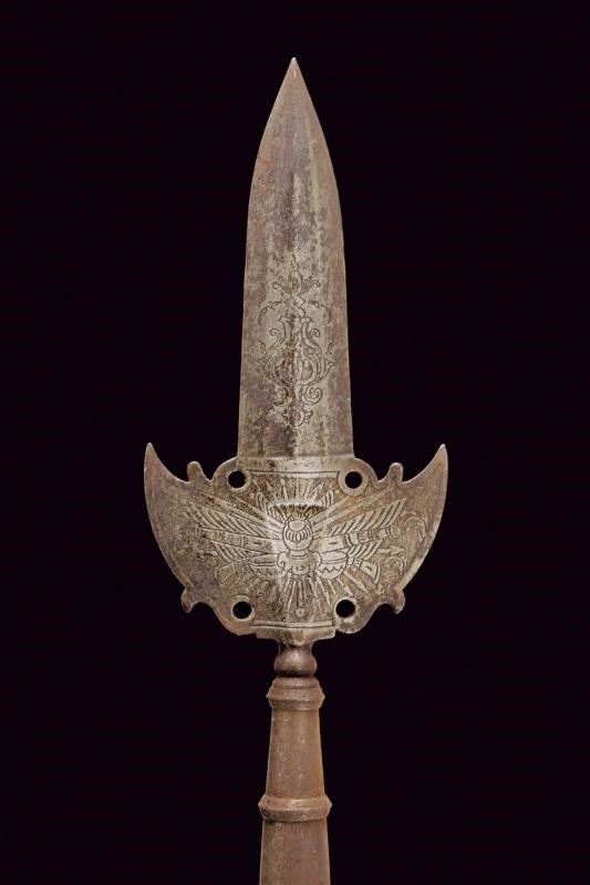 Made of iron, with double-edged cusp featuring a double groove and floral engravings, provided with wings at the base, holes and small clicks, engraved on both sides with a big trophy, remains of gilding. Ferrule shaped as a truncated cone with three rings, with small ribs (one shortened) on an original, wooden shaft (crack) and with iron chape.