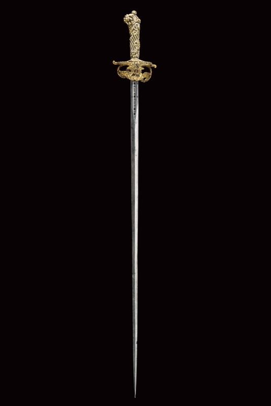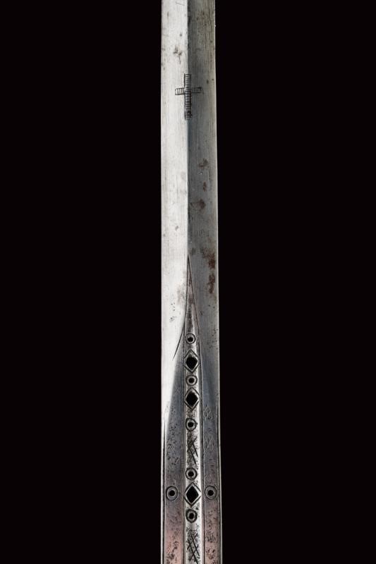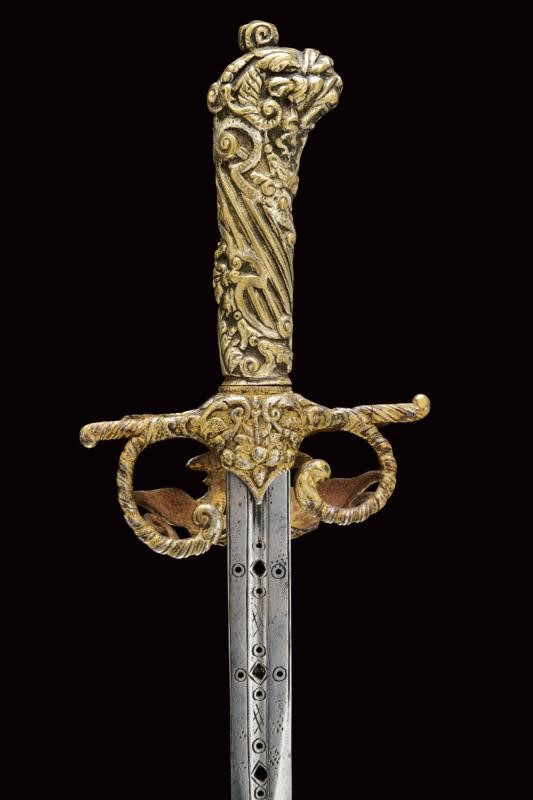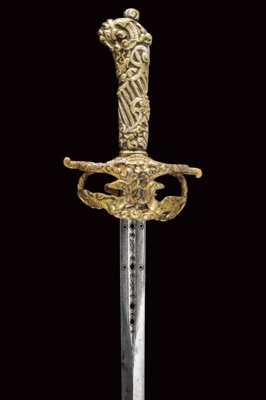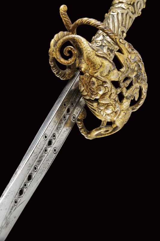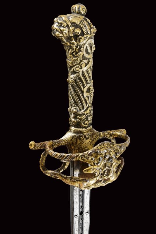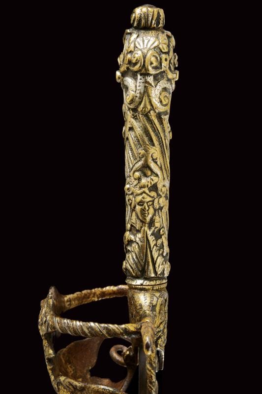 Straight, double-edged blade of lozenge section, the first part grooved, pierced and engraved with geometric motifs, then engraved with a cross on the right side. Provided with quillon and gilded iron lower ring-guard and silver-plated bronze grip. Short quillons and arches, the side ring with a beautiful mask, the lower ring-guard with two maritime monsters or dragons. Solid silver-plated bronze grip engraved with a face on the back, pommel with a horned monster's head and decorated with geometric and floral motifs.