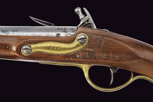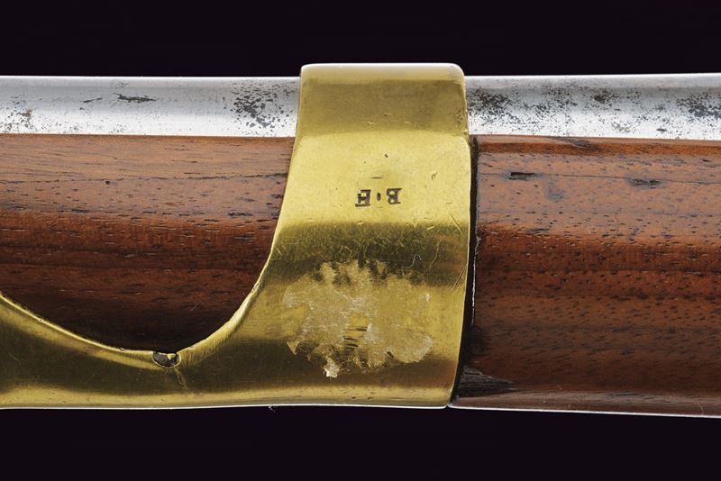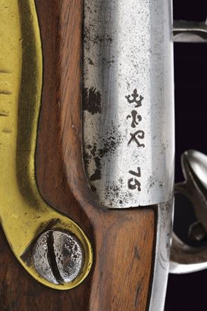 Round, smoothbore, 17 mm cal barrel; powder chamber with proof marks and numbered “75”; tang engraved with model. Flintlock with St. Etienne manufacturer’s signature and “HR” crowned stamp beneath. Full wooden stock in excellent condition, stamps behind the lockplate; brass mounts and iron ramrod.