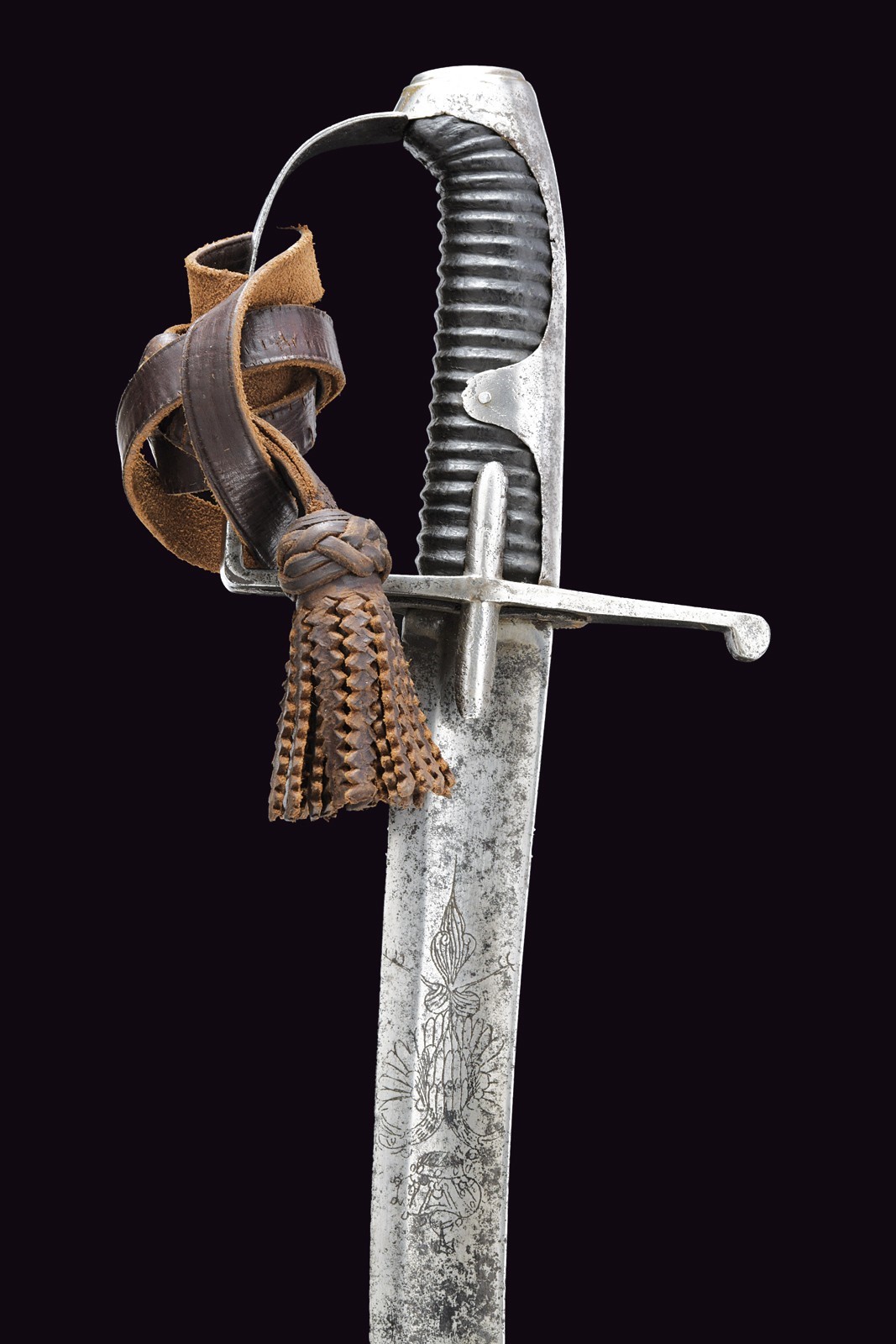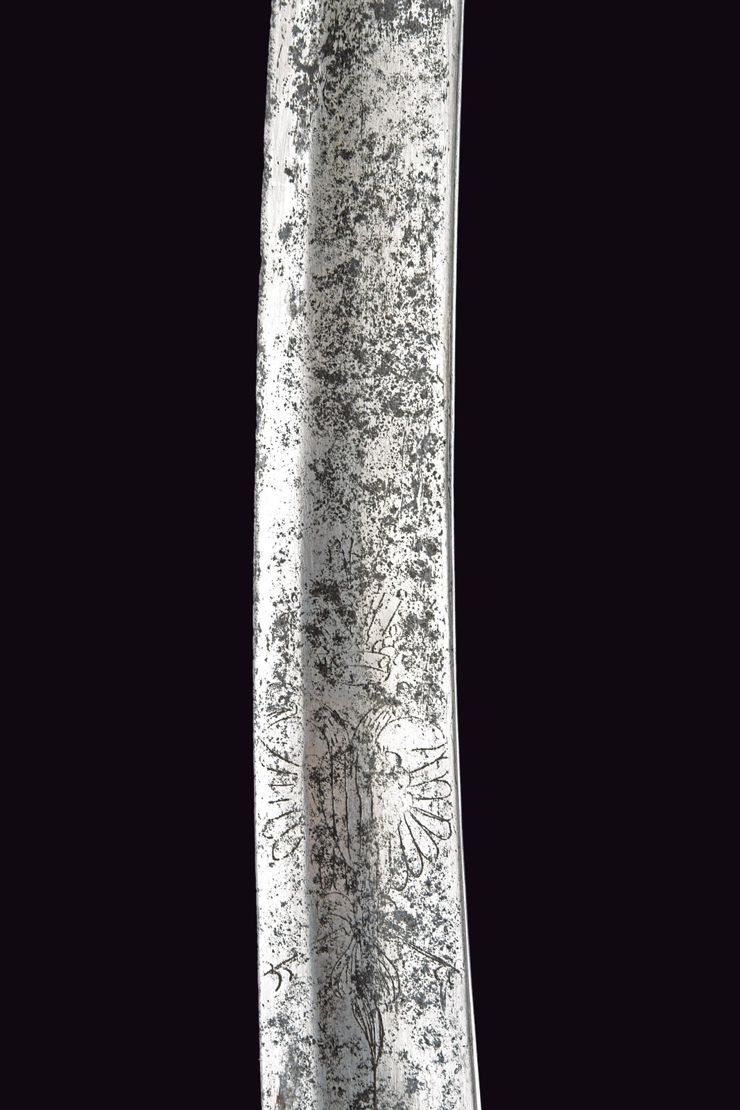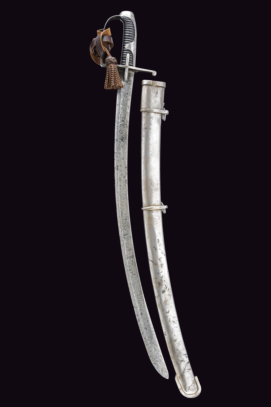 Wide, curved, single-and-false-edged blade with a wide fuller and tang, engraved at the base with a double eagle on both sides, featuring an incomplete mark "WeiZ..." on the back. Iron mounts with langets, a single loop guard and long cap. Wooden grip covered with leather, without wire binding. Imposing iron scabbard with two suspension rings on bands. Areas damaged by rust on both the sabre and scabbard, scabbard with restoration at the upper part. Leather sword knot.