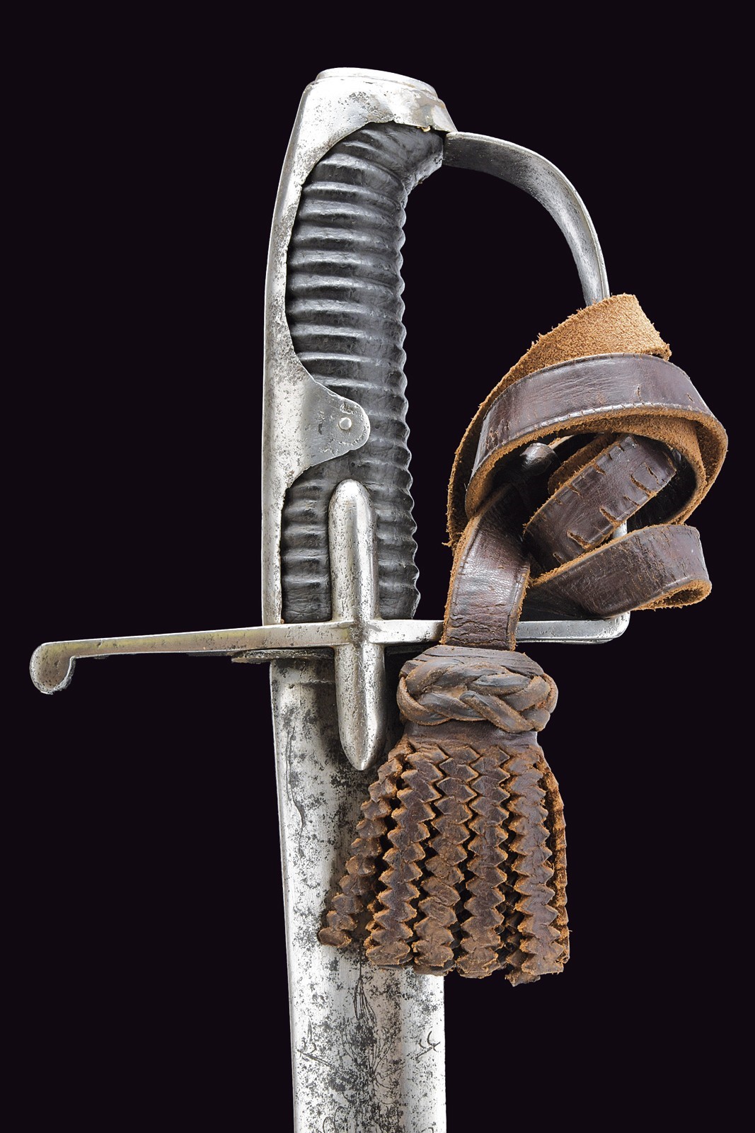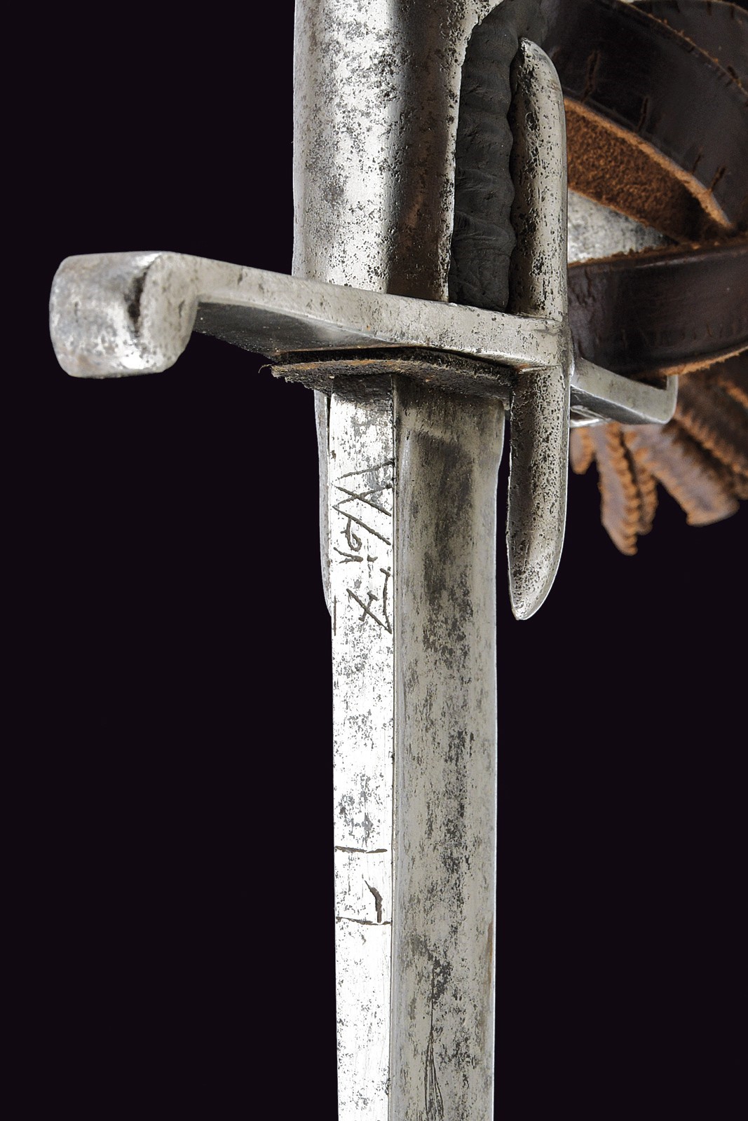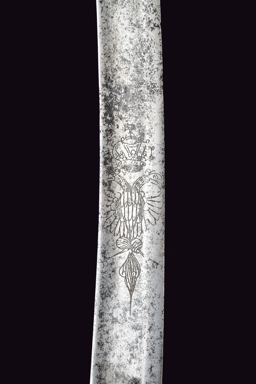 Wide, curved, single-and-false-edged blade with a wide fuller and tang, engraved at the base with a double eagle on both sides, featuring an incomplete mark "WeiZ..." on the back. Iron mounts with langets, a single loop guard and long cap. Wooden grip covered with leather, without wire binding. Imposing iron scabbard with two suspension rings on bands. Areas damaged by rust on both the sabre and scabbard, scabbard with restoration at the upper part. Leather sword knot.
