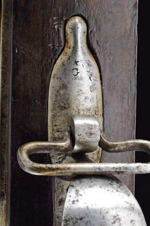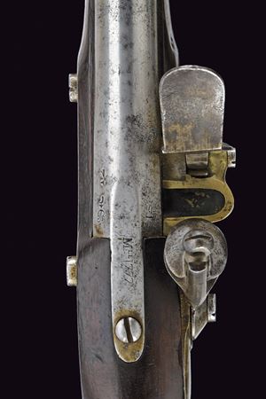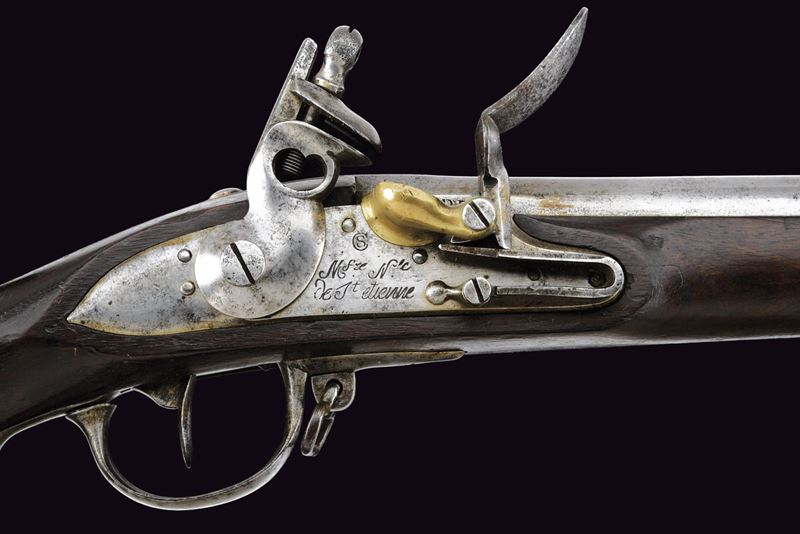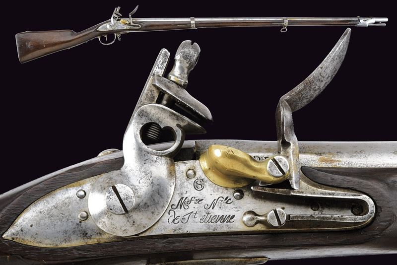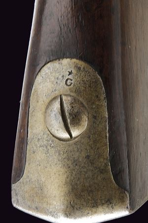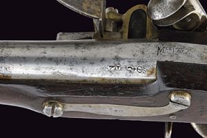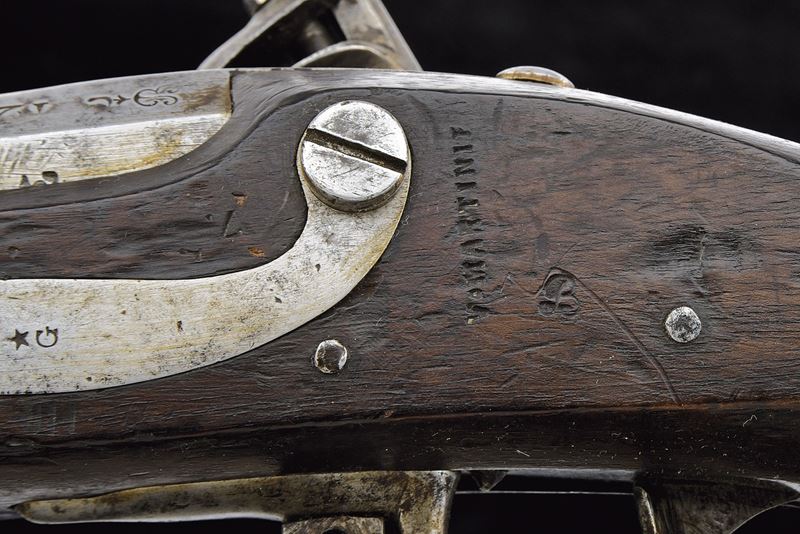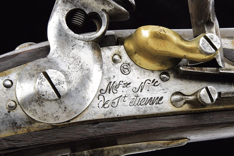 Round, smoothbore, 17 mm cal barrel with octagonal base marked with several marks, clutch for the bayonet. Tang marked with model name. Lock marked with St. Etienne national mark and ‘S’, brass pan. Wooden full stock, stamp on right side of the butt; iron mounts and ramrod.