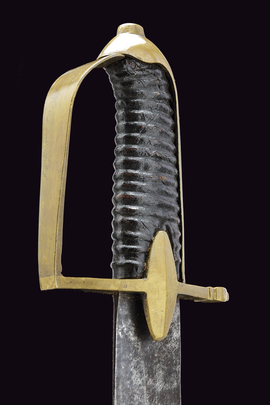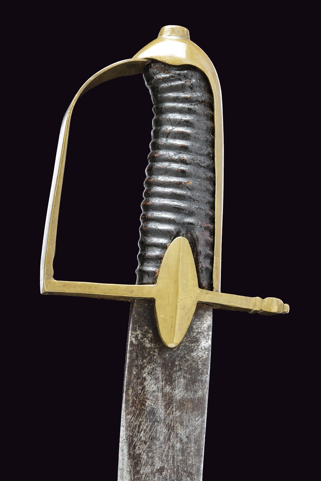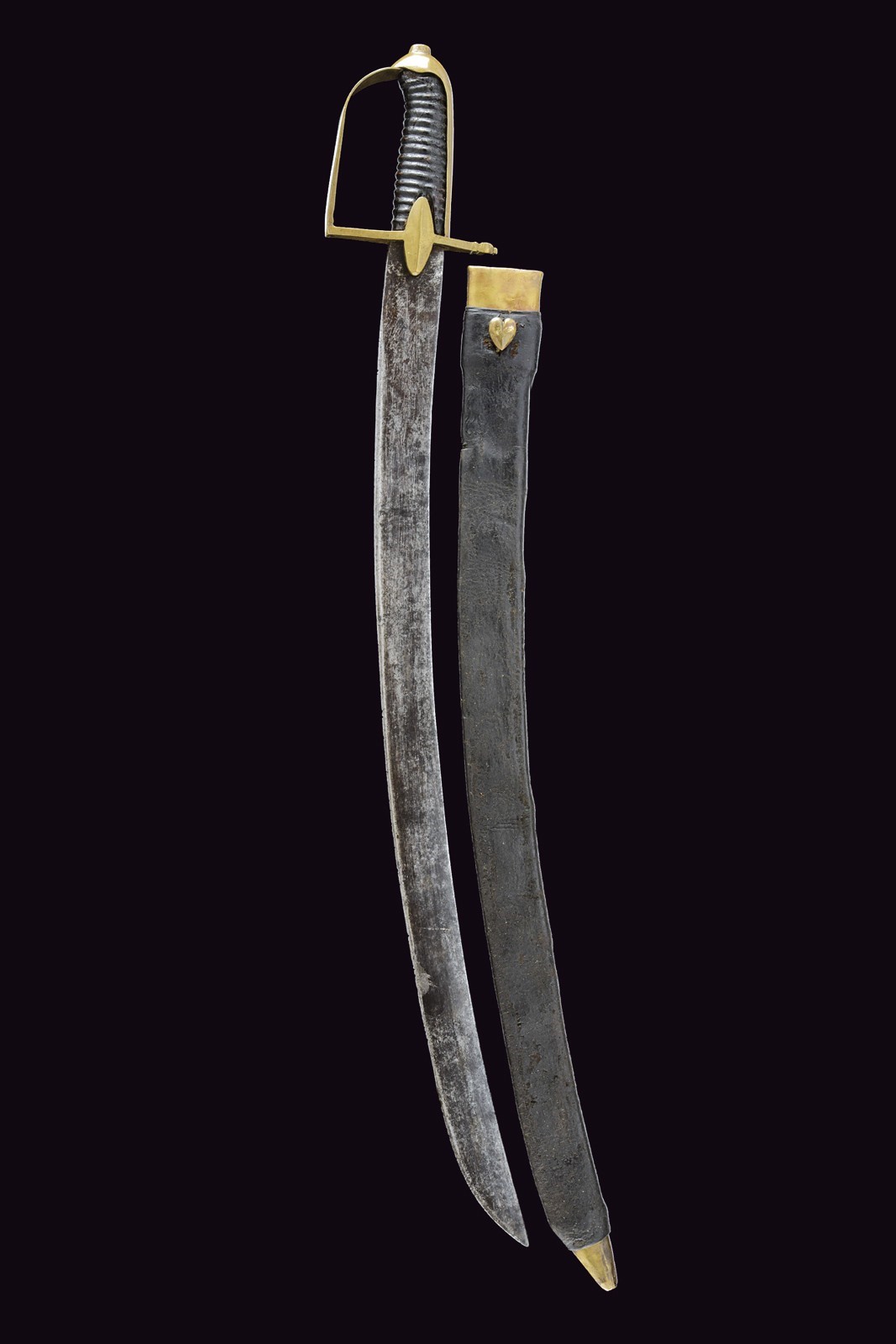 Wide, flat, slightly curved, single-and false-edged blade. Brass mounts with langets and a single loop guard, long smooth cap, wooden grip covered with leather and without wire binding. Leather scabbard with brass mounts, cap with a heart-shaped button.