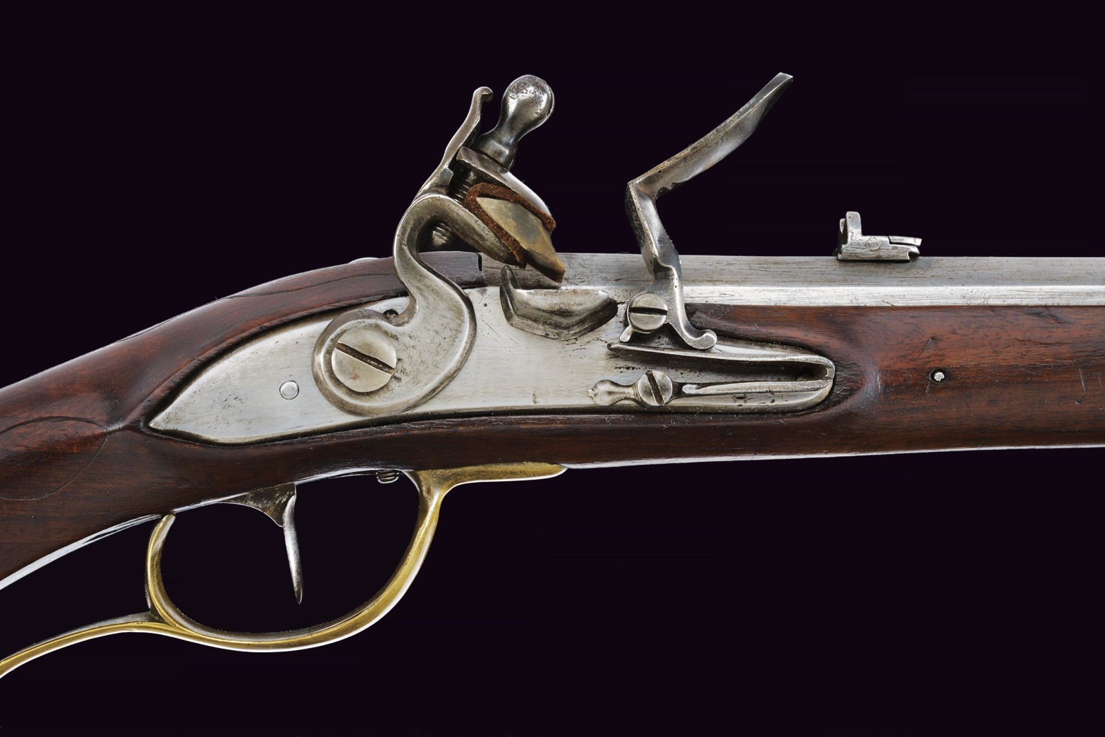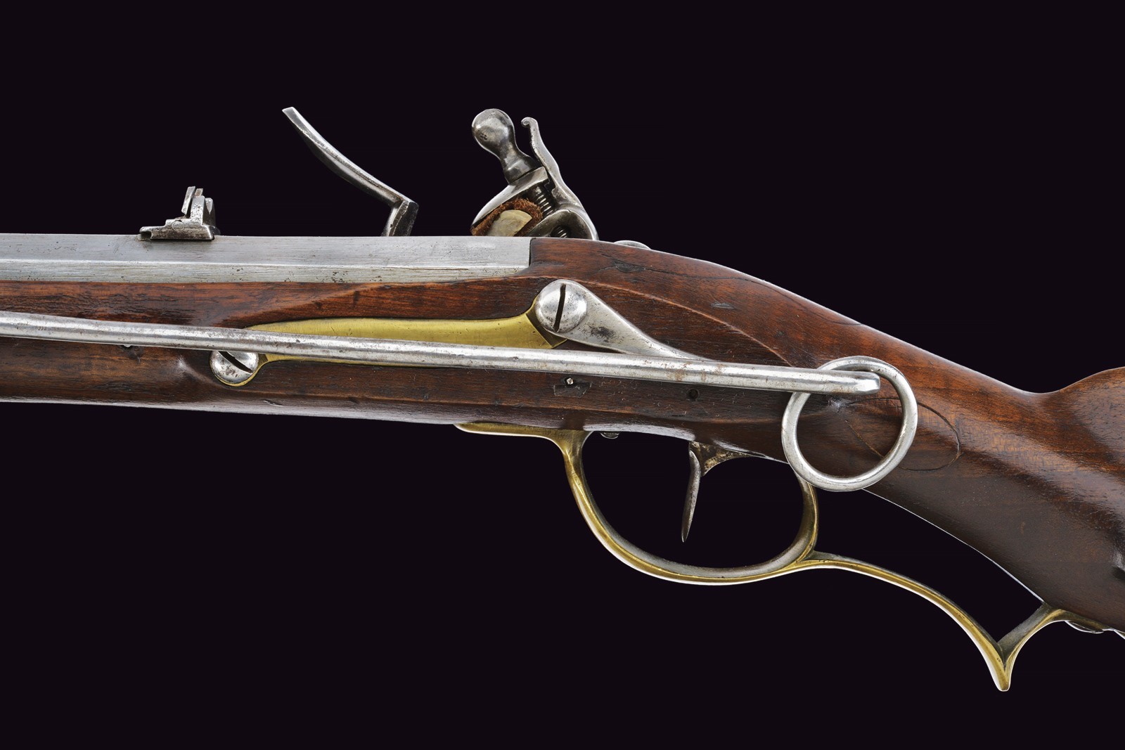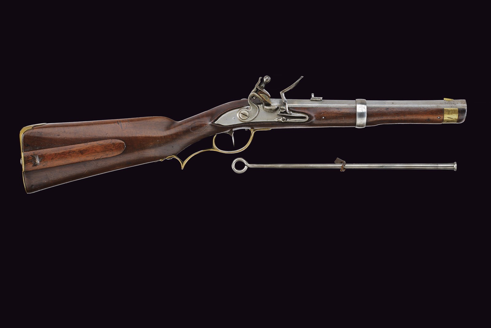 Rifled, 15 mm cal. barrel (bore with light pitting between the clearly visible grooves), octagonal, provided with iron rear sight and brass foresight. Short, smooth tang. Lock entirely of iron, two-snap working mechanism. Wooden full stock with patchbox. Brass mounts, shaft with iron sling swivel. Together with the rare iron ramrod provided with a leather string. Very rare.