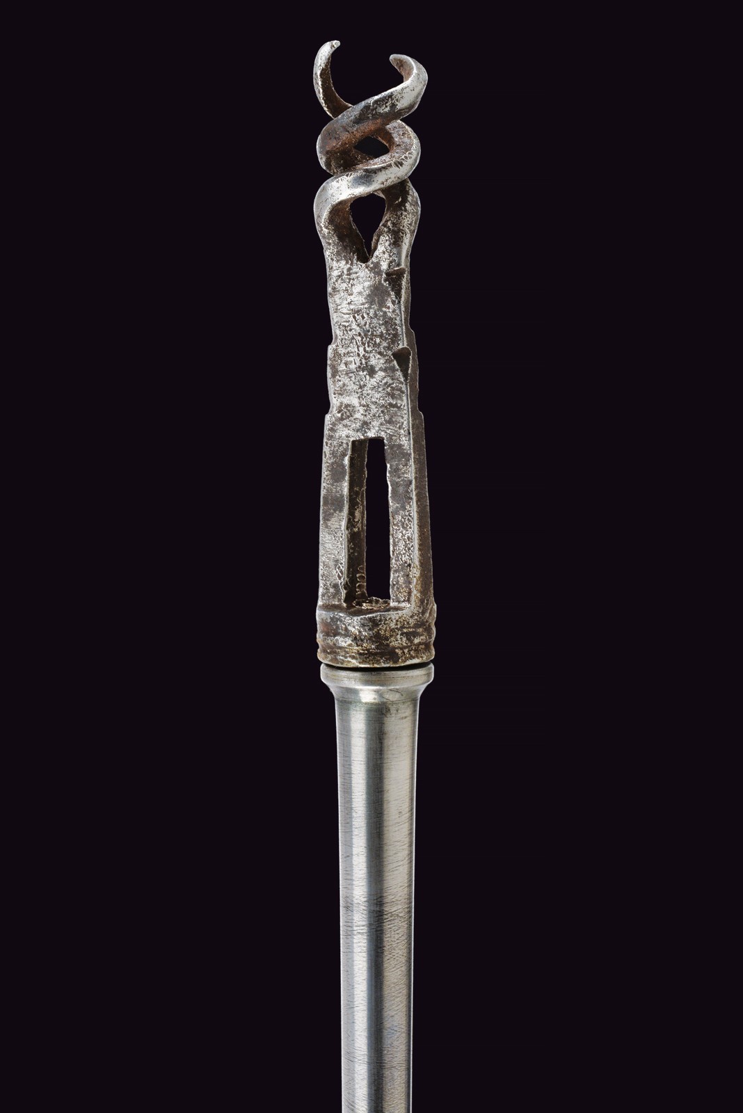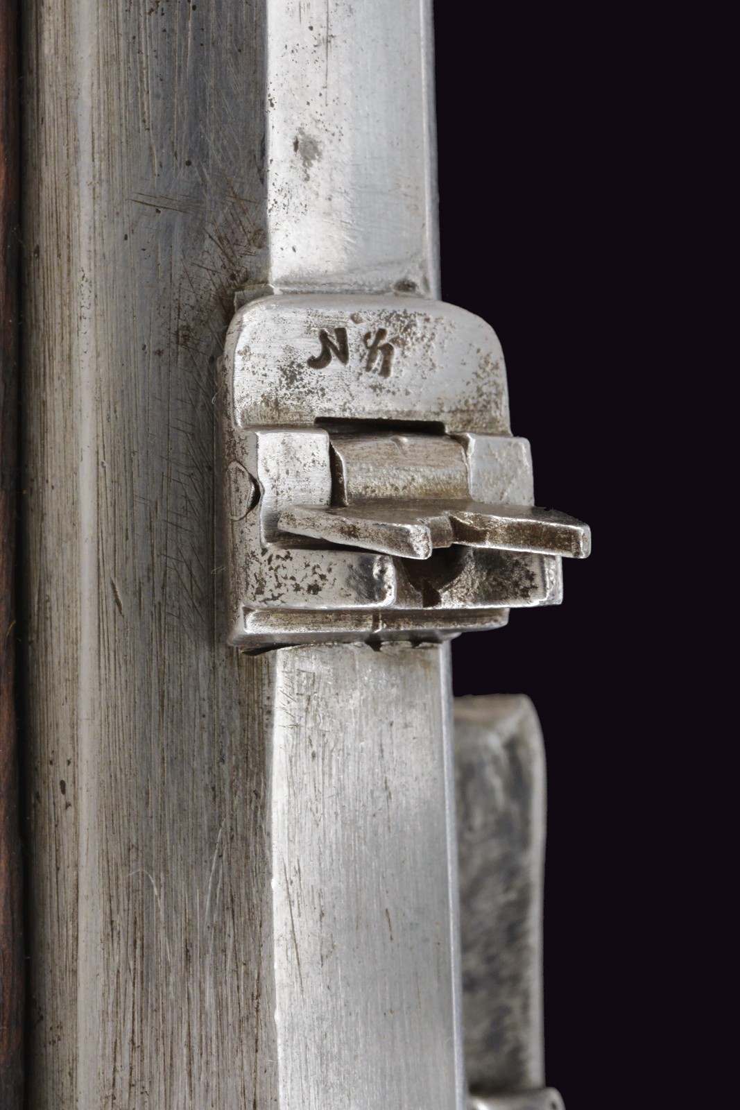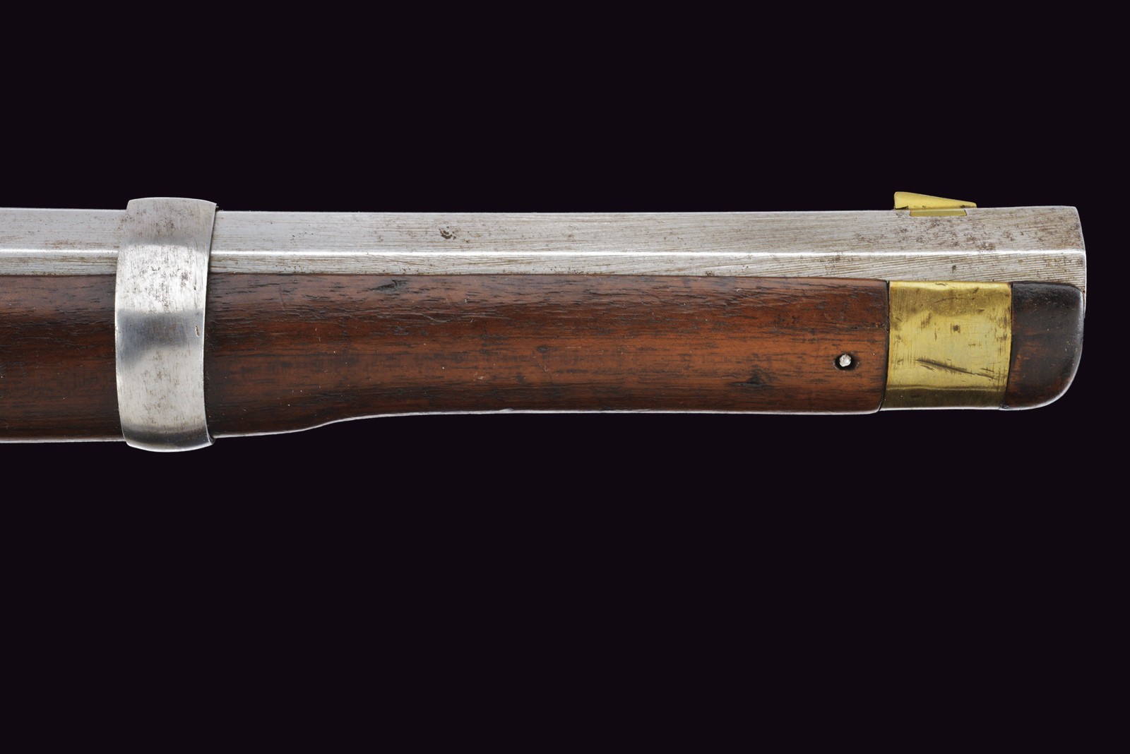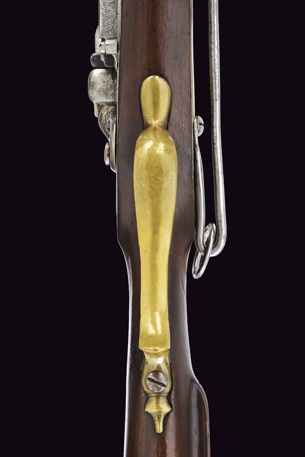Rifled, 15 mm cal. barrel (bore with light pitting between the clearly visible grooves), octagonal, provided with iron rear sight and brass foresight. Short, smooth tang. Lock entirely of iron, two-snap working mechanism. Wooden full stock with patchbox. Brass mounts, shaft with iron sling swivel. Together with the rare iron ramrod provided with a leather string. Very rare.