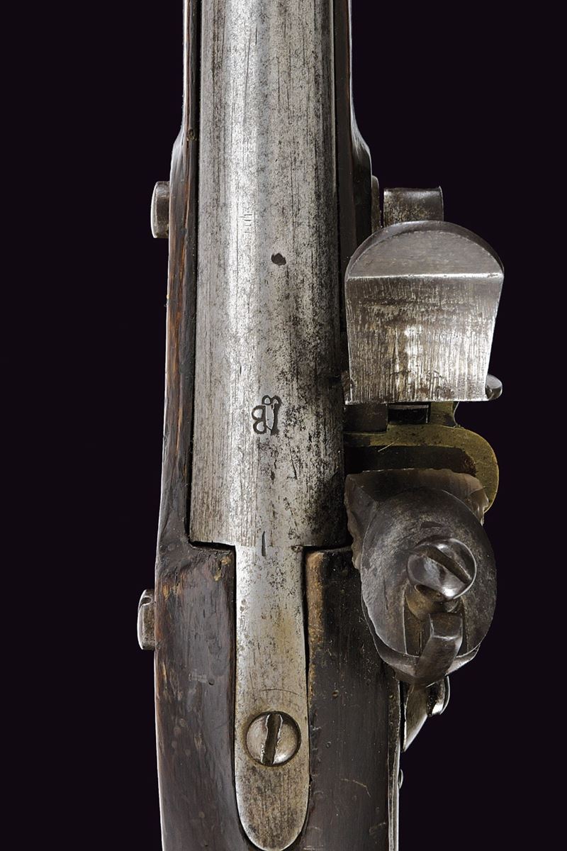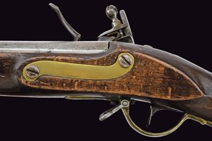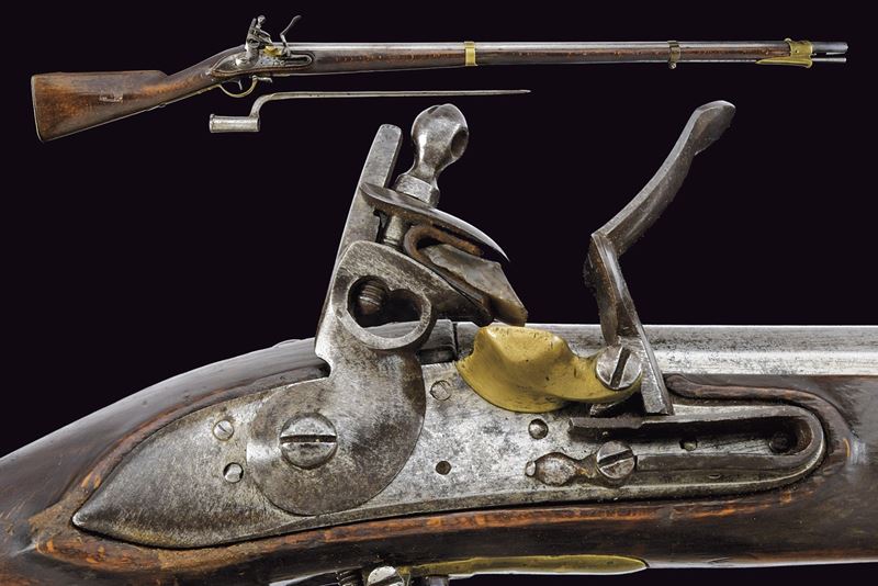 Smoothbore, round, 17 mm cal. barrel, slightly squared at the base on the sides, marked with "IB" (?), foresight on the barrel bracket. Flintlock with brass pan. Wooden full stock with brass mounts and iron ramrod. Socket bayonet (length: 55.5 cm) with cross-shaped blade.