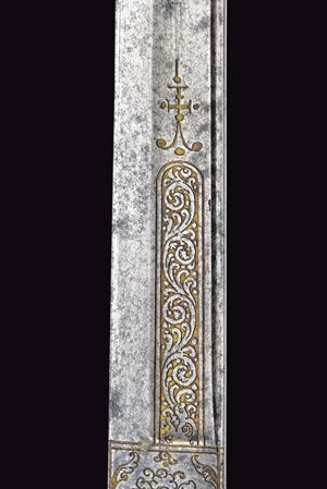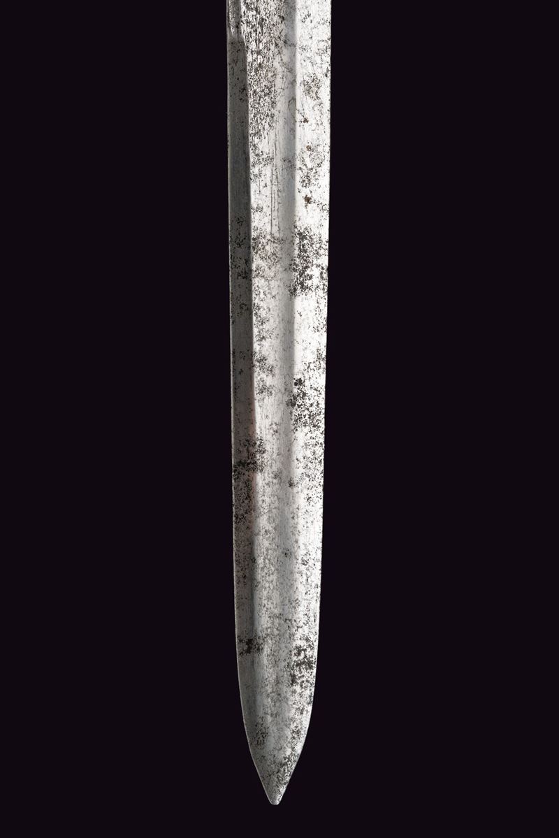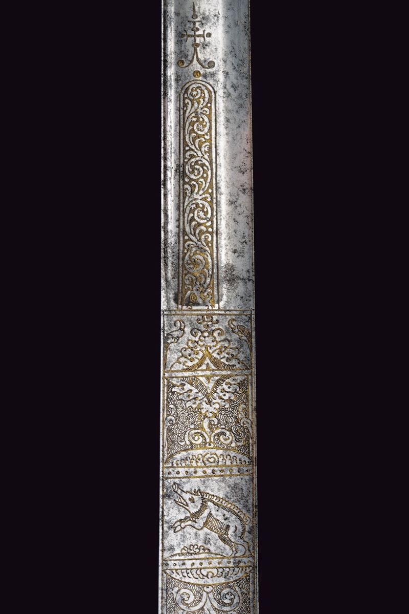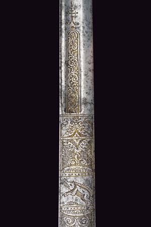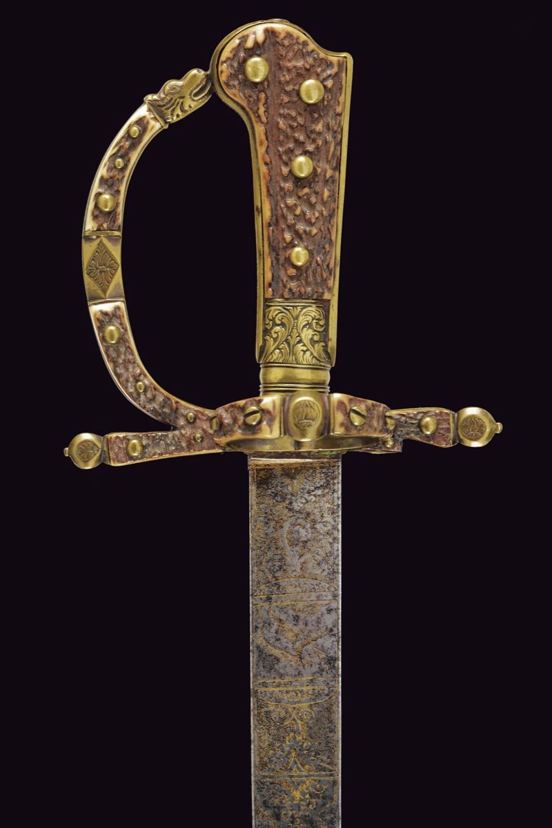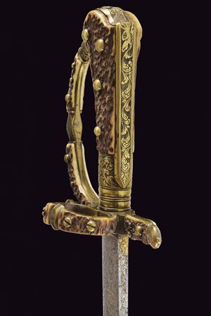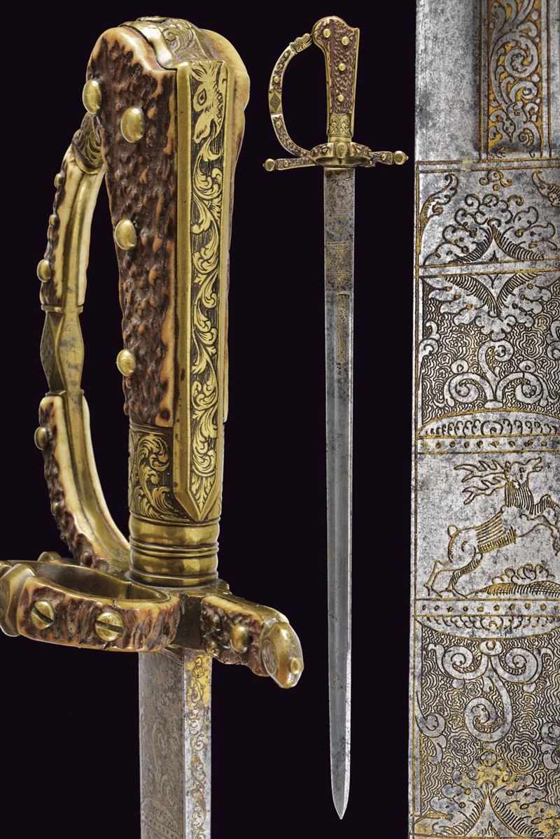 Long, straight, single-and-false-edged blade, the first part flat and finely engraved with remains of gilding, with wild boar, deer and floral motifs; then central fuller along almost the entire length and a dorsal groove up to the false edge. Brass hilt with straight quillons ending in small discs, parry ring and loop-guard culminating in a dragon's head. Grip with stag horn plates, a material that also embellishes the other elements of the hilt. Frame and ring nut finely engraved with dragon heads and floral motifs.