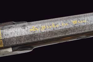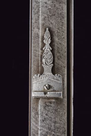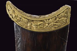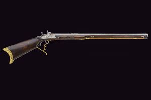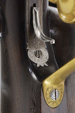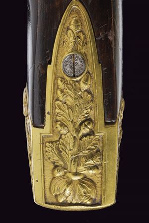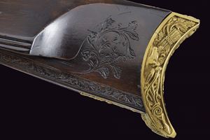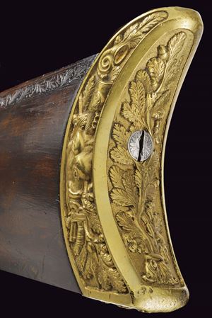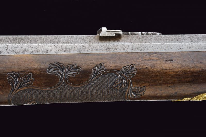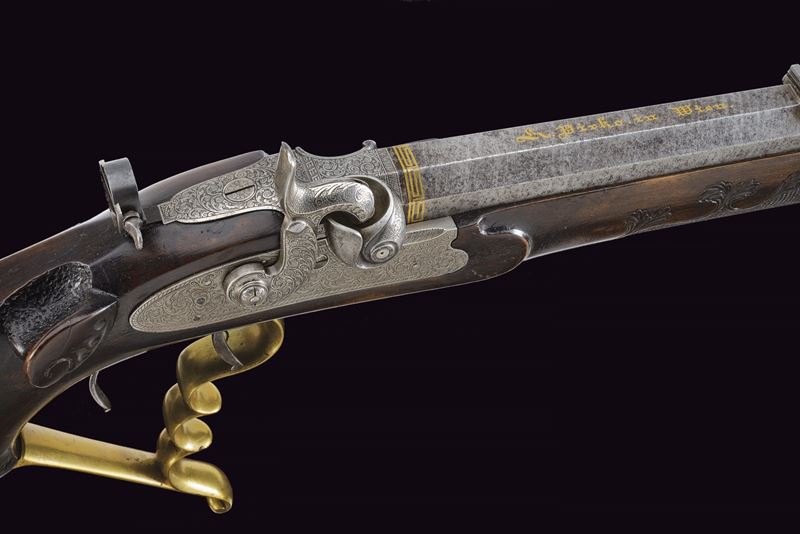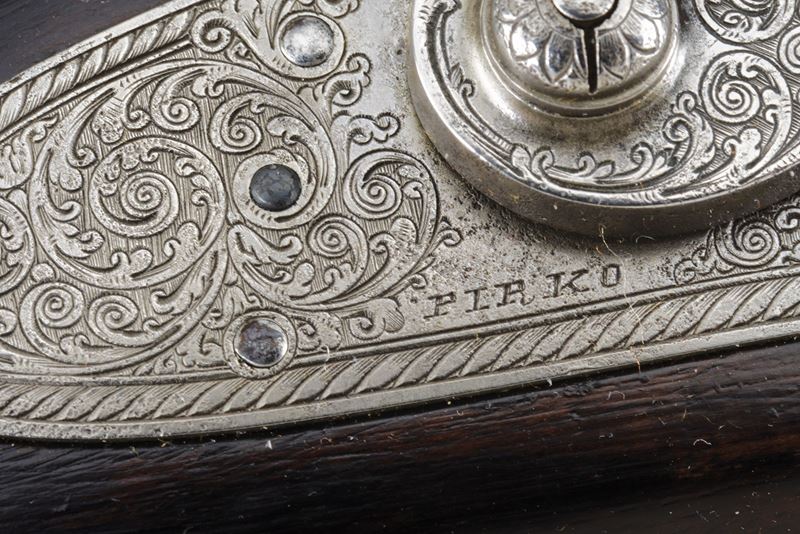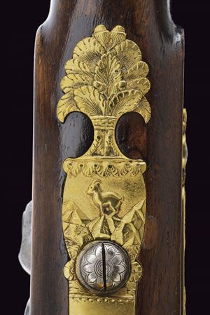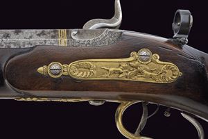 Heavy rifled, octagola, 12 mm cal barrel(bore with pitting, rifling clearly visible); at the breech a scroll-engraved steel part, followed by a Greek key and the signature “Pirko. in Wien.” in gold; fixed rear sight, the forward section engraved; at the muzzle a precision front sight within a gold frame. Tang with very fine scroll engraving, fitted with a diopter. Shell-shaped drum, engraved, with a silver centre. Forward-spring percussion lock; lockplate and hammer entirely and expertly engravedwith floral motifs; beneath the hammer base the signature “PIRKO.” Full stock partly floral engraved and with chequered fore-end; on the right side a well-carved thumb-rest. Magnificent gilt-brass mounts, low-relief carved: sideplate with hounds attacking a boar; ahead of the anatomical trigger guard an ibex on rock; buttplate with a hunting trophy and a stag at centre; the opposite side with a boar’s head at centre. Set trigger (stecher). Horn fore-end cap. Horn-tipped wooden ramrod.