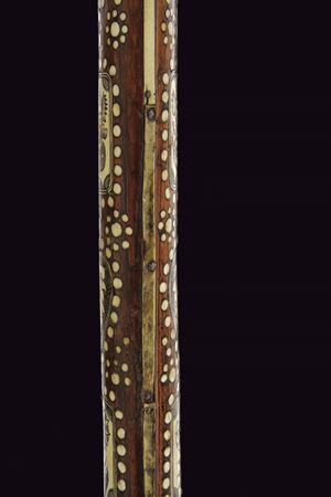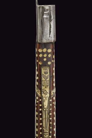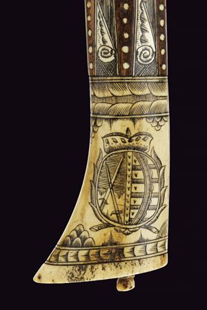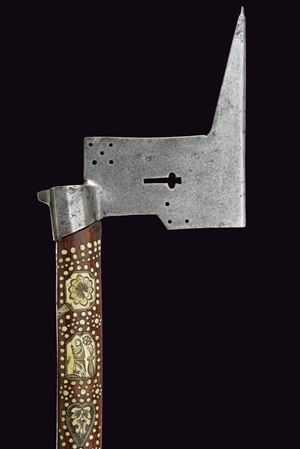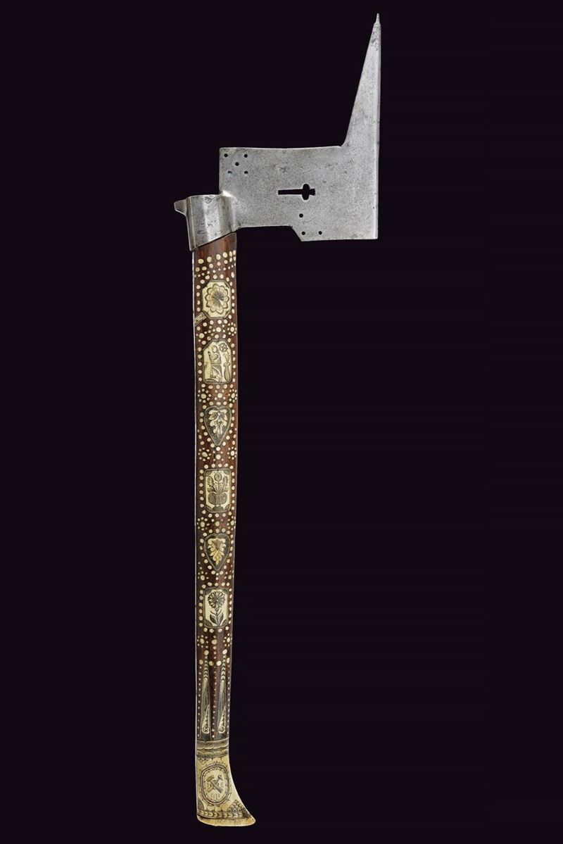 Typical iron blade, the edge with upward-pointing tip, a trefoil-shaped grip and three and five perforations at the corners. Small, cusped hammer, faceted eye-slot. Walnut shaft with numerous engraved bone inlays, rectangular, heart-shaped, triangular plates, rosettes and dots, engraving depicting Christ on the cross, some figures and flowers. Bone grip, engraved with Saxon coat of arms under an elector's crown, on the other side miners' coat of arms and date “1618”. Rare.