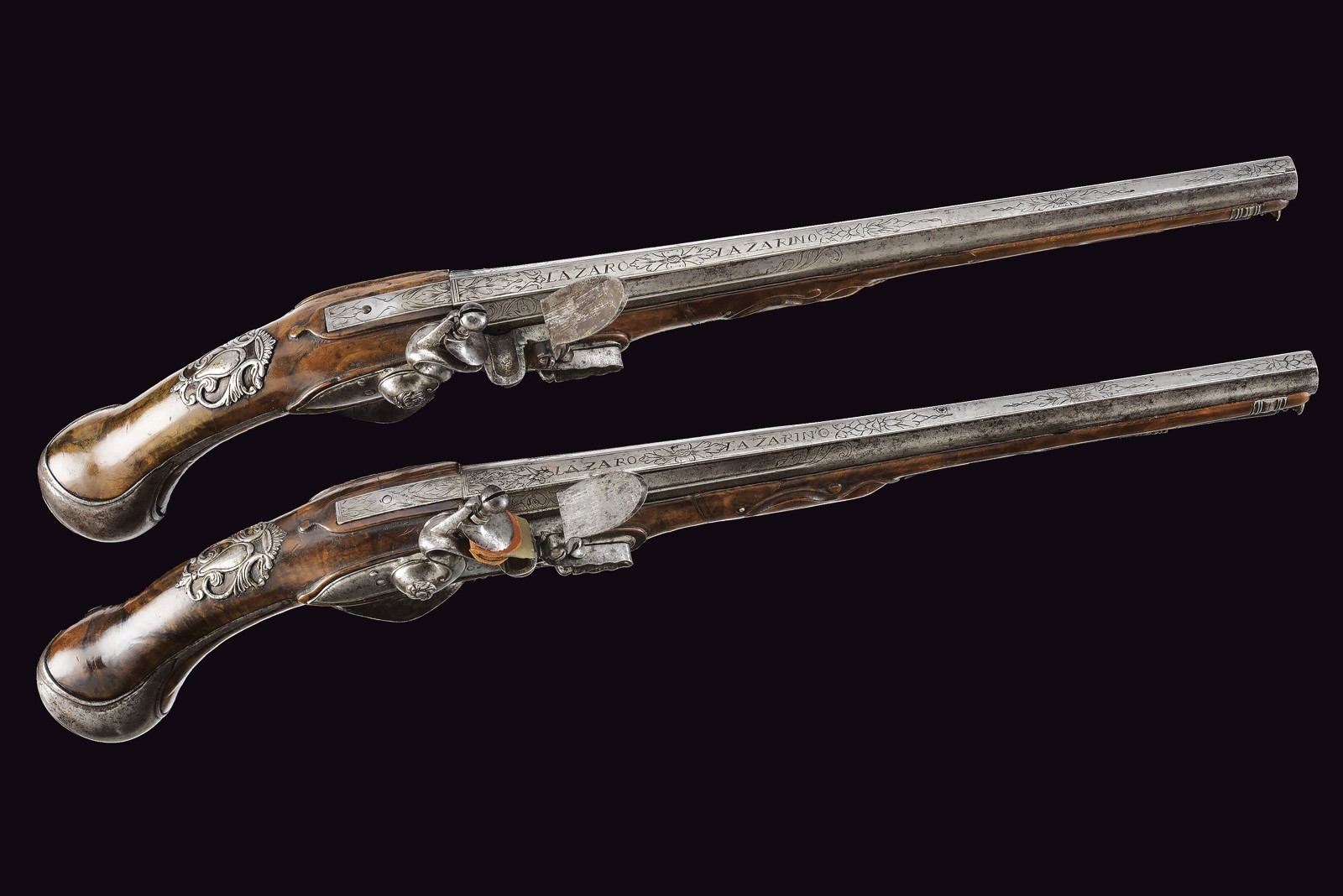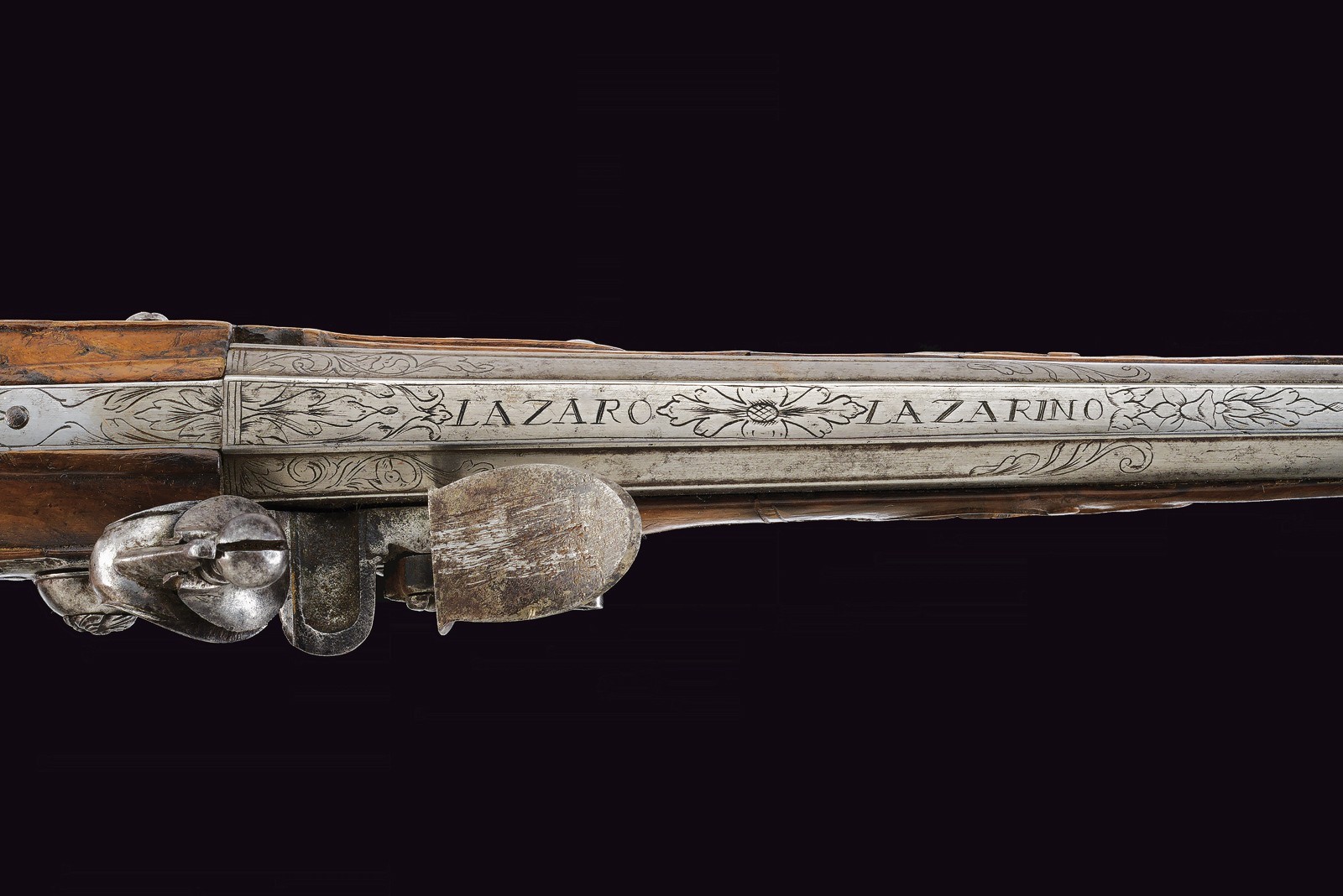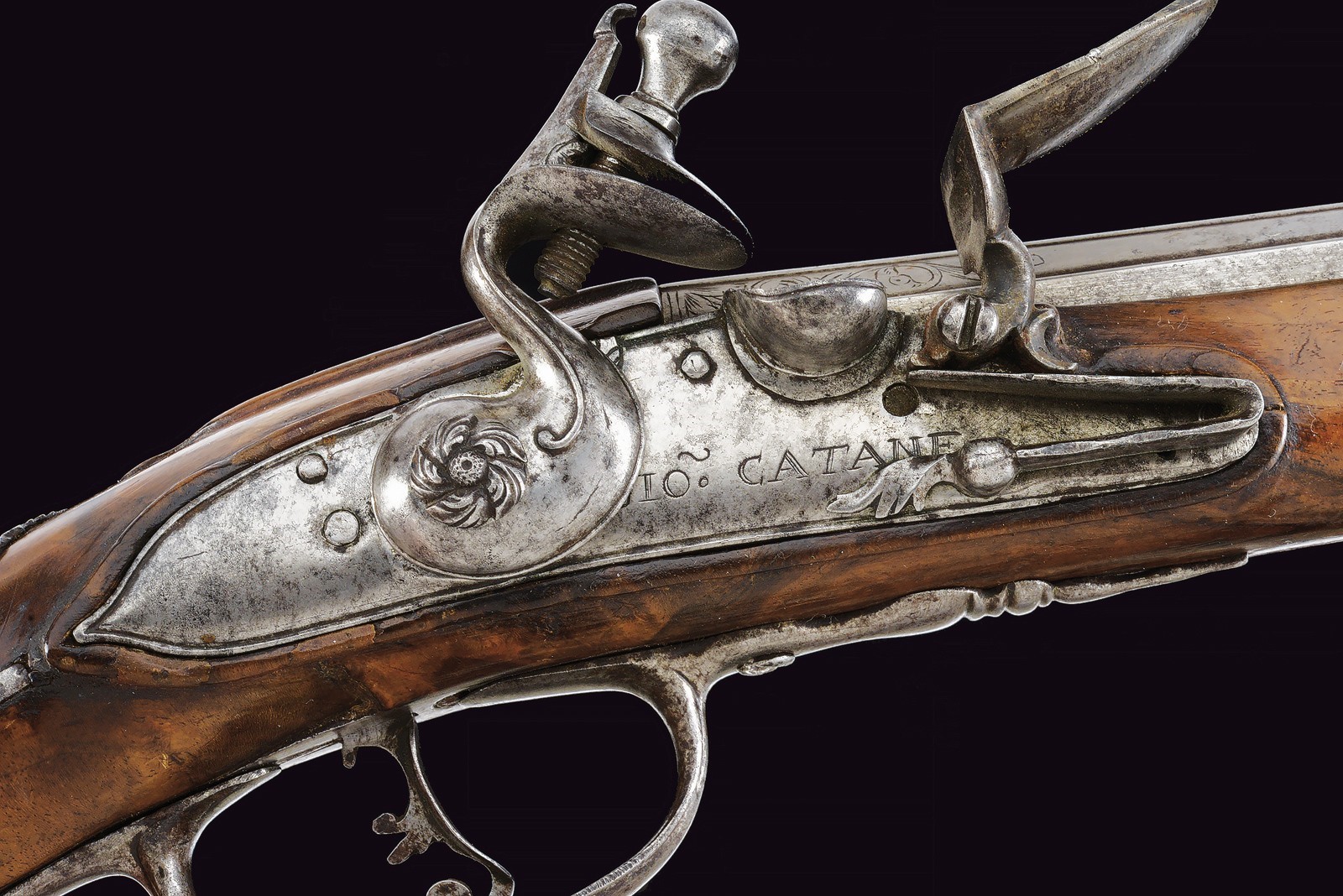 Smoothbore, two-stage, 14,5 mm cal. barrels, the first part octagonal marked "LAZARO LAZARINO" among floral decorations, without marked rings at the girdle, then of round section while maintaining a flat back engraved in sections up to the nozzle; tangs engraved en suite. Flintlock with slightly rounded lock plates signed "GIO. CATANE", outlined borders and cock screw covers carved with flowers. Wooden stock (in two pieces?), with wave-pattern carving on the parts below the barrel. Simple and elegant iron mounts. Iron-tipped wooden ramrod.