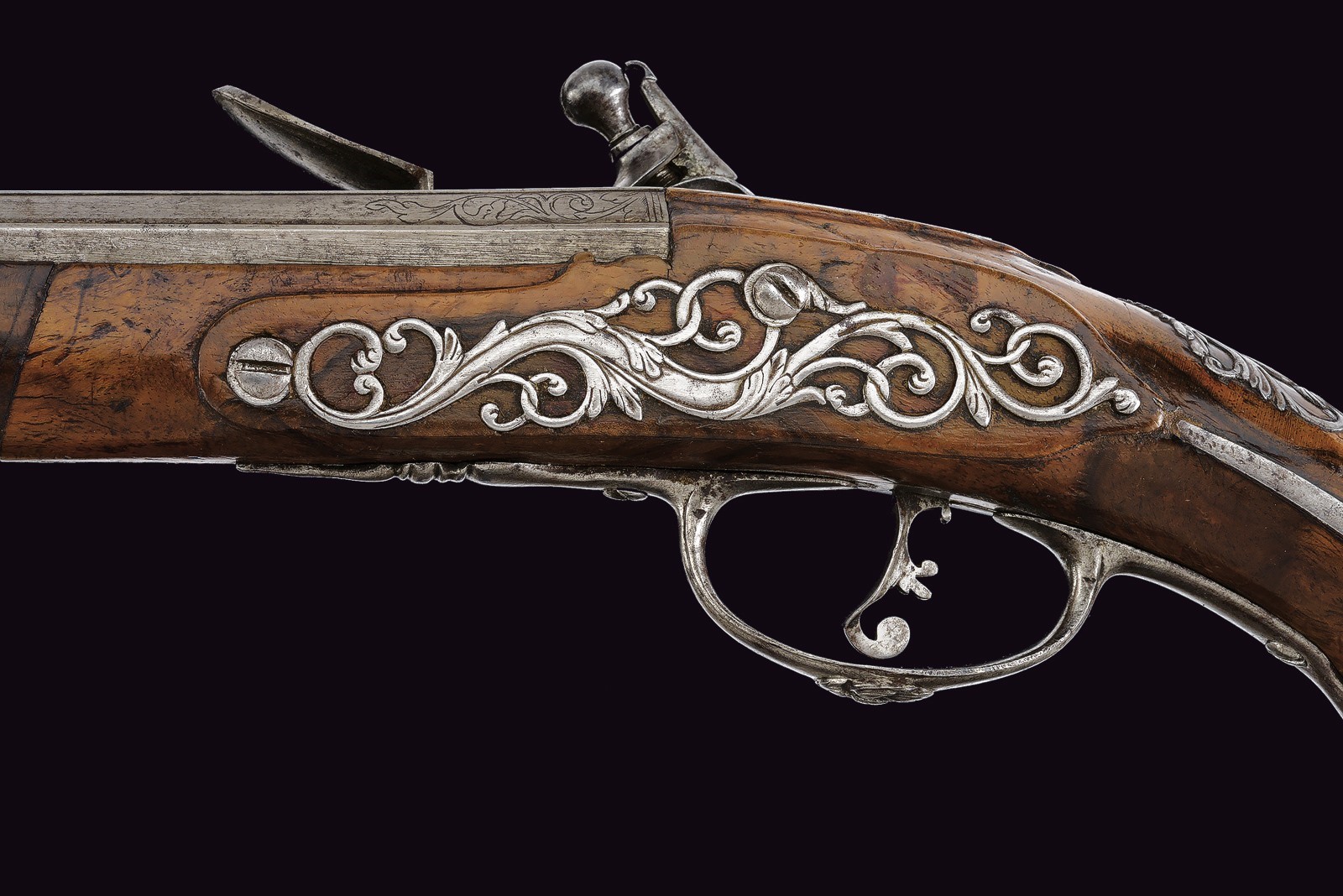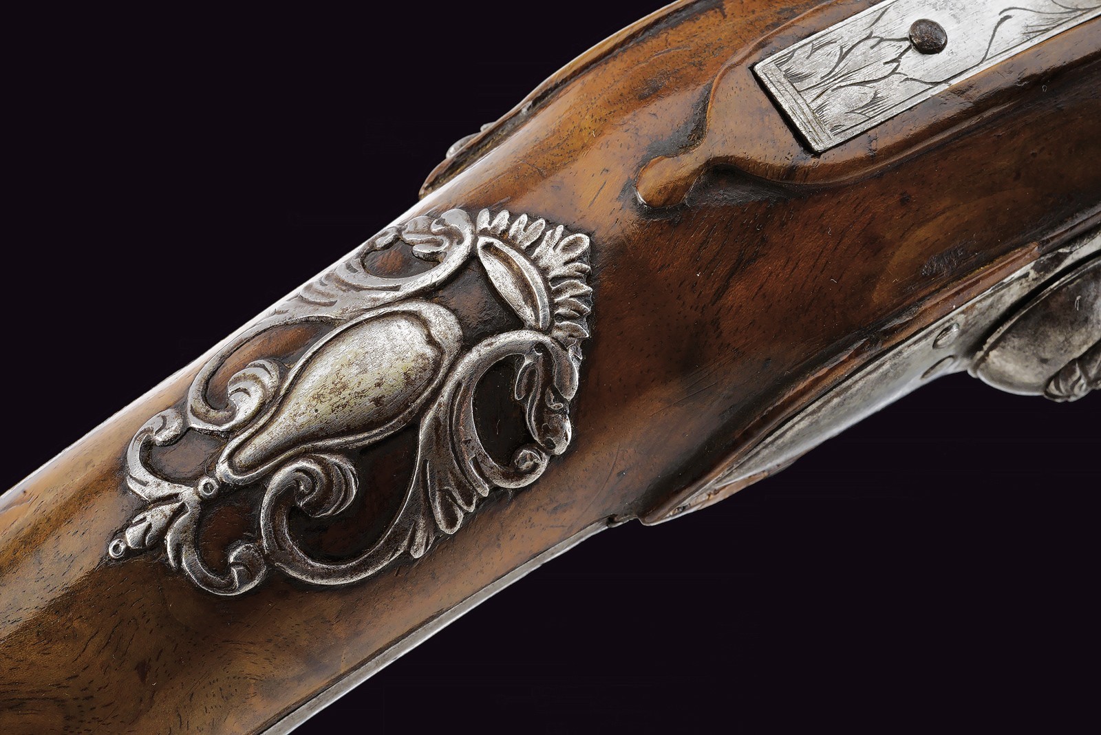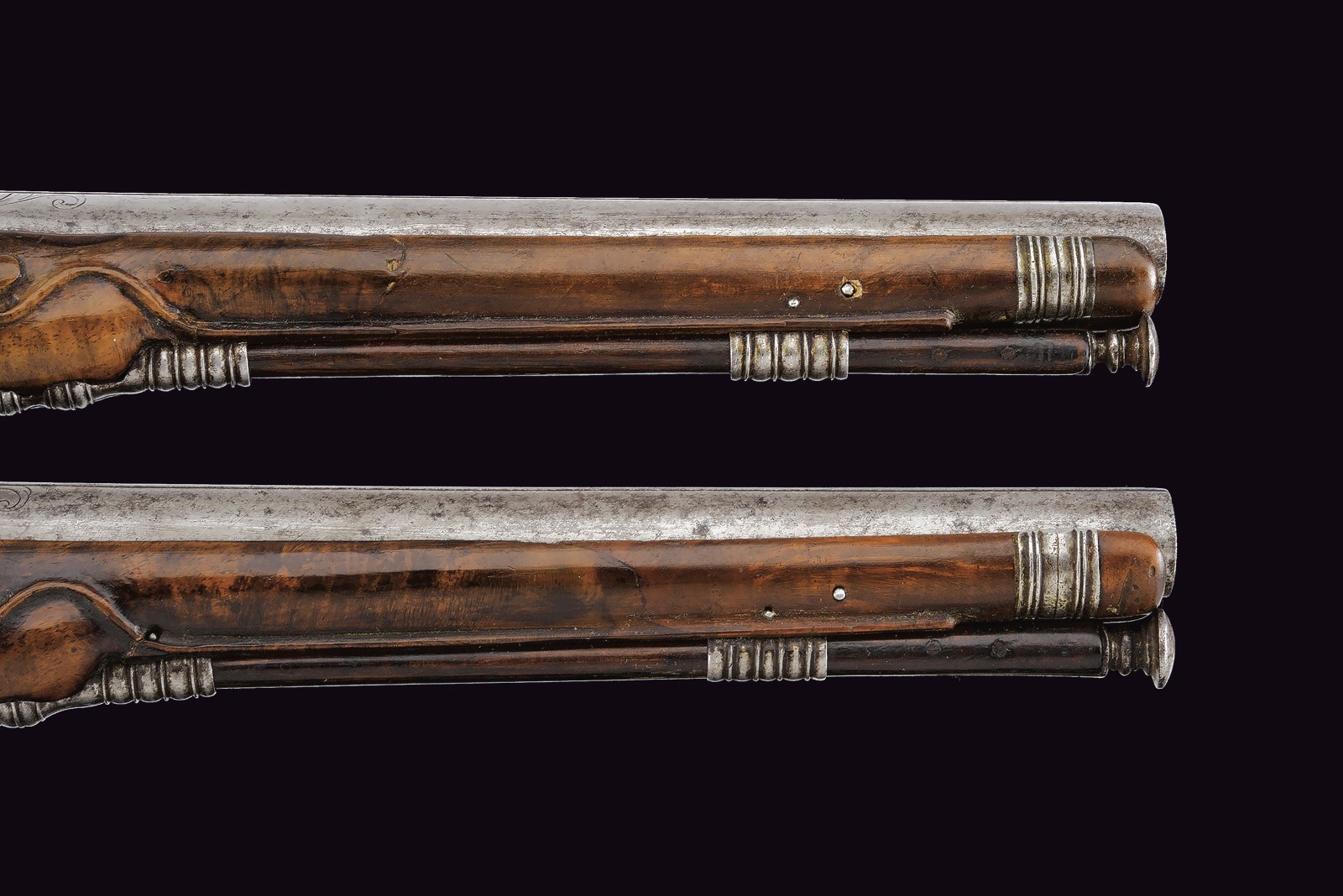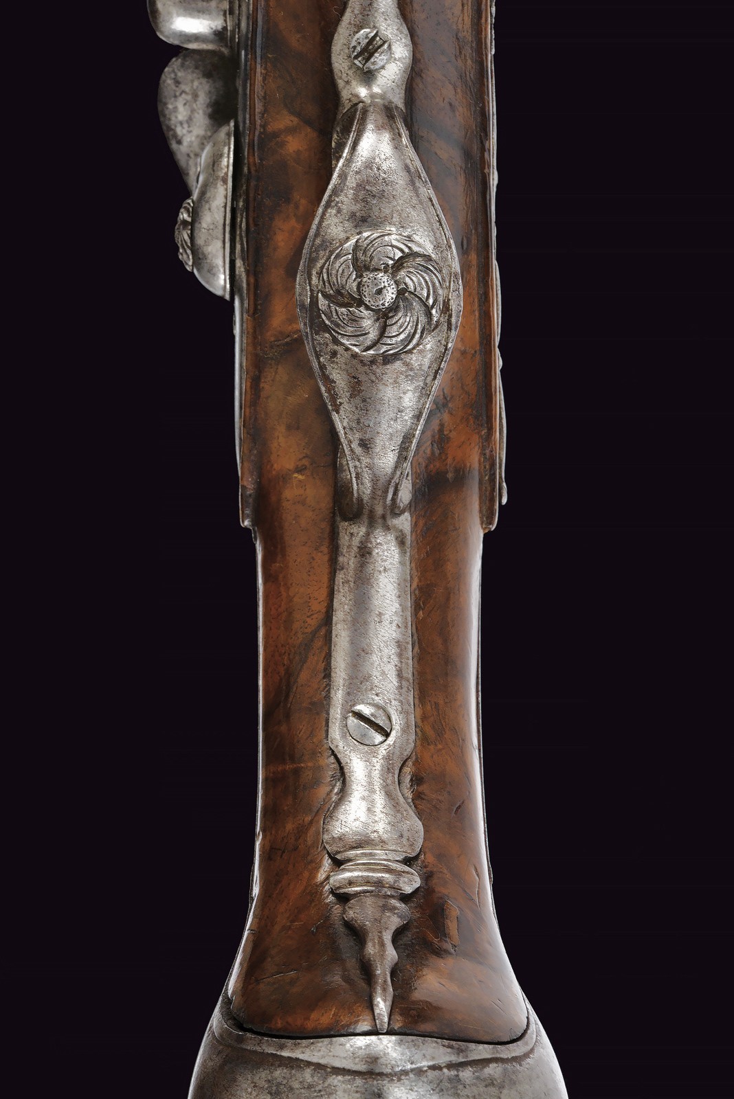 Smoothbore, two-stage, 14,5 mm cal. barrels, the first part octagonal marked "LAZARO LAZARINO" among floral decorations, without marked rings at the girdle, then of round section while maintaining a flat back engraved in sections up to the nozzle; tangs engraved en suite. Flintlock with slightly rounded lock plates signed "GIO. CATANE", outlined borders and cock screw covers carved with flowers. Wooden stock (in two pieces?), with wave-pattern carving on the parts below the barrel. Simple and elegant iron mounts. Iron-tipped wooden ramrod.