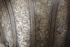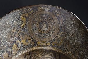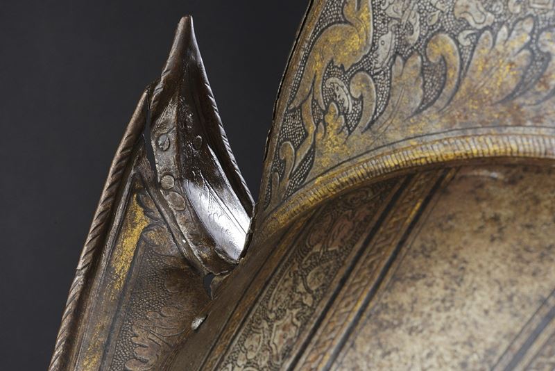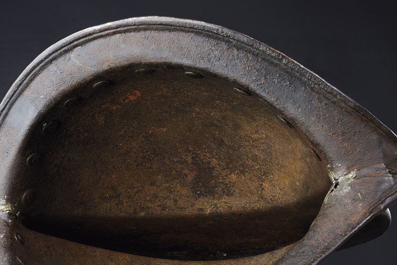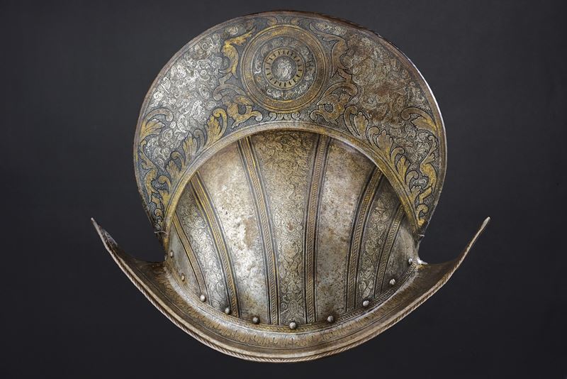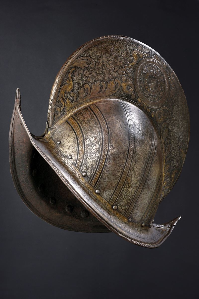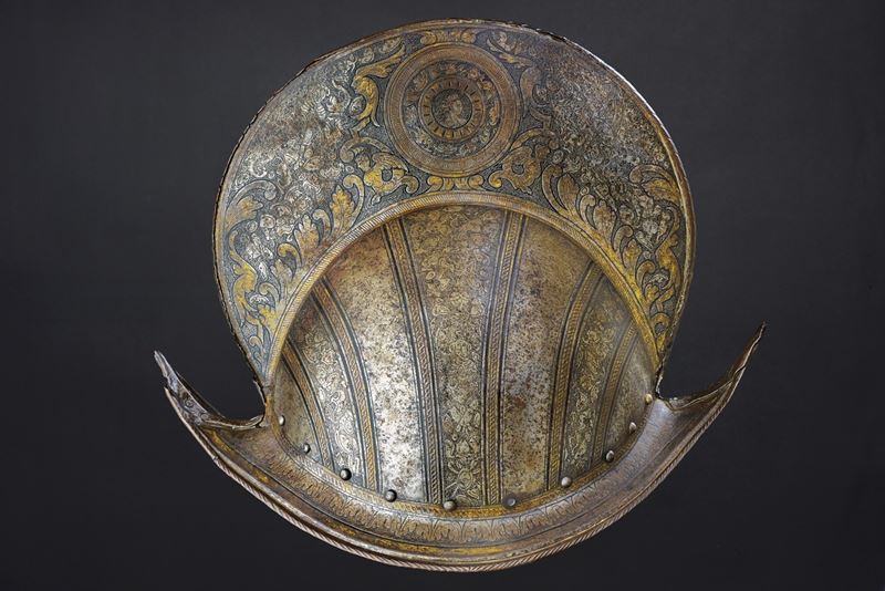 Two-piece, iron skull joined by rivets; high comb with notched edge, its surface finely engraved with trophies and scrolls on a dotted background, the central circular cartouche featuring male and female faces in classical style. The skull decorated with bands surmounted by trophies of arms, bordered by narrow frames with geometric motifs. Around the base, a row of original iron rivets. Boat-shaped brim engraved with leaves and with a rounded roped border. Significant remains of original gilding. The interior with an old inventory number in red paint.