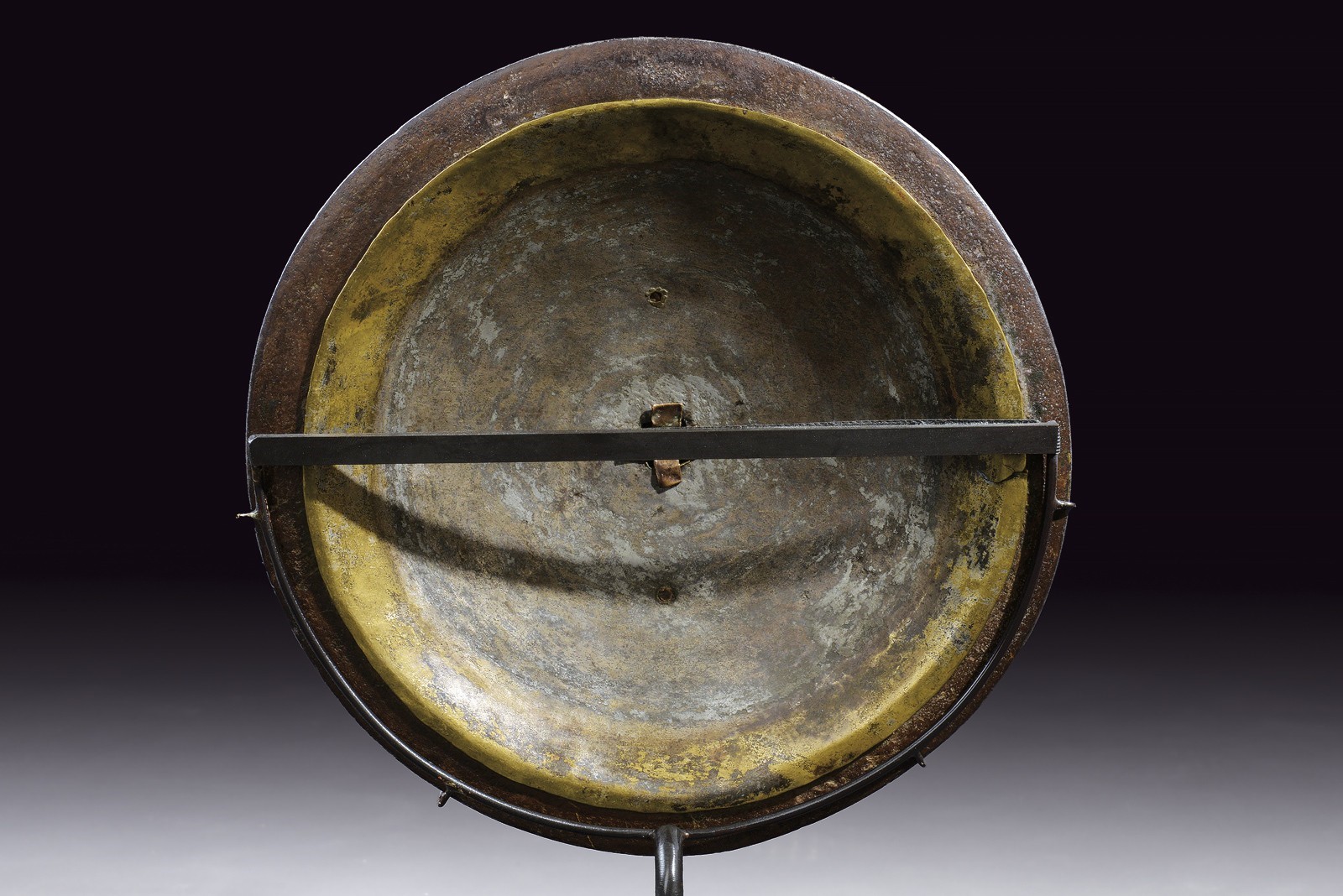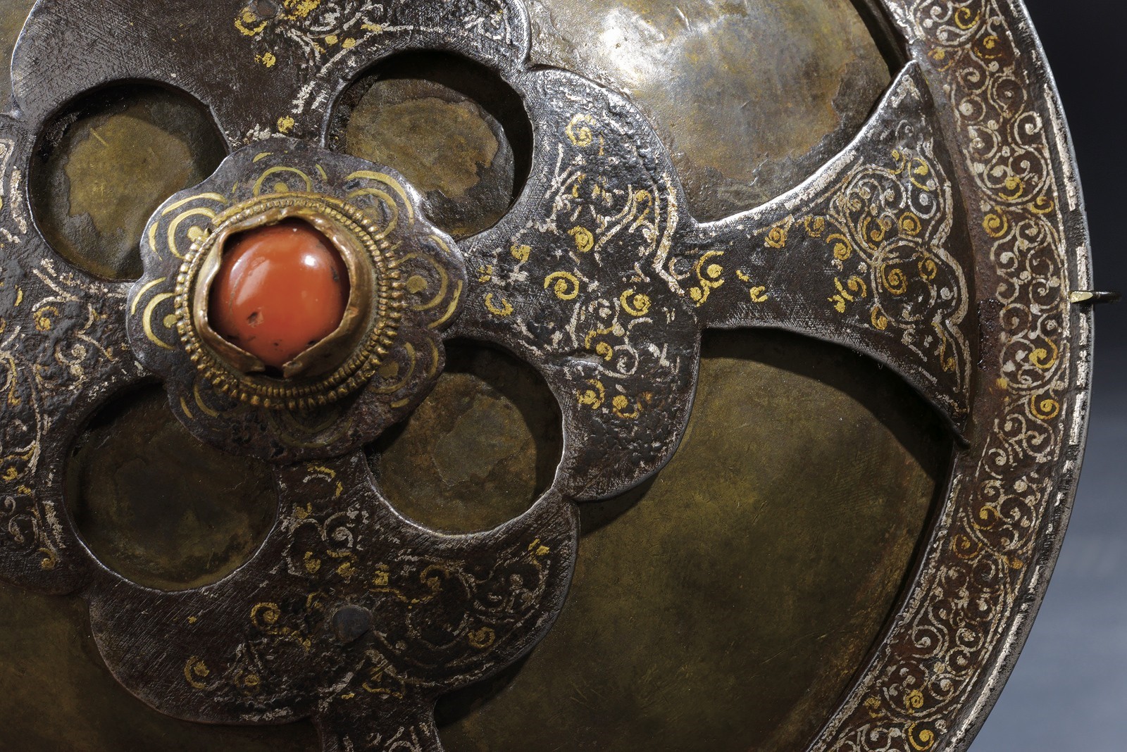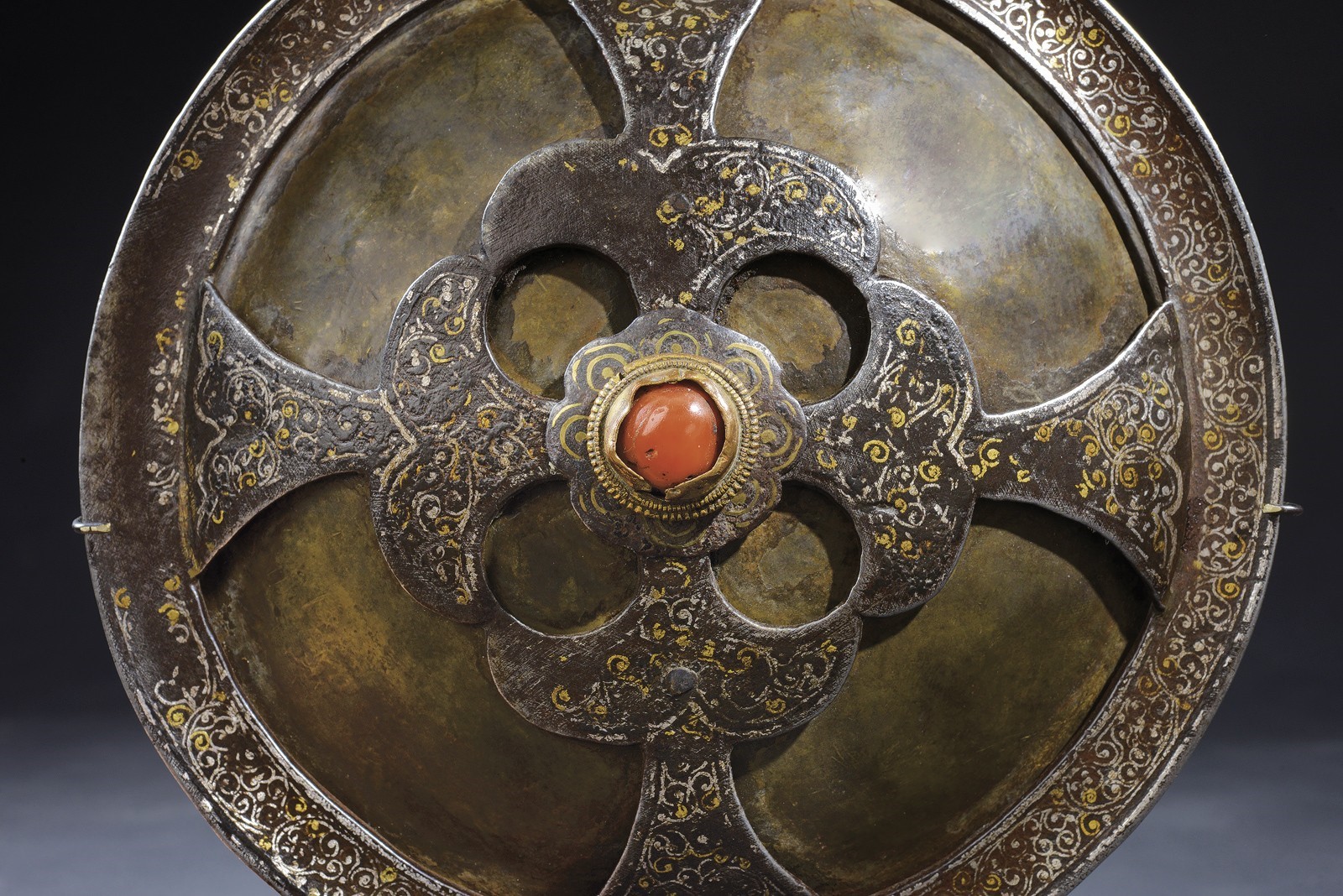 Convex, circular, flat, made of metal foil; decorated with a beautiful iron frame structured with four triangular branches converging at the centre, worked with a perforated flower pattern and decorated with a red cabochon stone, the entire surface decorated in gold and silver with floral motifs (some missing parts). Rare.