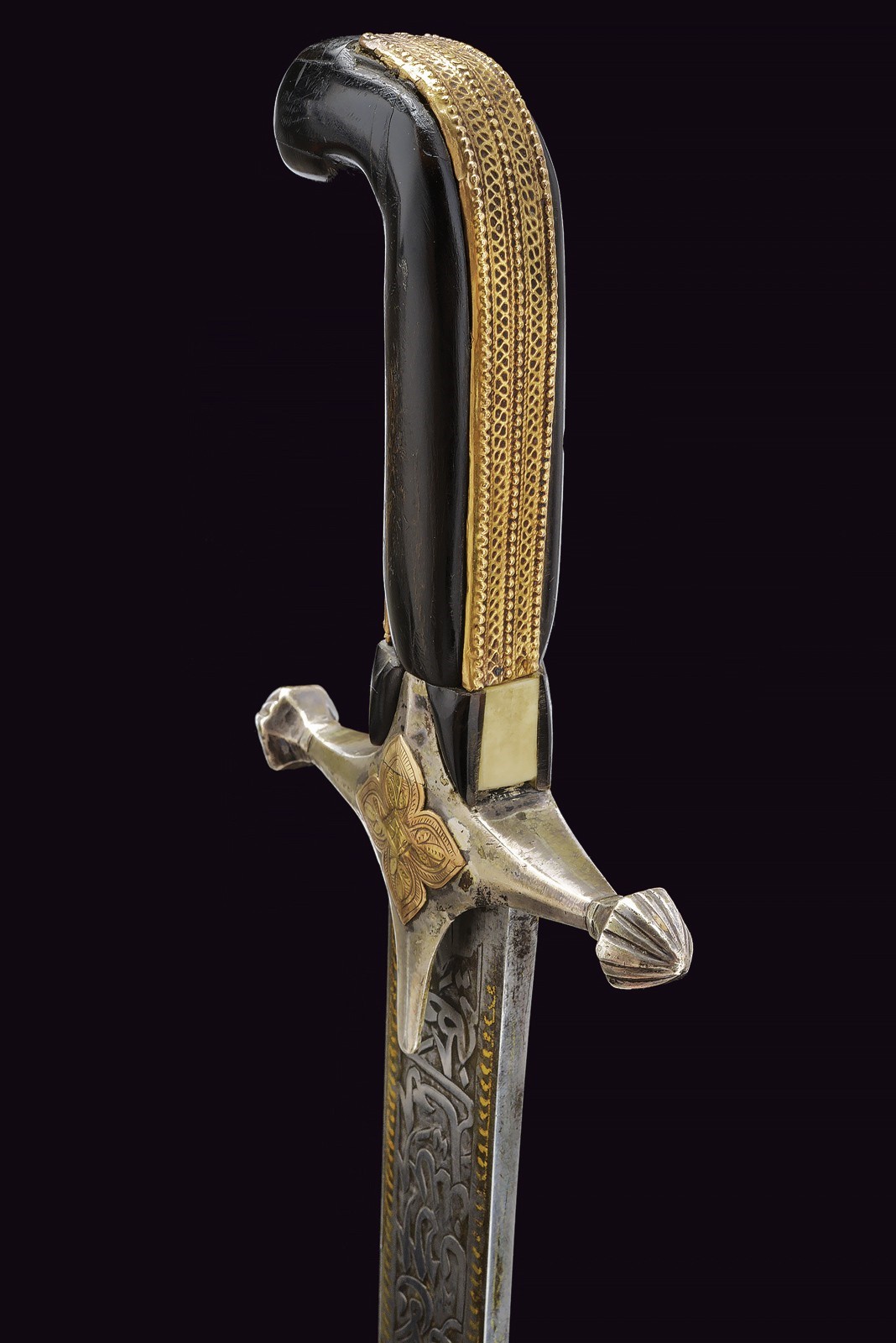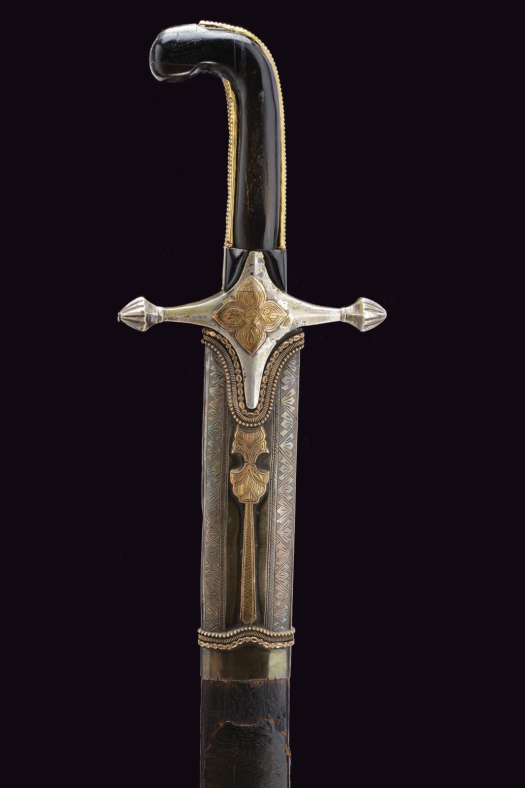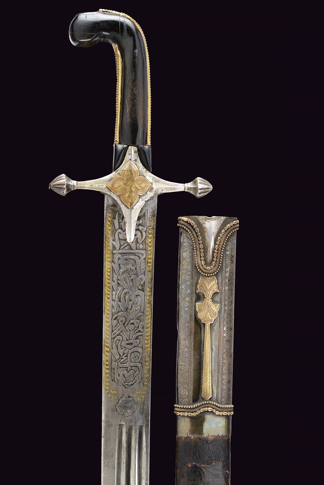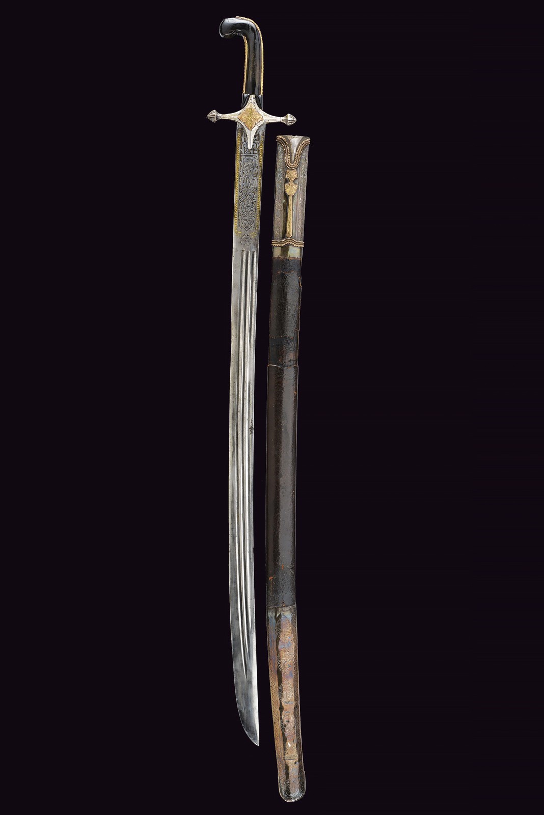 Wide, slightly curved blade with triple groove, with an inscription in Arabic in bas-relief with a gold frame on the right side of the base, the opposite side with two cartouches featuring an inscription in Arabic and a stylised lion, traces of gilding. Hilt with silver cross hilt, gold plate engraved with floral motifs (minor restoration) on the center of crossguard, angled hilt with pierced gold band (small loss), with bone plate at the base. Wooden scabbard covered with leather (the two bands with suspension ring are missing) with two silver mounts engraved with floral and geometric motifs, the cap also decorated with a plate and gold frame on both sides. Small defects. Very rare.