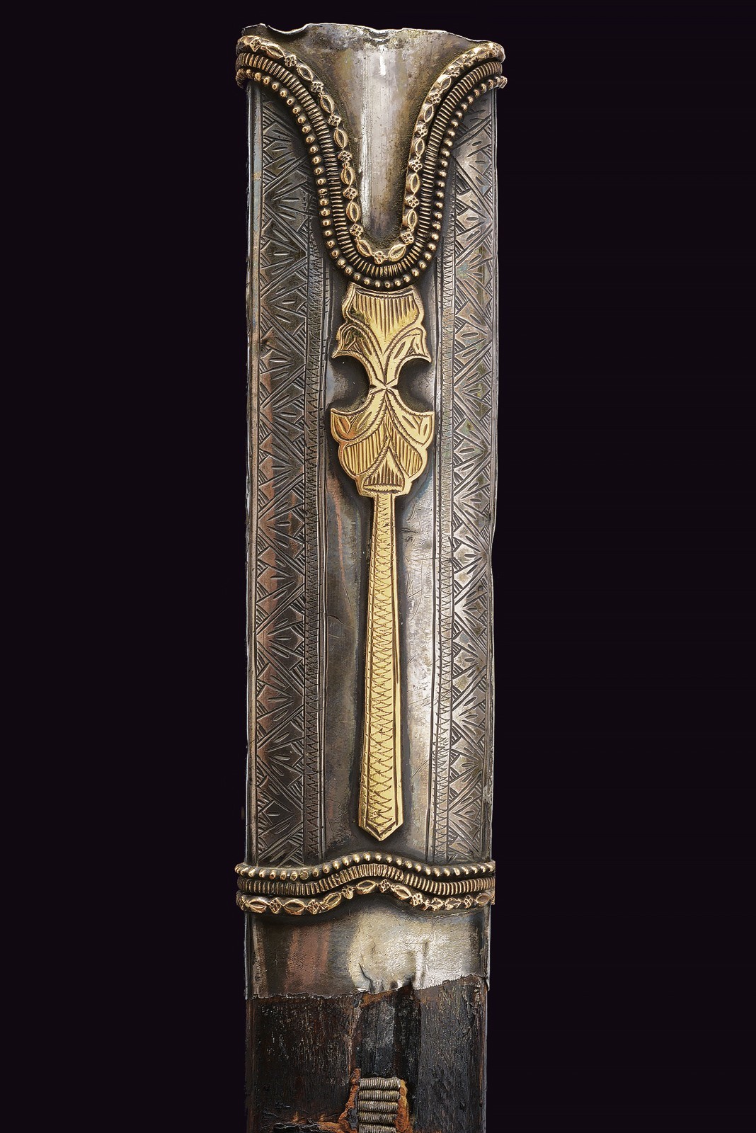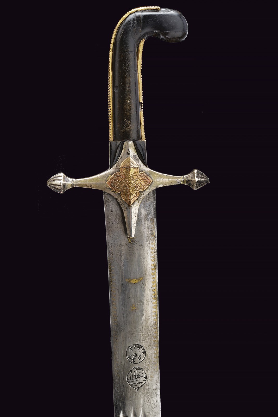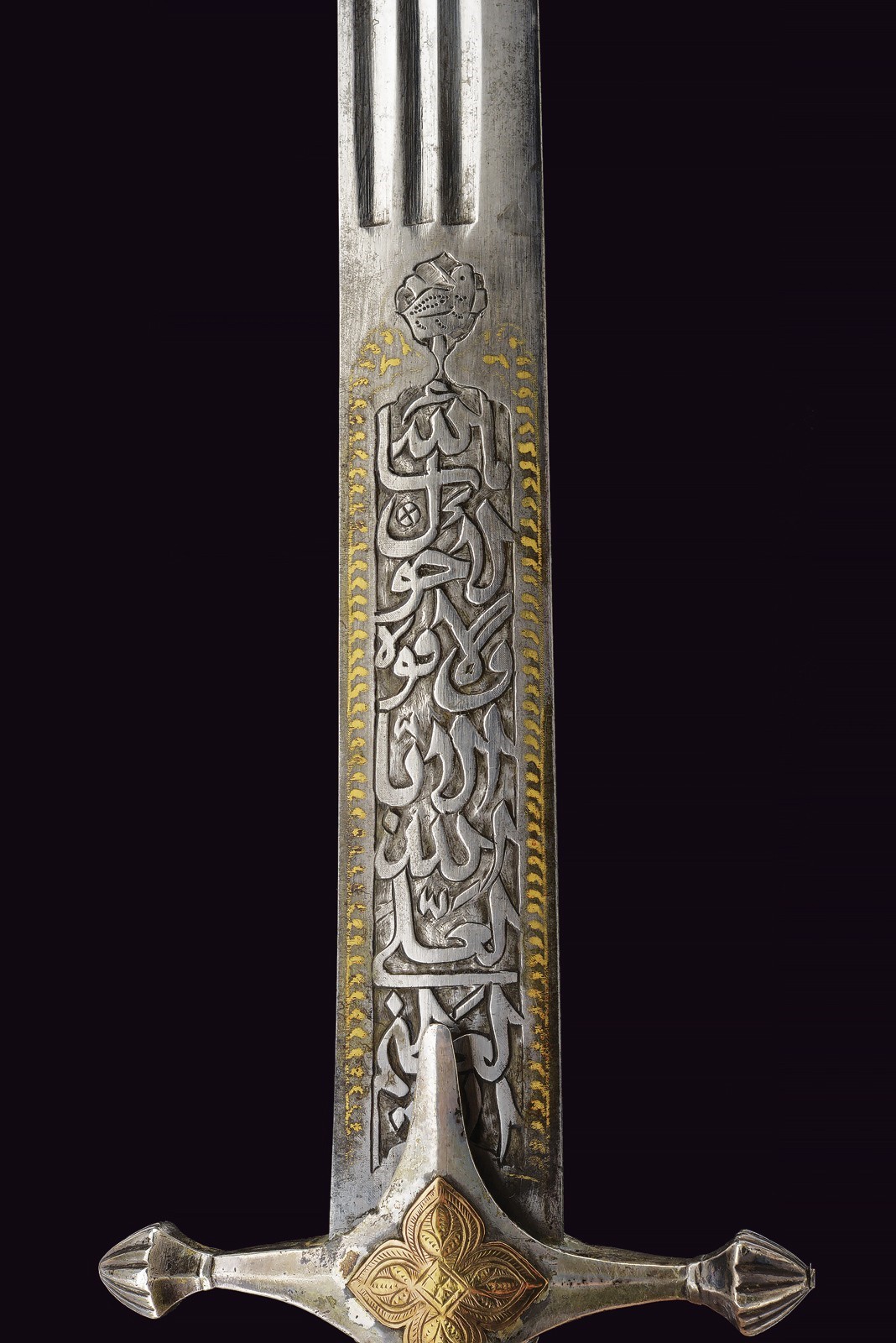 Wide, slightly curved blade with triple groove, with an inscription in Arabic in bas-relief with a gold frame on the right side of the base, the opposite side with two cartouches featuring an inscription in Arabic and a stylised lion, traces of gilding. Hilt with silver cross hilt, gold plate engraved with floral motifs (minor restoration) on the center of crossguard, angled hilt with pierced gold band (small loss), with bone plate at the base. Wooden scabbard covered with leather (the two bands with suspension ring are missing) with two silver mounts engraved with floral and geometric motifs, the cap also decorated with a plate and gold frame on both sides. Small defects. Very rare.
