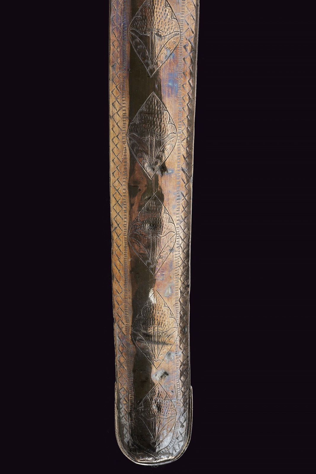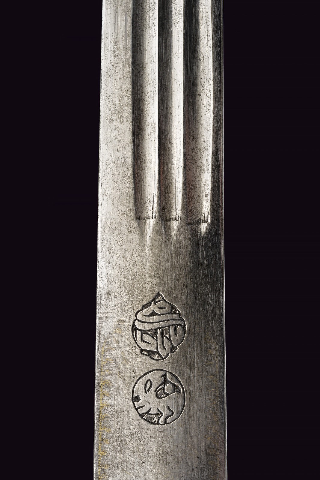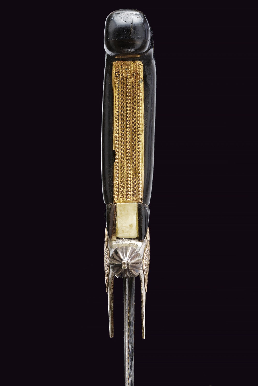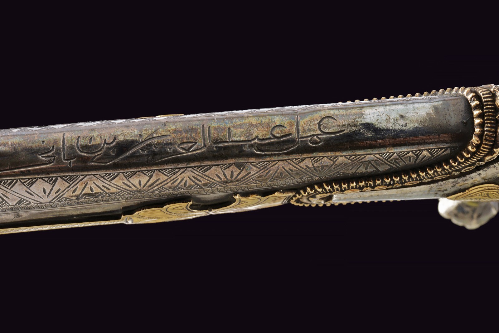 Wide, slightly curved blade with triple groove, with an inscription in Arabic in bas-relief with a gold frame on the right side of the base, the opposite side with two cartouches featuring an inscription in Arabic and a stylised lion, traces of gilding. Hilt with silver cross hilt, gold plate engraved with floral motifs (minor restoration) on the center of crossguard, angled hilt with pierced gold band (small loss), with bone plate at the base. Wooden scabbard covered with leather (the two bands with suspension ring are missing) with two silver mounts engraved with floral and geometric motifs, the cap also decorated with a plate and gold frame on both sides. Small defects. Very rare.