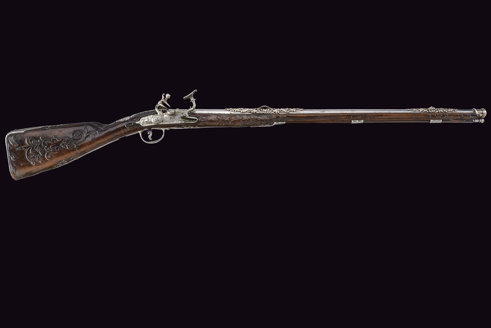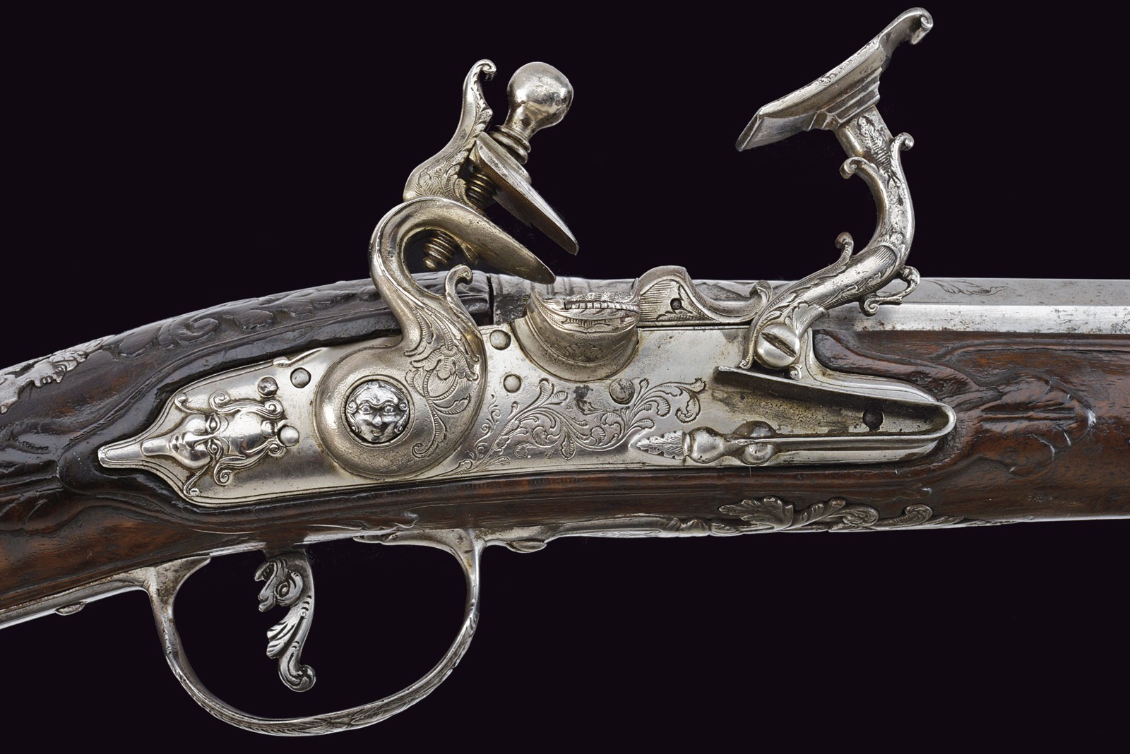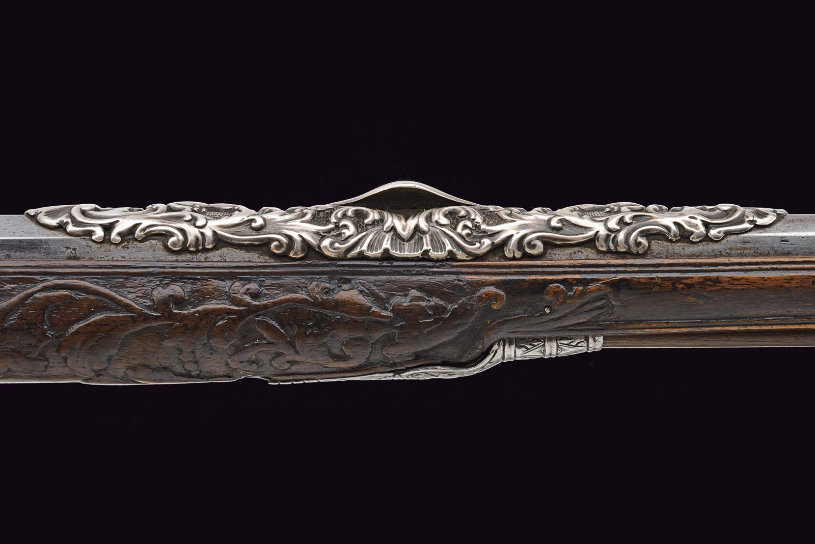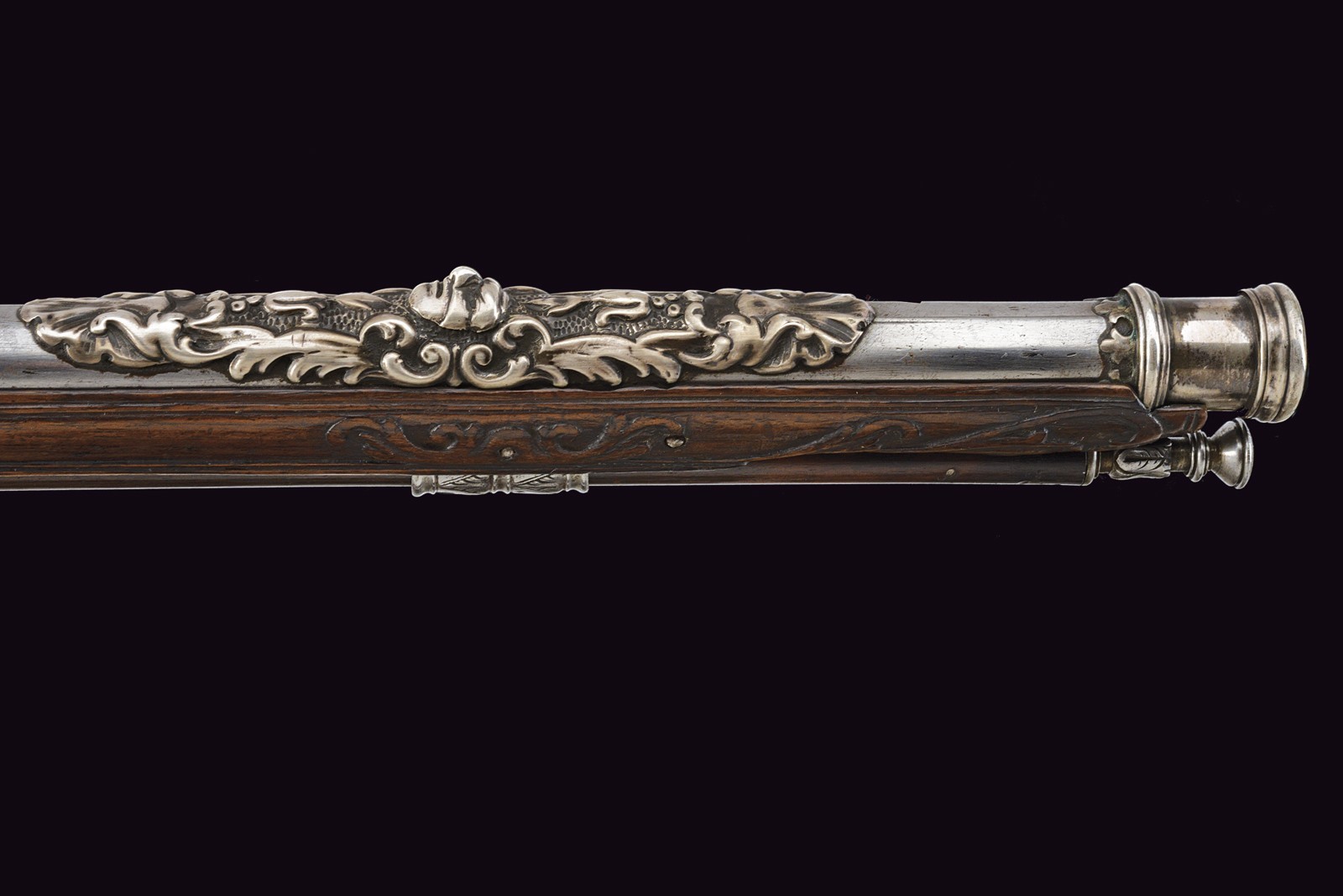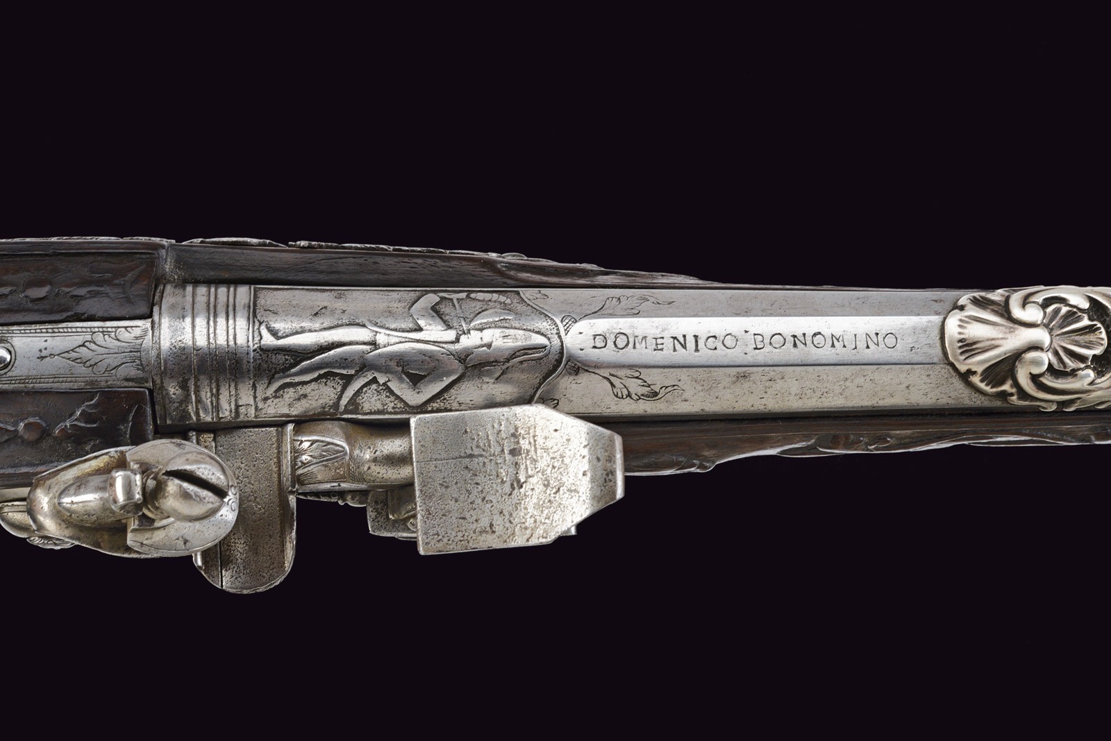 Smoothbore, 15 mm cal barrel, square in shape along its entire length, the powder chamber decorated with rings and a bas-relief carving depicting an anthropomorphic figure smoking a pipe; a little further on, the signature ‘DOMENICO BONOMINO’ in capital letters, among simple floral motifs. The barrel is decorated with two beautiful embossed silver mounts, carved and finely chiselled with floral scrolls, the first with a rear sight and the second with a high-relief mask in relief; the top with a moulded muzzle, the rear part of which is shaped like lilies. Tang engraved with flowers. Beautiful snaphaunce flintlock, plate engraved in the centre and on the neck of the hammer with floral scrolls, the tang and the cover of the hammer screw with a mask carved in bas-relief, elegant hammer handle decorated with curls; sliding pan cover. Full walnut stock (small antique restoration to the frame) beautifully carved with sphinxes, snakes and scrolls in bas-relief, carved and openwork iron mounts. Original, iron-tipped wooden ramrod.