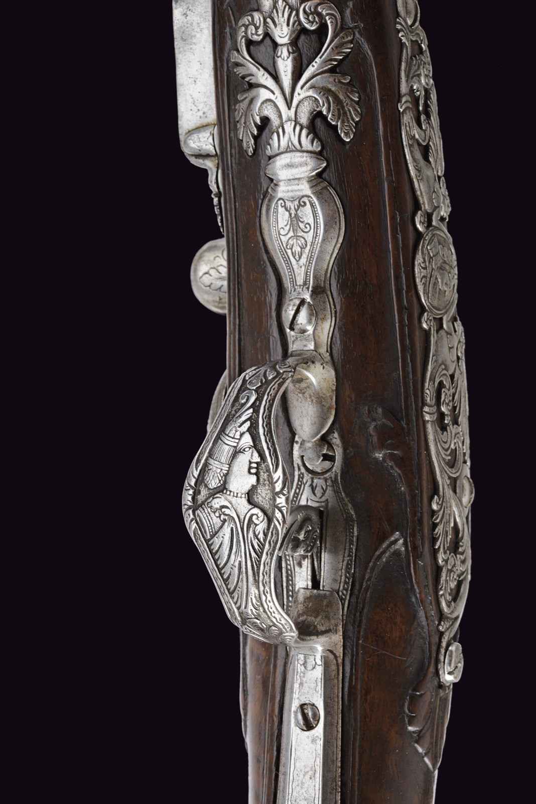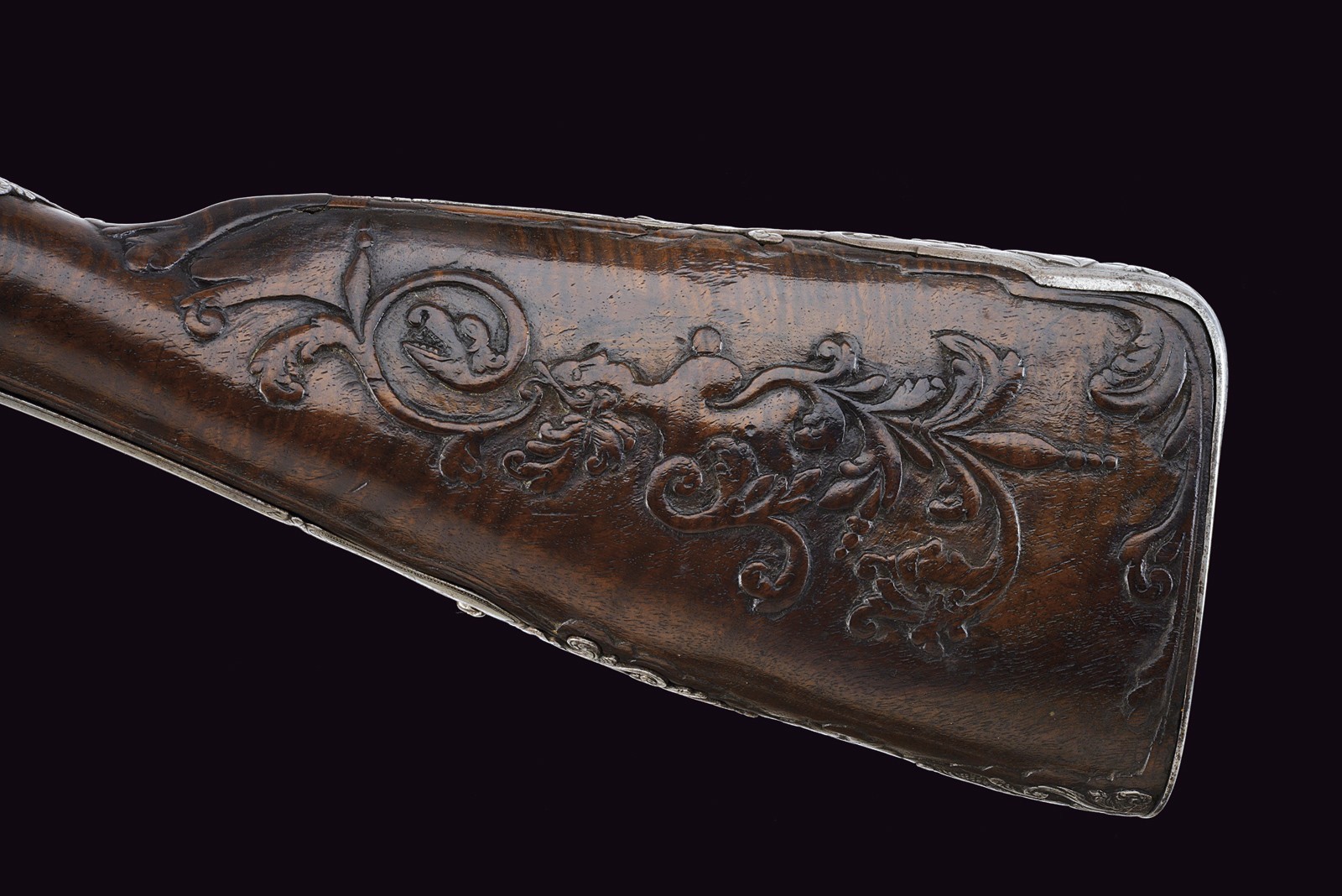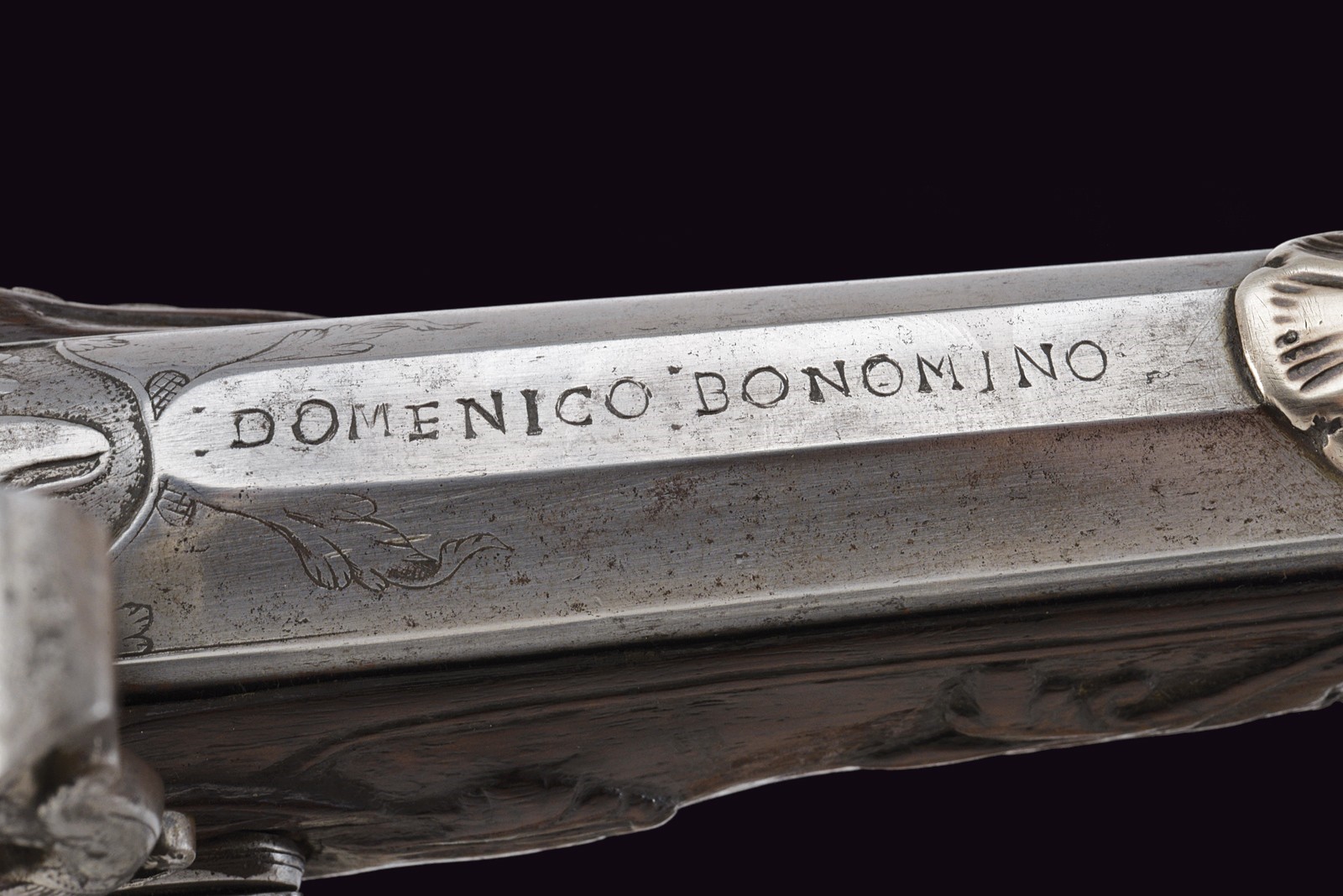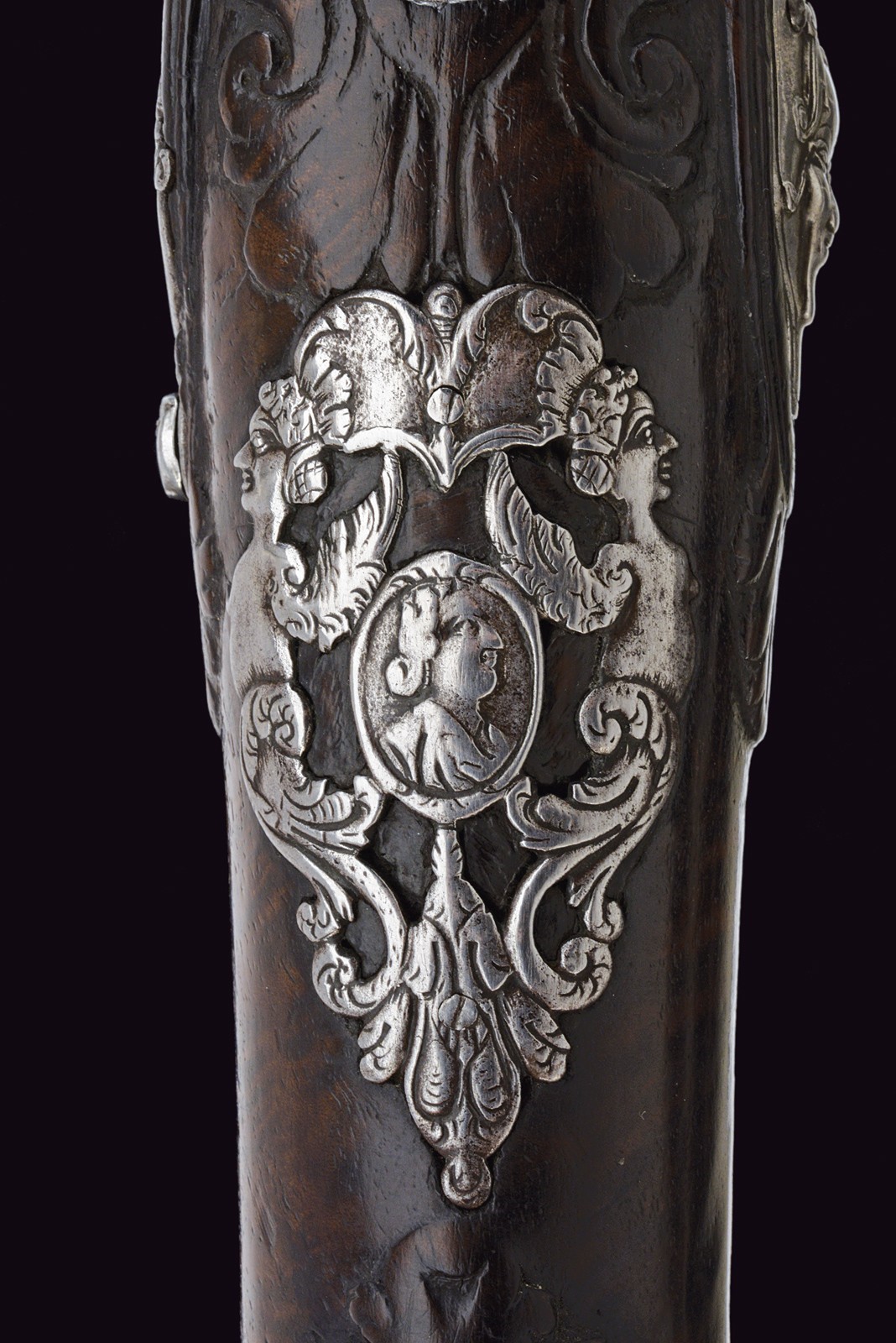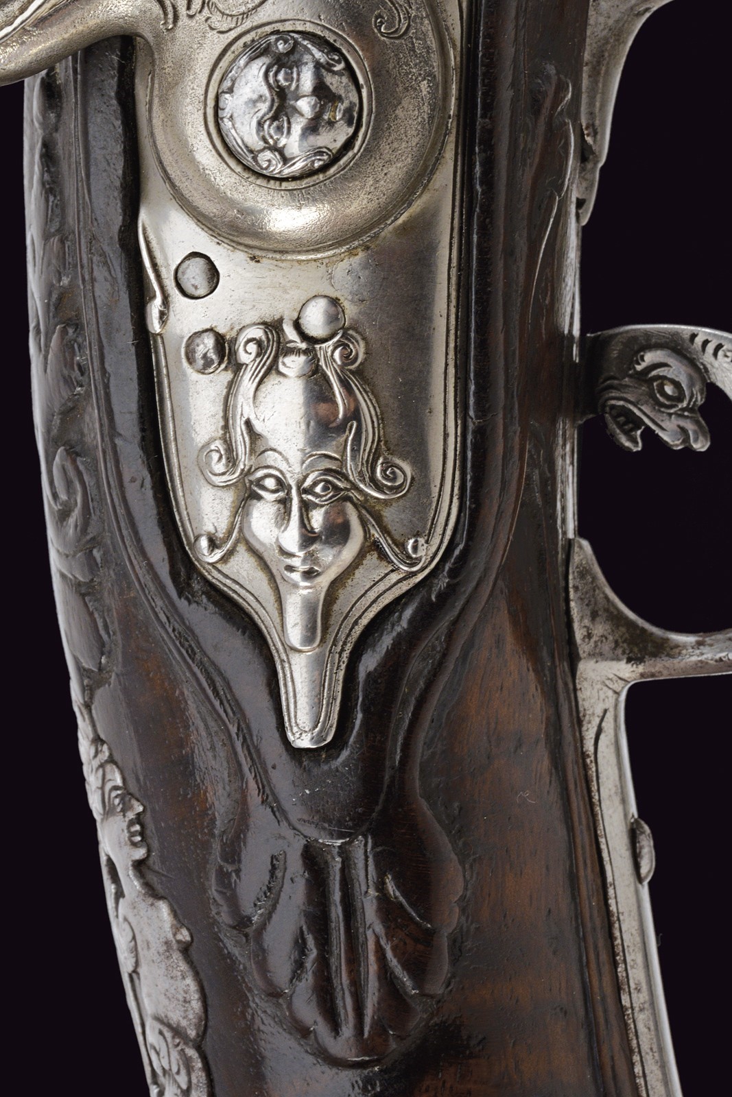 Smoothbore, 15 mm cal barrel, square in shape along its entire length, the powder chamber decorated with rings and a bas-relief carving depicting an anthropomorphic figure smoking a pipe; a little further on, the signature ‘DOMENICO BONOMINO’ in capital letters, among simple floral motifs. The barrel is decorated with two beautiful embossed silver mounts, carved and finely chiselled with floral scrolls, the first with a rear sight and the second with a high-relief mask in relief; the top with a moulded muzzle, the rear part of which is shaped like lilies. Tang engraved with flowers. Beautiful snaphaunce flintlock, plate engraved in the centre and on the neck of the hammer with floral scrolls, the tang and the cover of the hammer screw with a mask carved in bas-relief, elegant hammer handle decorated with curls; sliding pan cover. Full walnut stock (small antique restoration to the frame) beautifully carved with sphinxes, snakes and scrolls in bas-relief, carved and openwork iron mounts. Original, iron-tipped wooden ramrod.