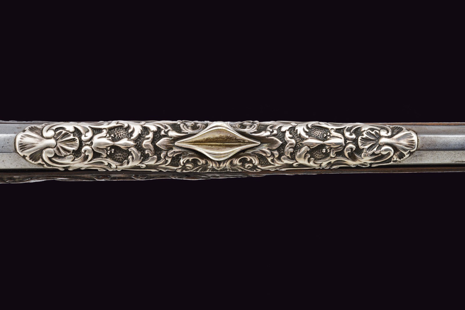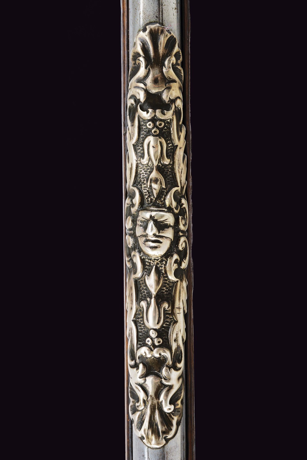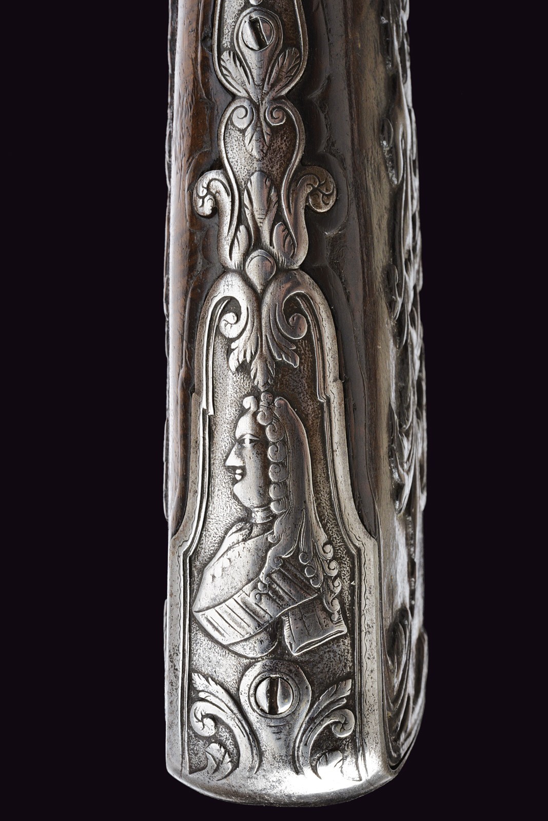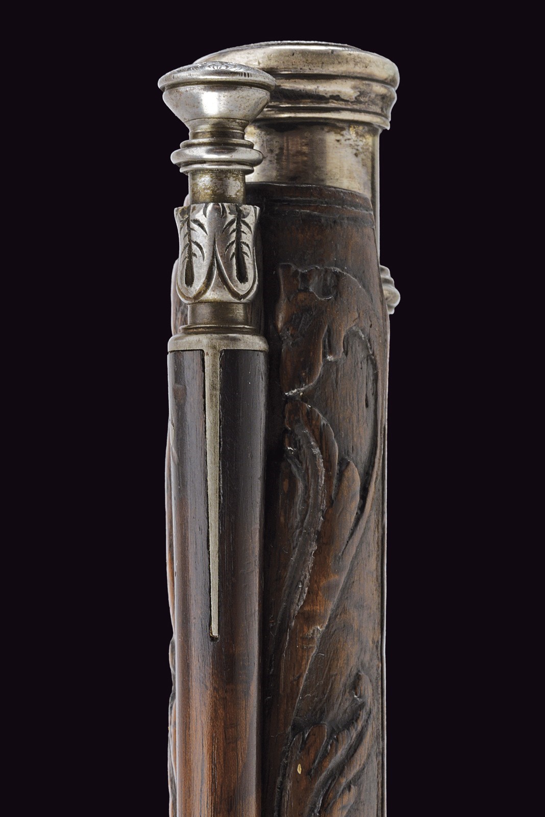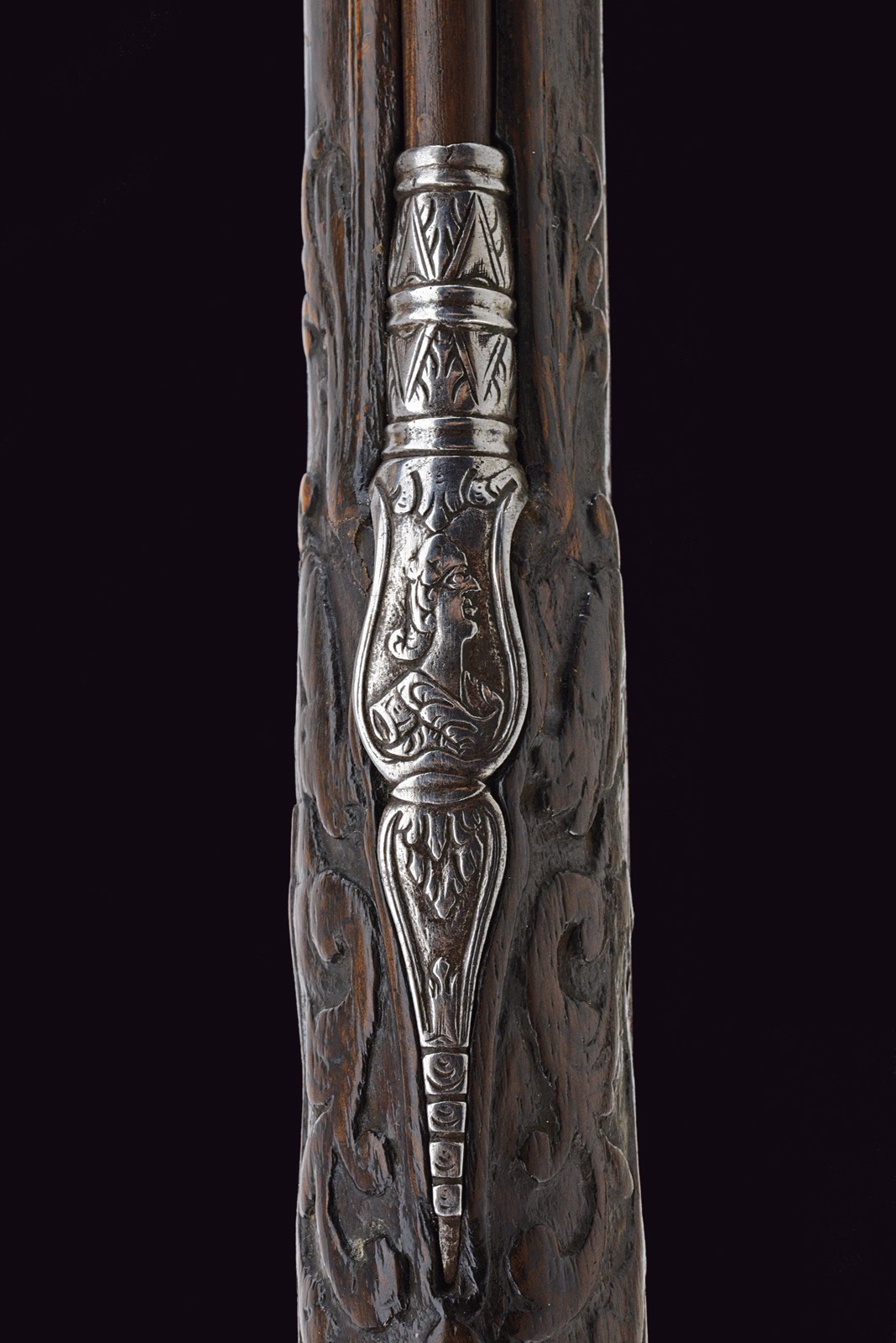 Smoothbore, 15 mm cal barrel, square in shape along its entire length, the powder chamber decorated with rings and a bas-relief carving depicting an anthropomorphic figure smoking a pipe; a little further on, the signature ‘DOMENICO BONOMINO’ in capital letters, among simple floral motifs. The barrel is decorated with two beautiful embossed silver mounts, carved and finely chiselled with floral scrolls, the first with a rear sight and the second with a high-relief mask in relief; the top with a moulded muzzle, the rear part of which is shaped like lilies. Tang engraved with flowers. Beautiful snaphaunce flintlock, plate engraved in the centre and on the neck of the hammer with floral scrolls, the tang and the cover of the hammer screw with a mask carved in bas-relief, elegant hammer handle decorated with curls; sliding pan cover. Full walnut stock (small antique restoration to the frame) beautifully carved with sphinxes, snakes and scrolls in bas-relief, carved and openwork iron mounts. Original, iron-tipped wooden ramrod.