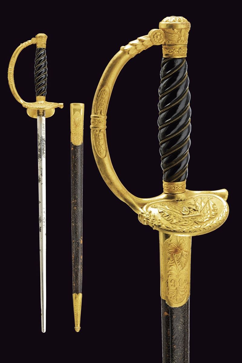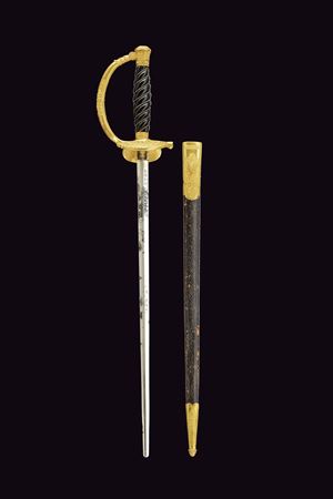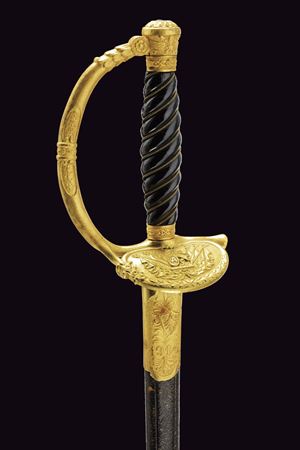 Straight blade without tip, of lozenge section, with the inscription "LA DURANDAL DU ROT ALBERT" at the base and tang marked "JONSON & Co BRUXSELLES". Remarkable gilt brass hilt, asymmetrical shell-guards of different sizes; the one on the right side with a lion in relief between flags, the other with a bust and helmet between cannons and laurel and oak fronds. Lacquered wooden grip with spiral structure, complete with metal wire binding; finely crafted pommel decorated with palmettes, lightning bolts and floral motifs. Complete with leather-covered wooden scabbard with finely gilded brass mounts, the cap, engraved with floral motifs, also featuring the date "1914"; tip decorated en suite.