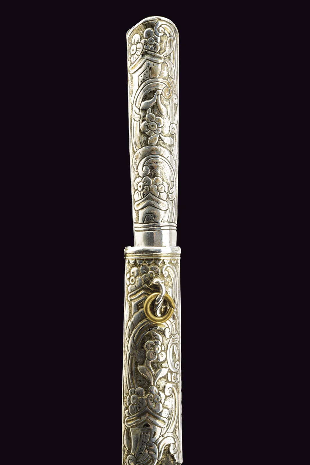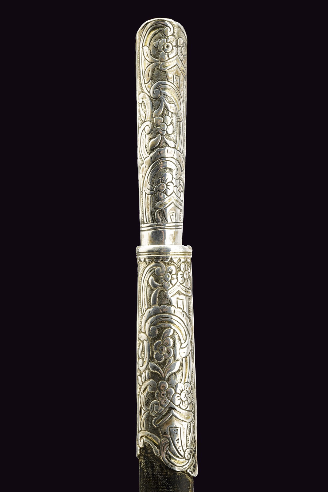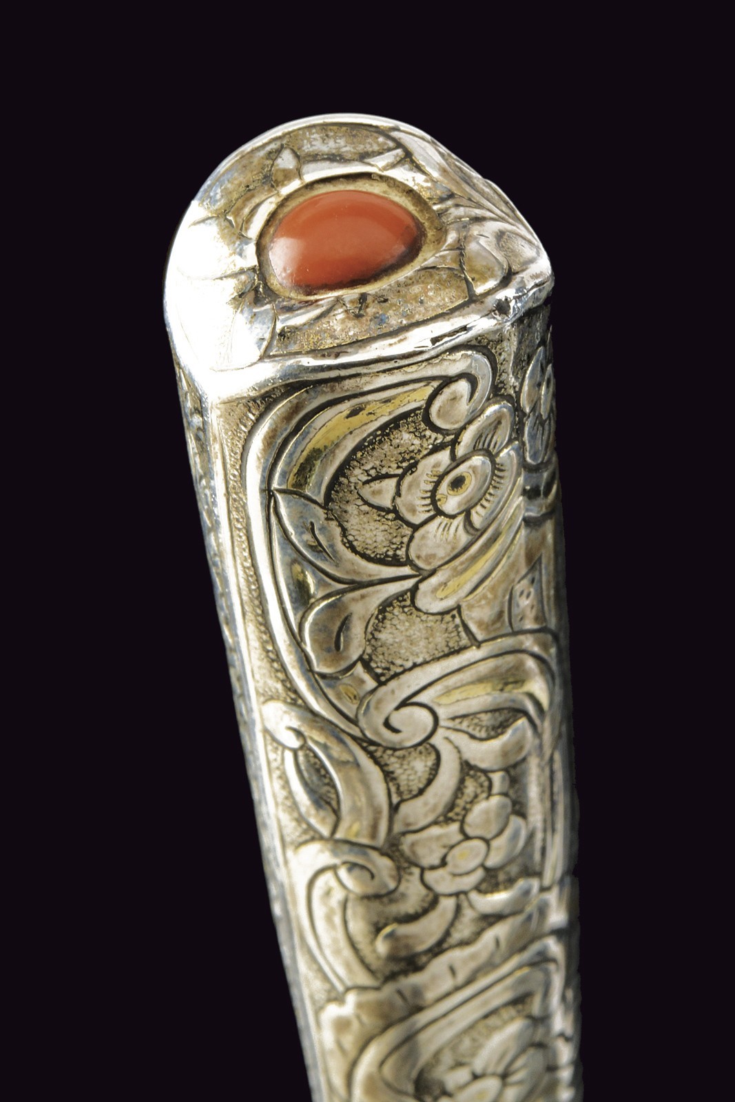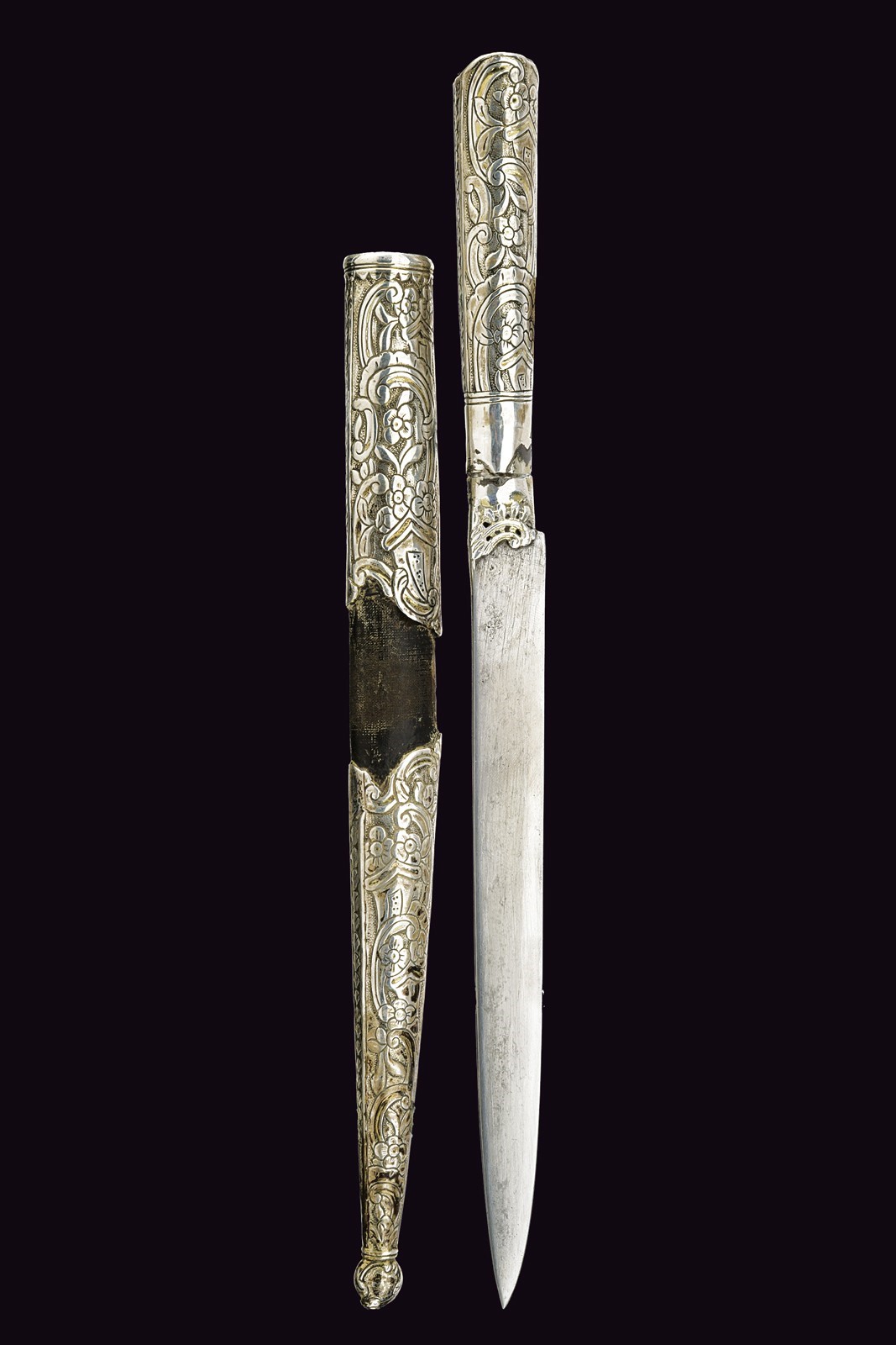 Straight, flat, single-edged blade. Grip covered with silver engraved with floral motifs, adorned with a light red stone at the top. Wooden scabbard covered with leather with silver mounts engraved en suite. Brass suspension ring.